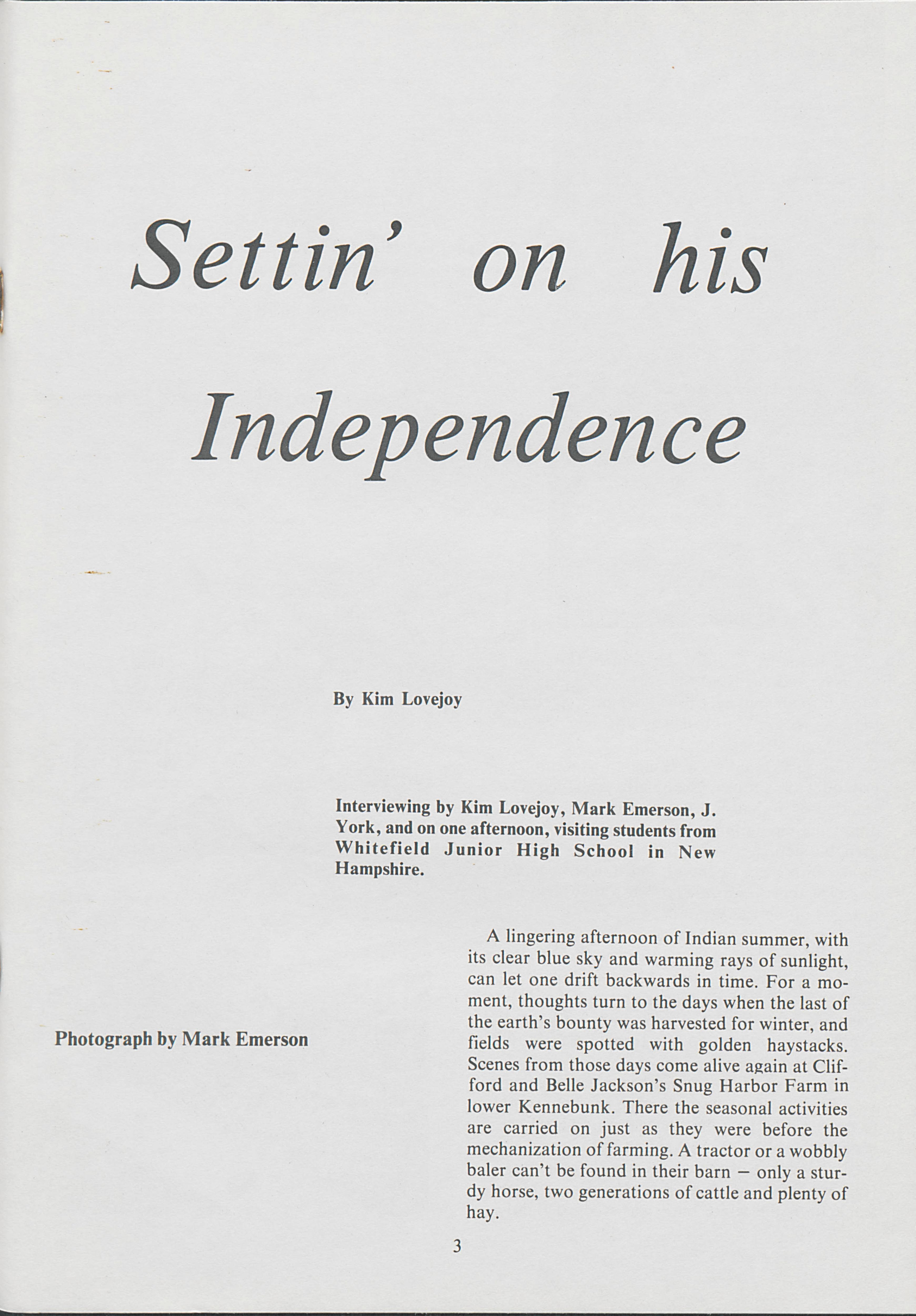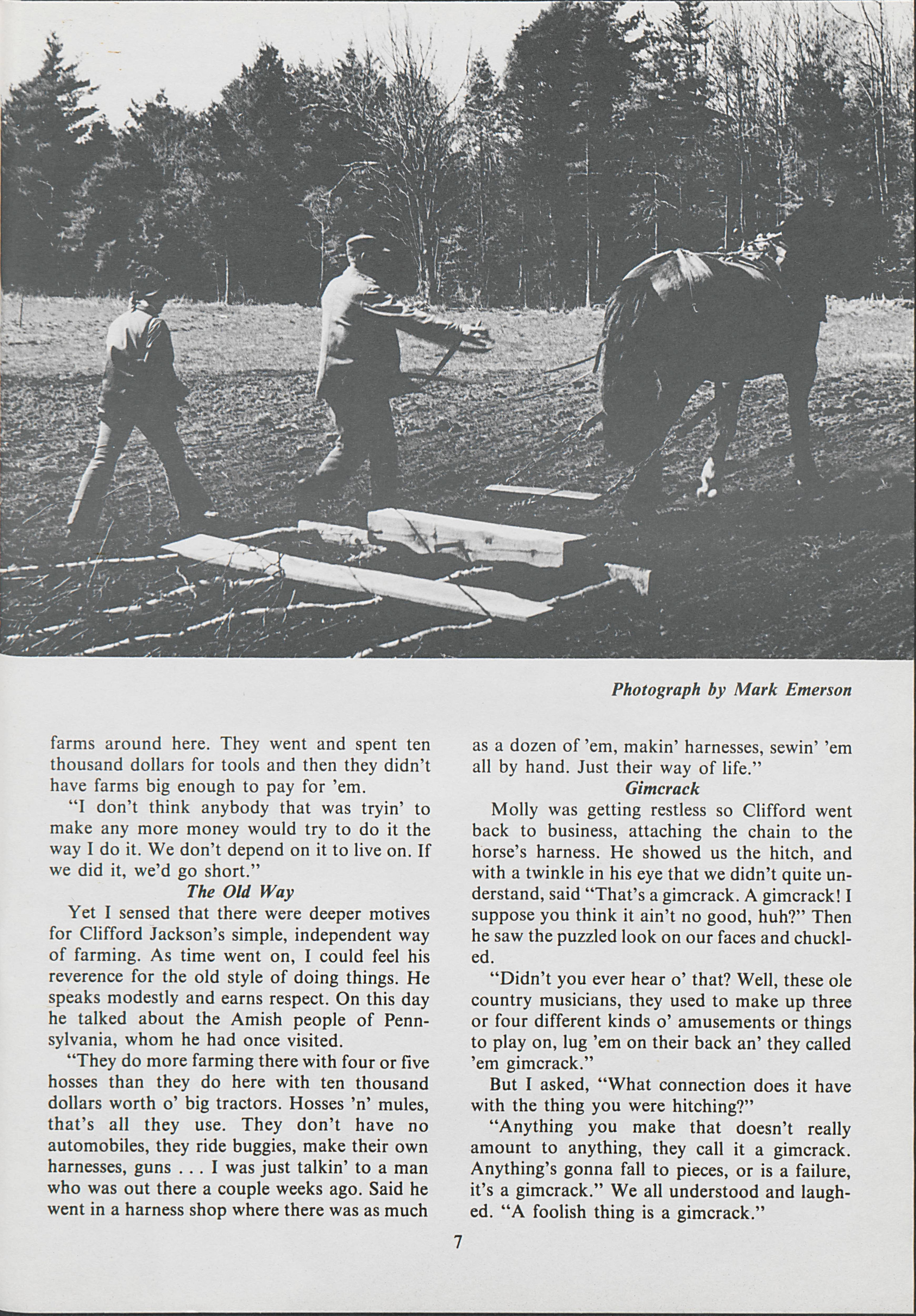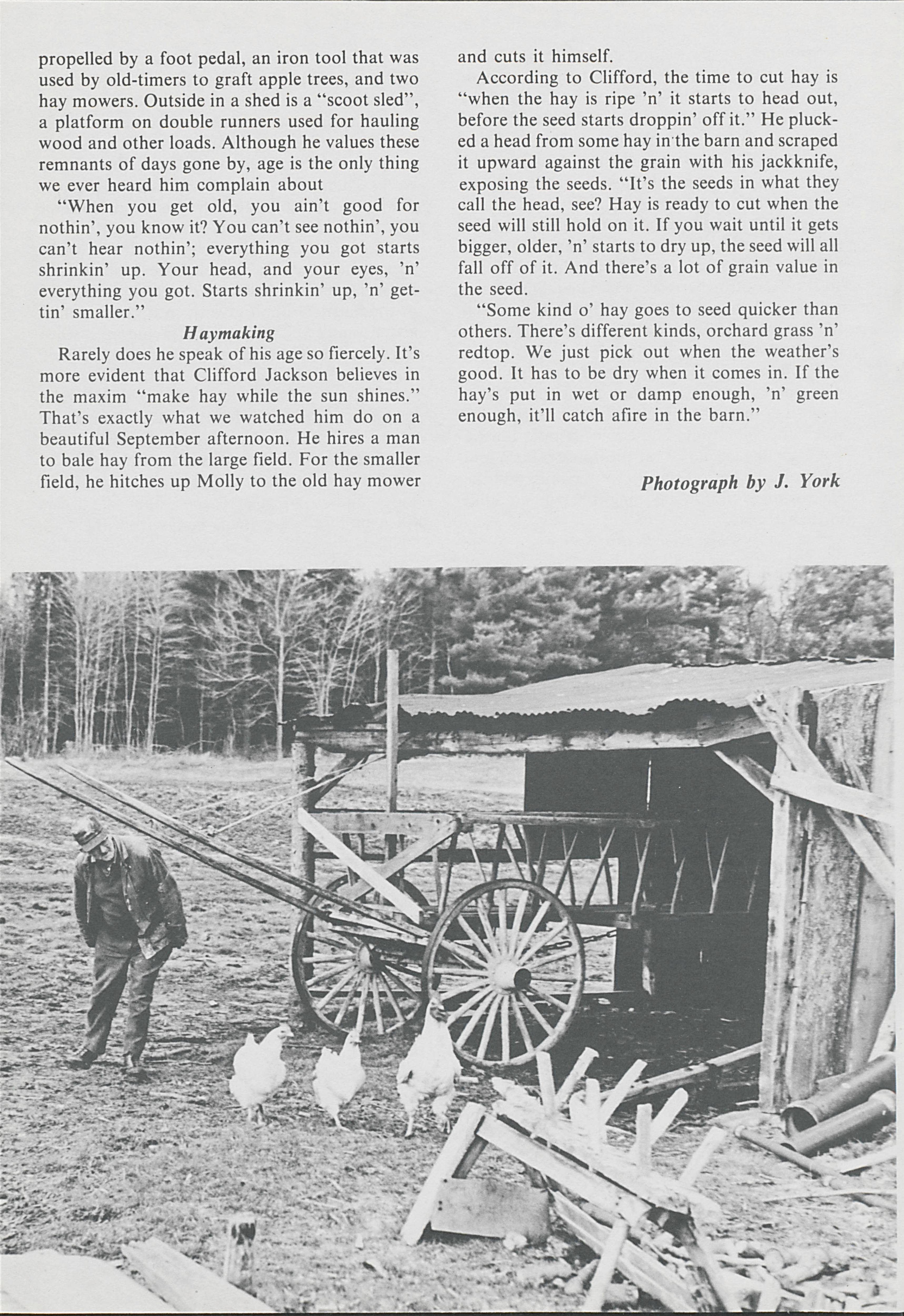 Following a tradition of farm work before mechanized farming, Clifford and Belle Jackson continue to farm the old way. Kim Lovejoy documents the activities that the Jackson's perform on their farm to retain old farming habits.