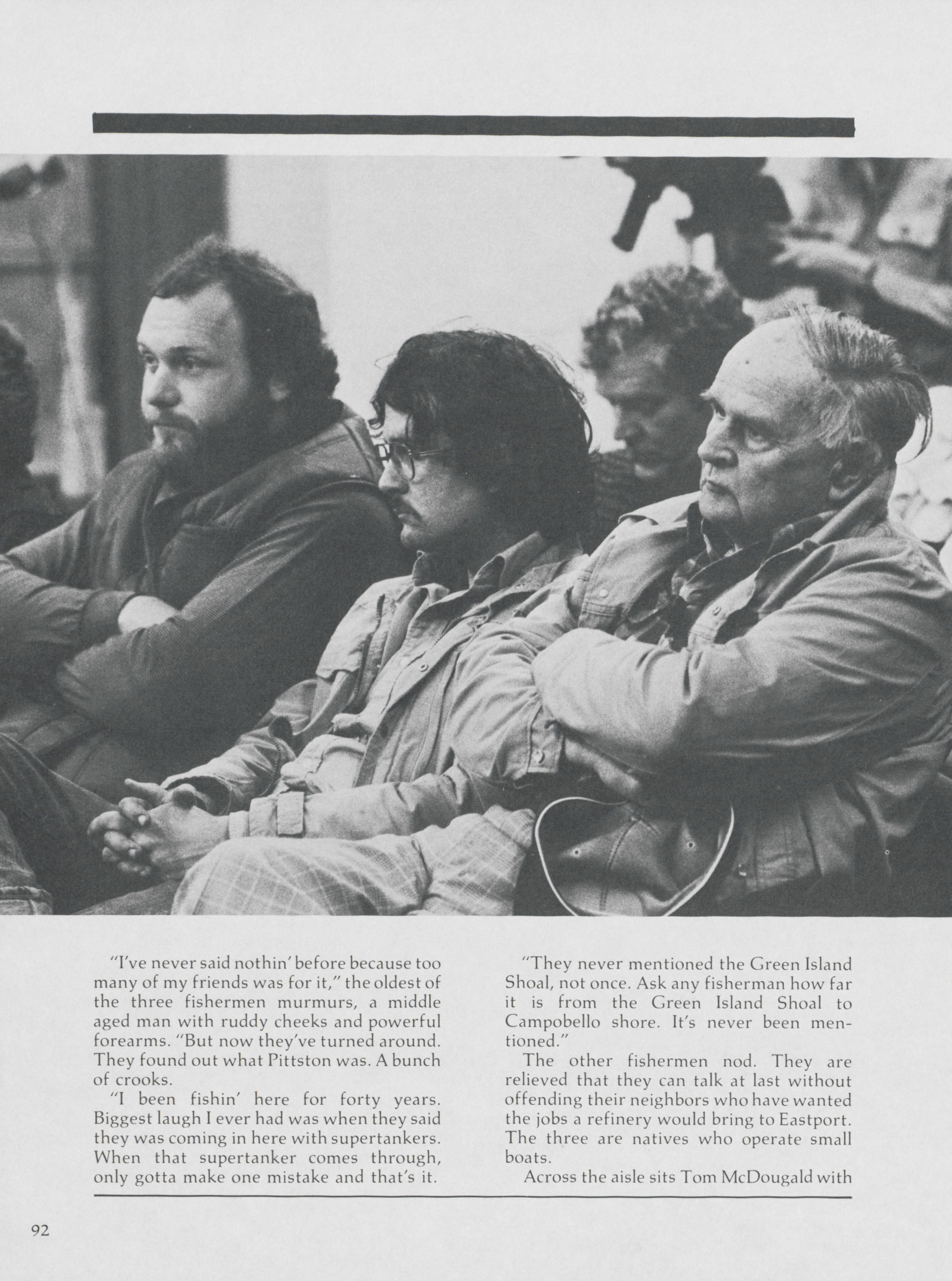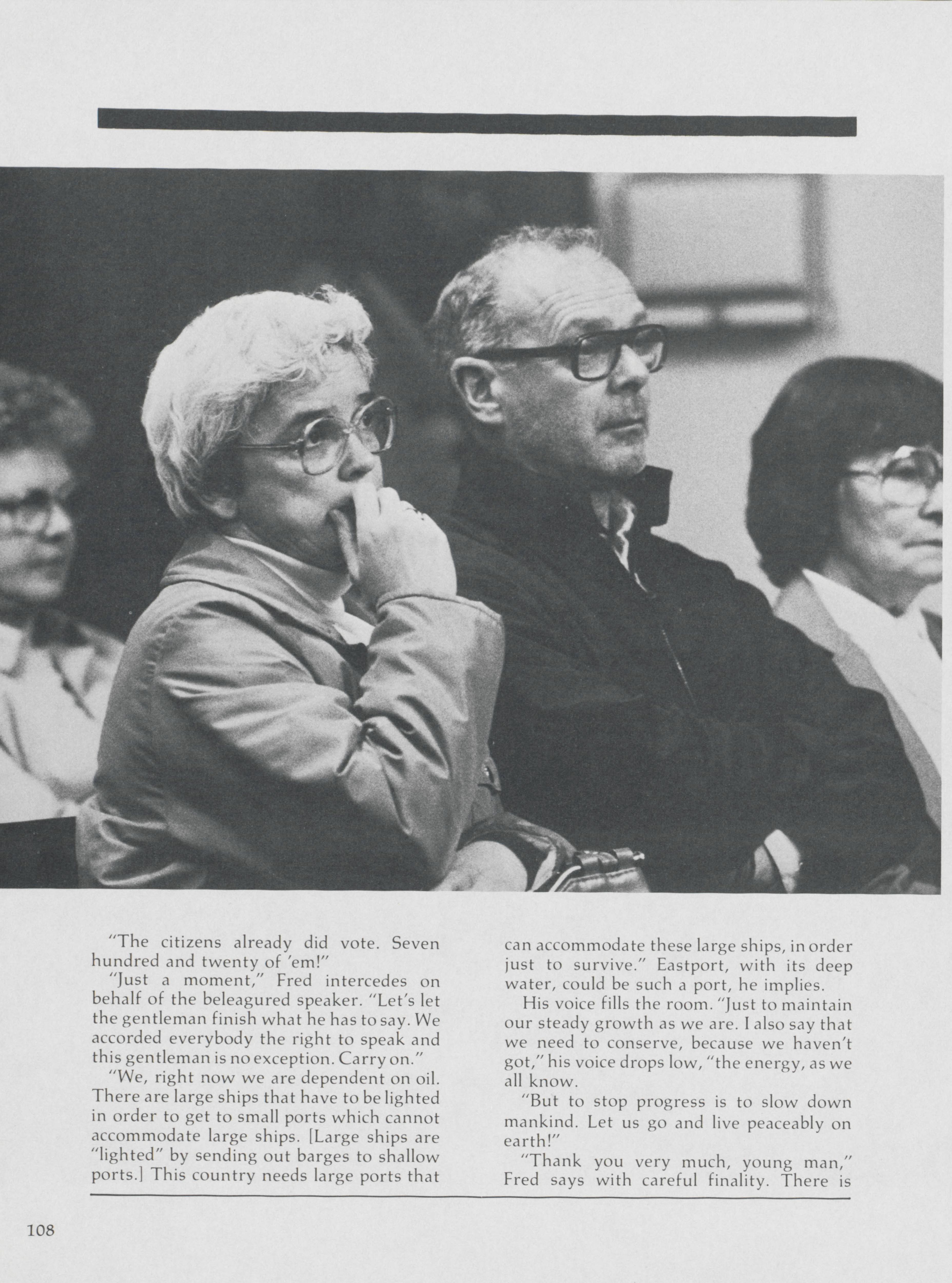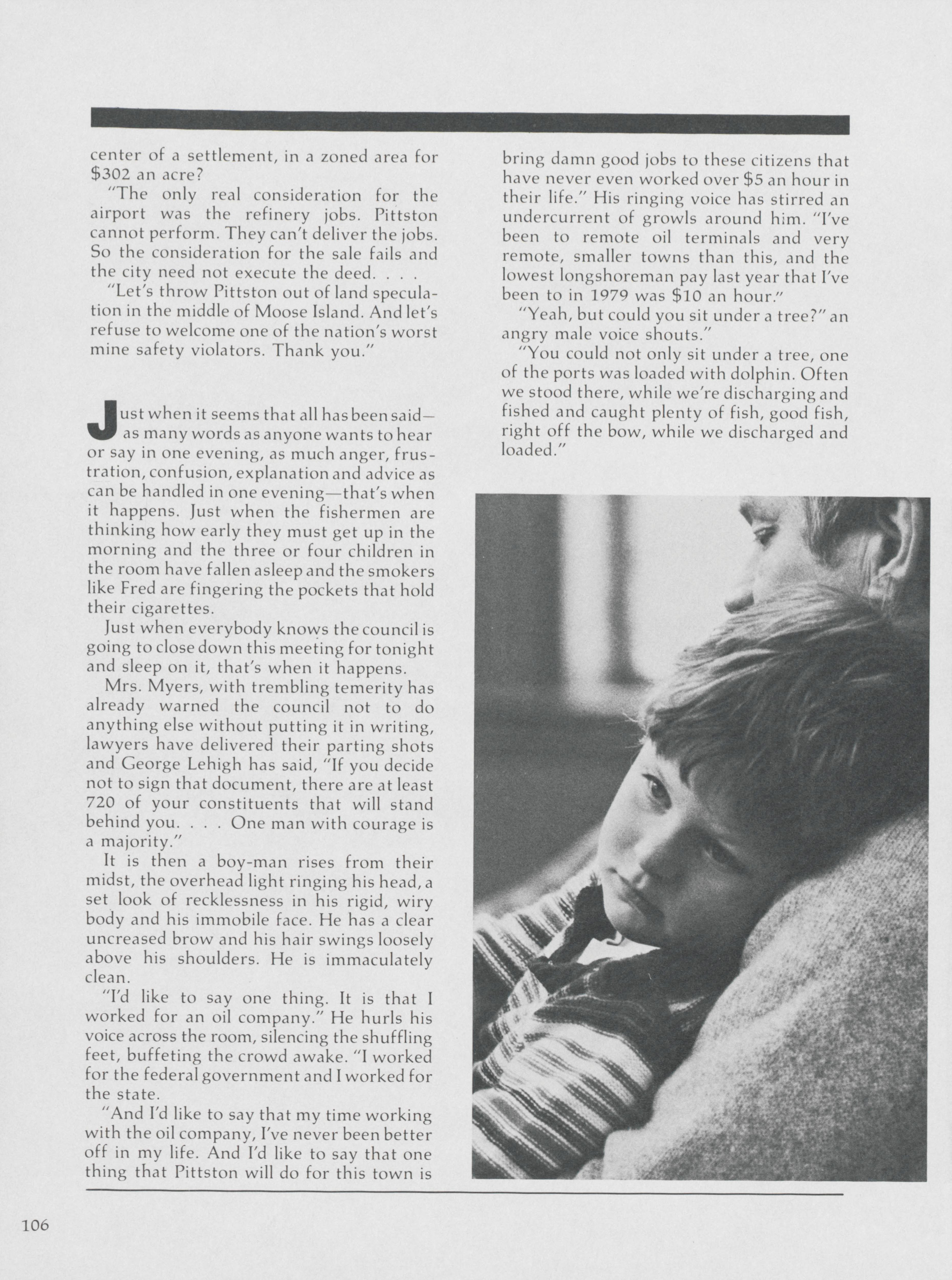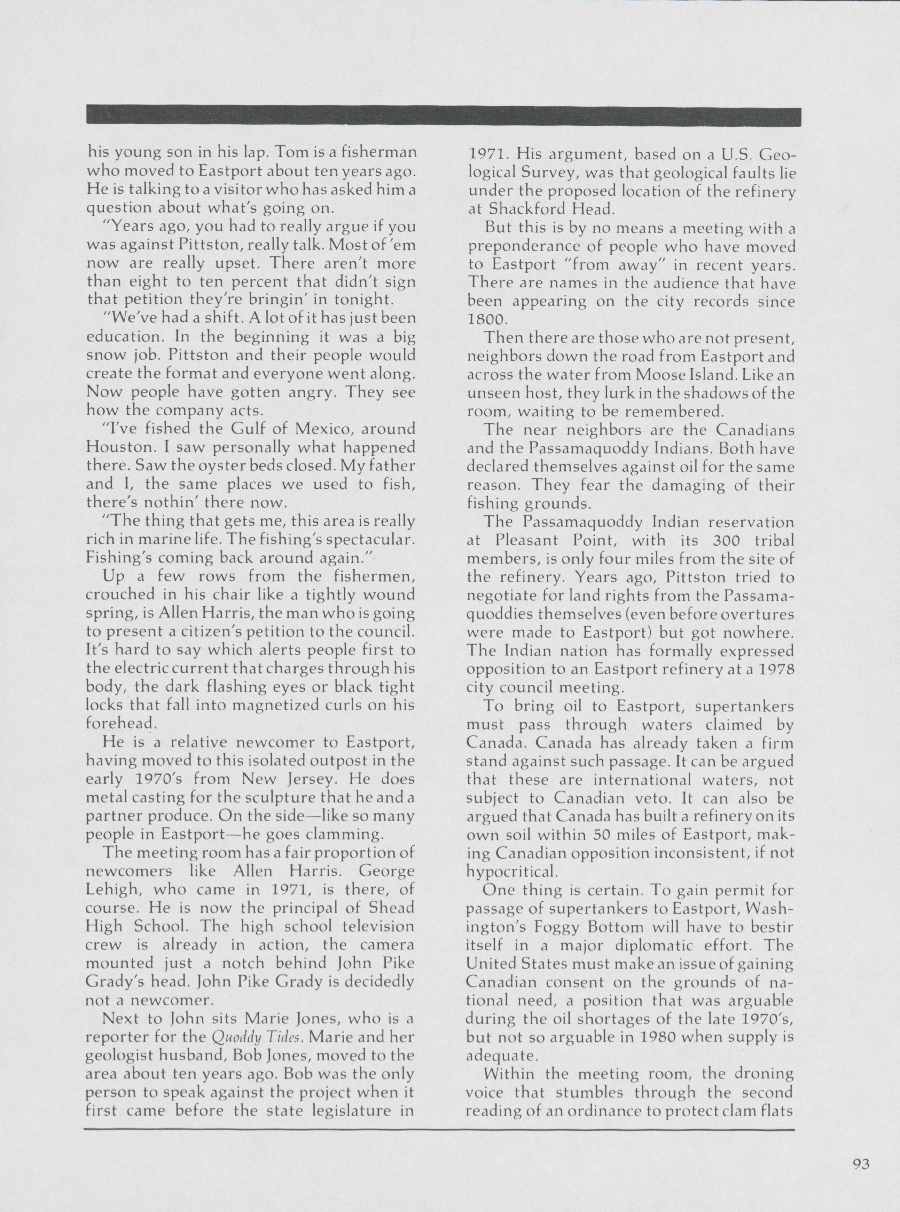 Coming together for a public meeting to discuss the Pittston Company, members of the community are at odds regarding their situation. Pamela Wood documents the tension regarding Eastport's civil war over oil.