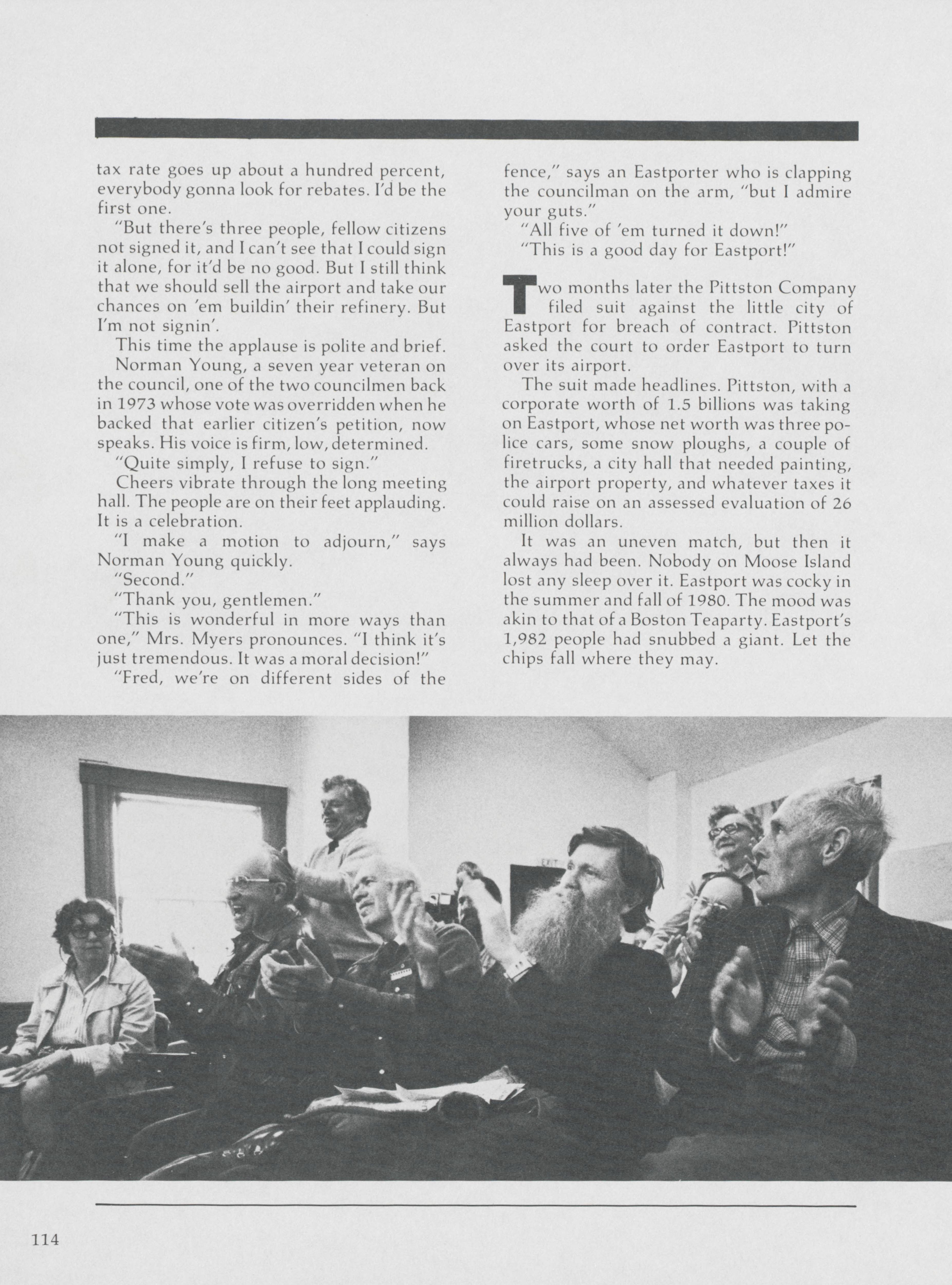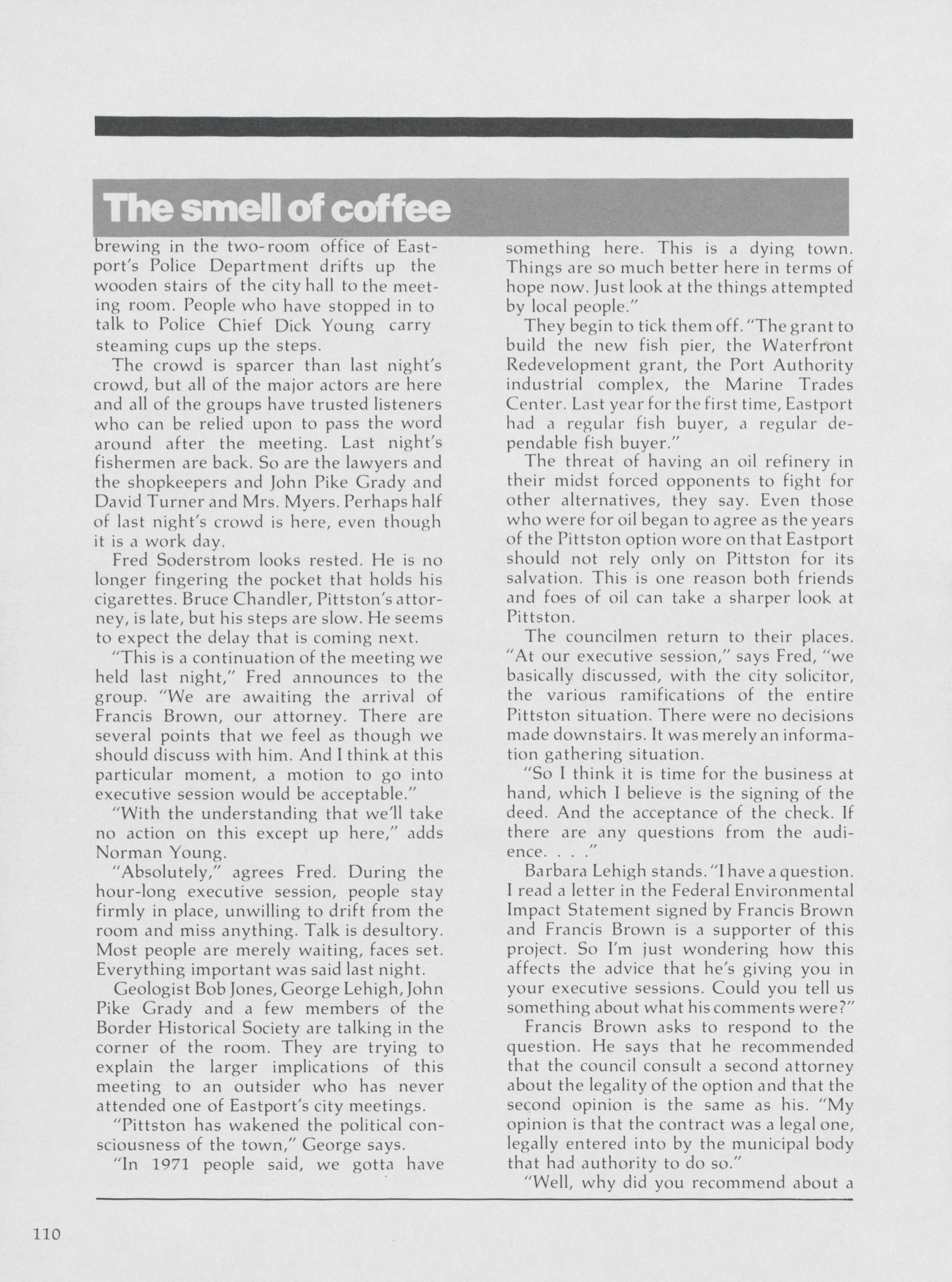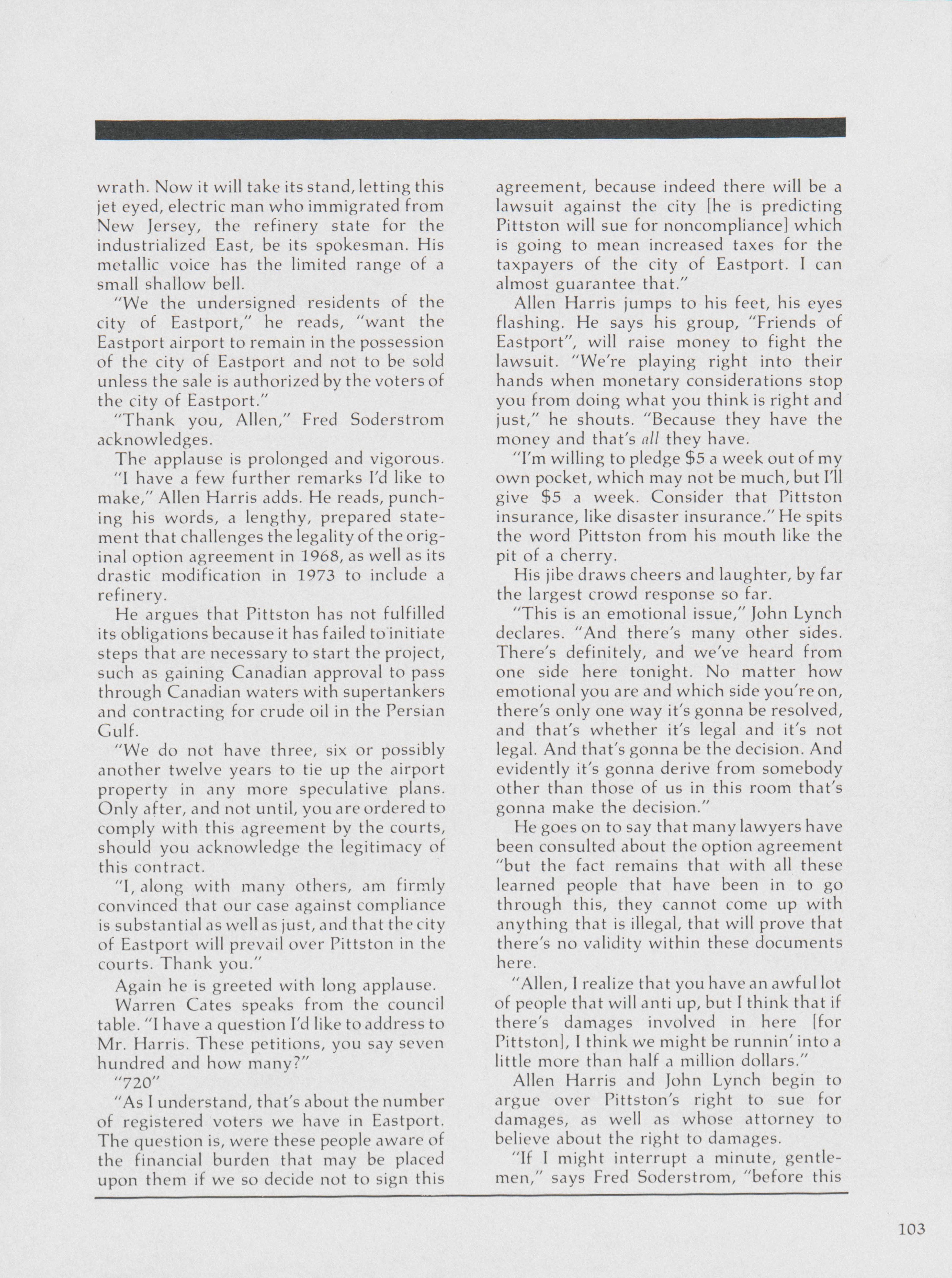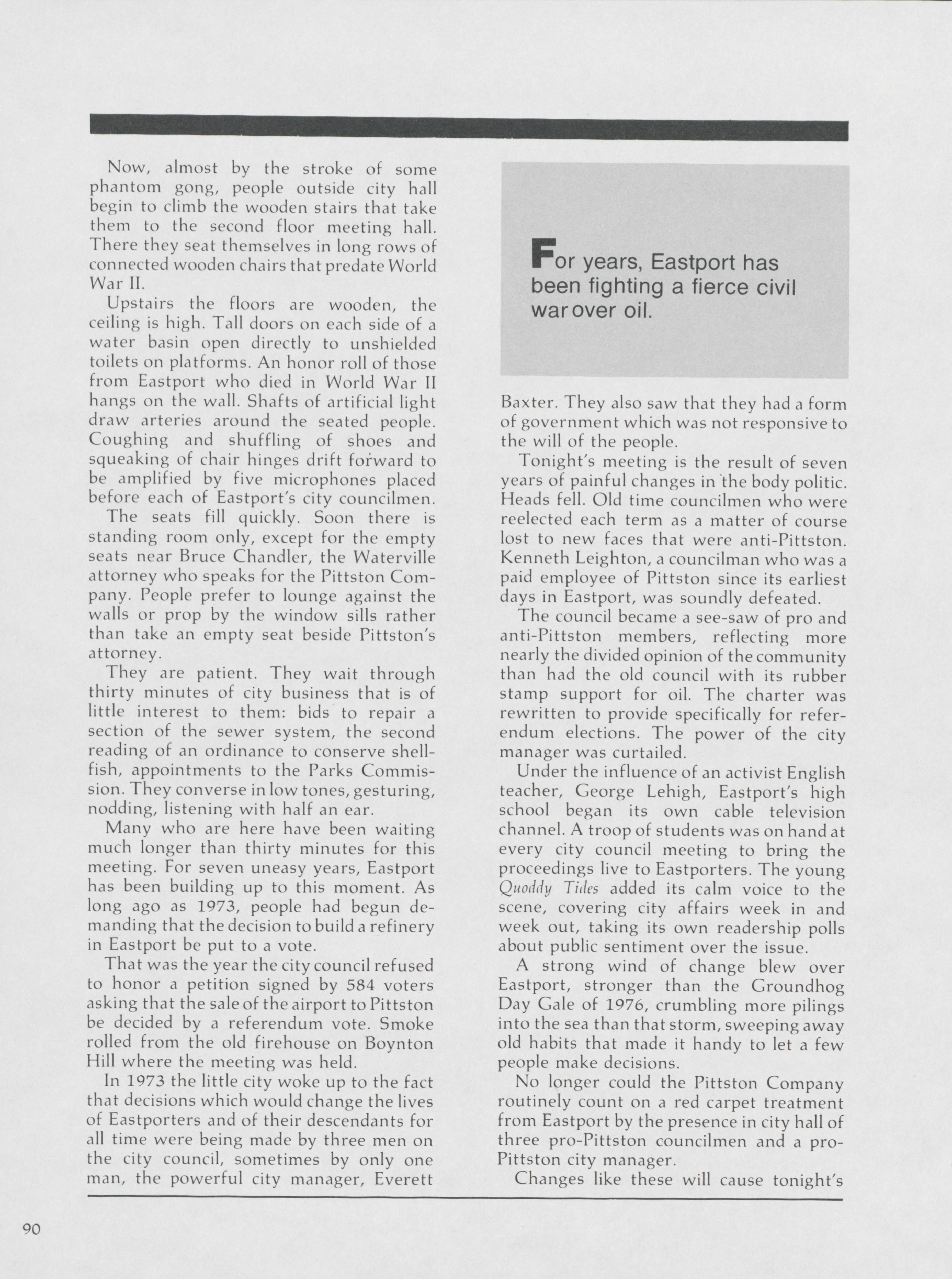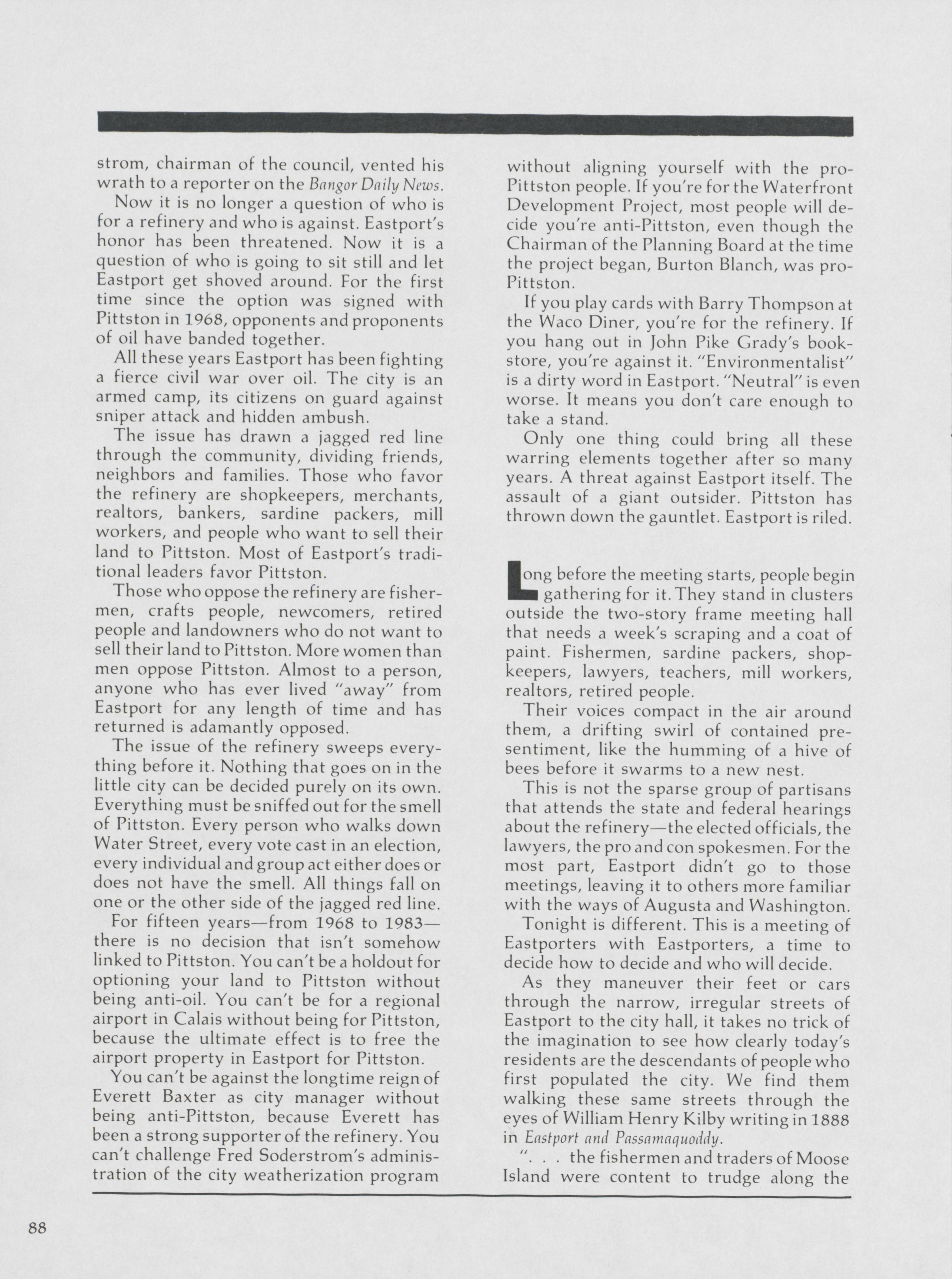 Coming together for a public meeting to discuss the Pittston Company, members of the community are at odds regarding their situation. Pamela Wood documents the tension regarding Eastport's civil war over oil.