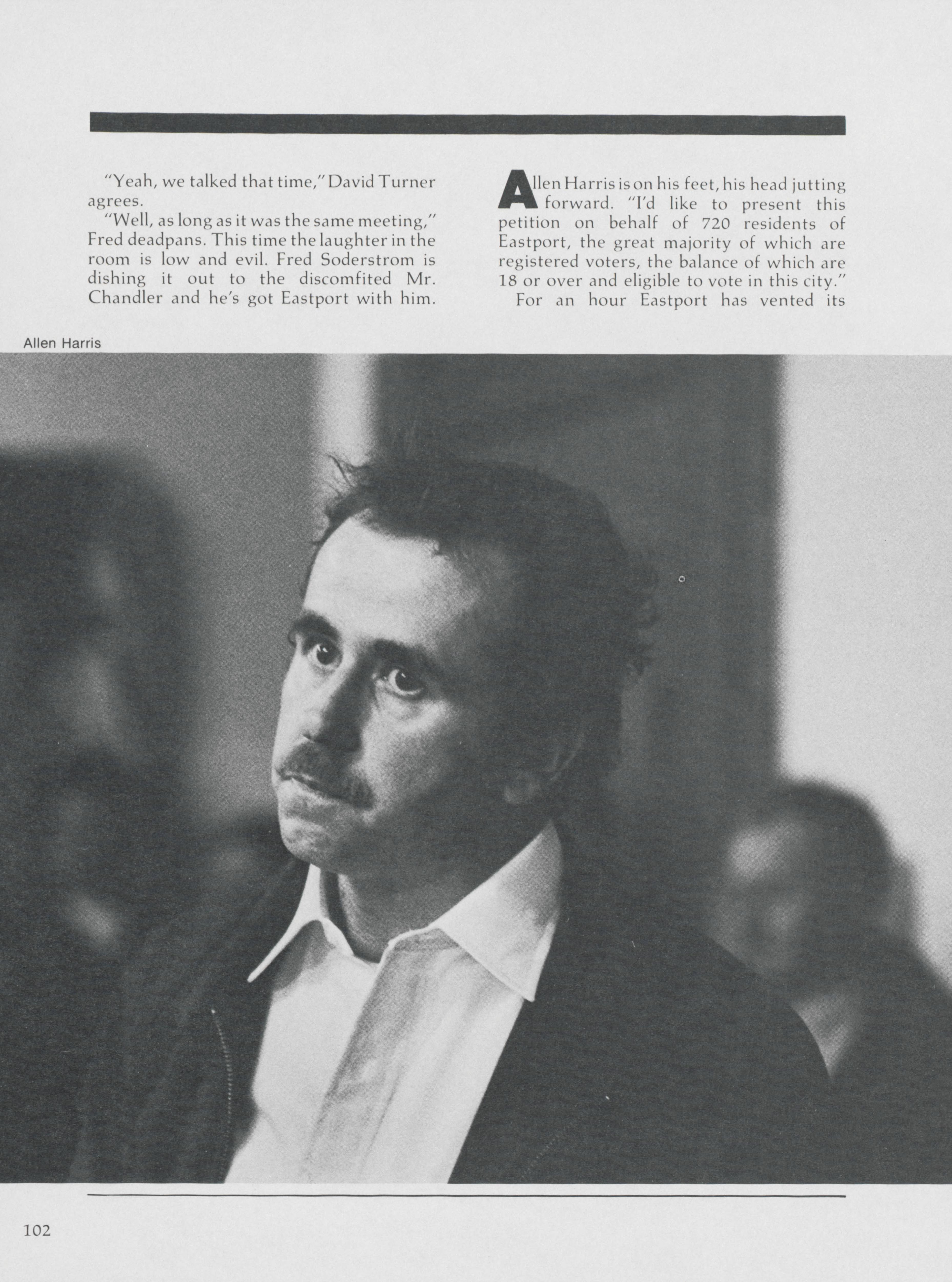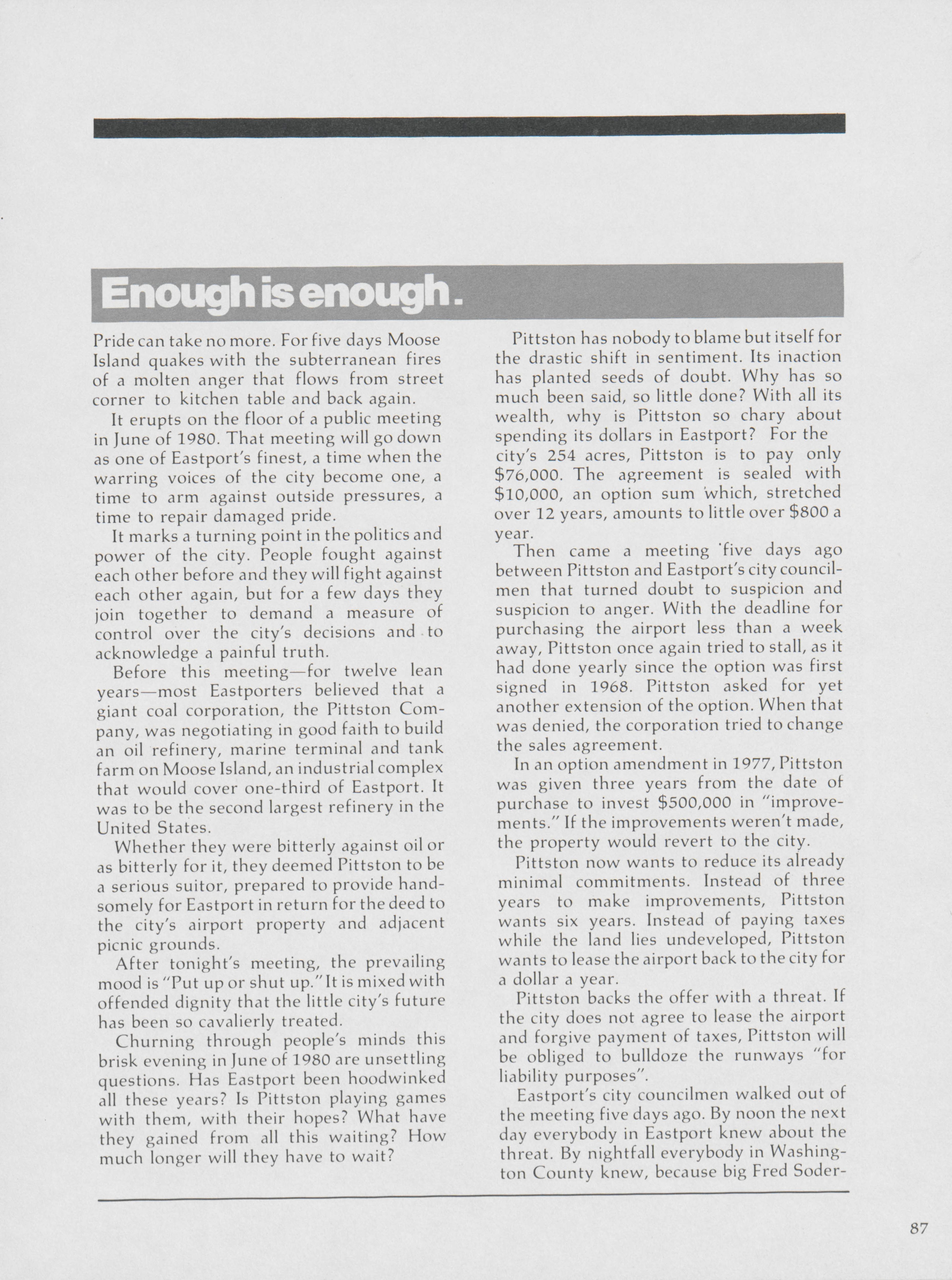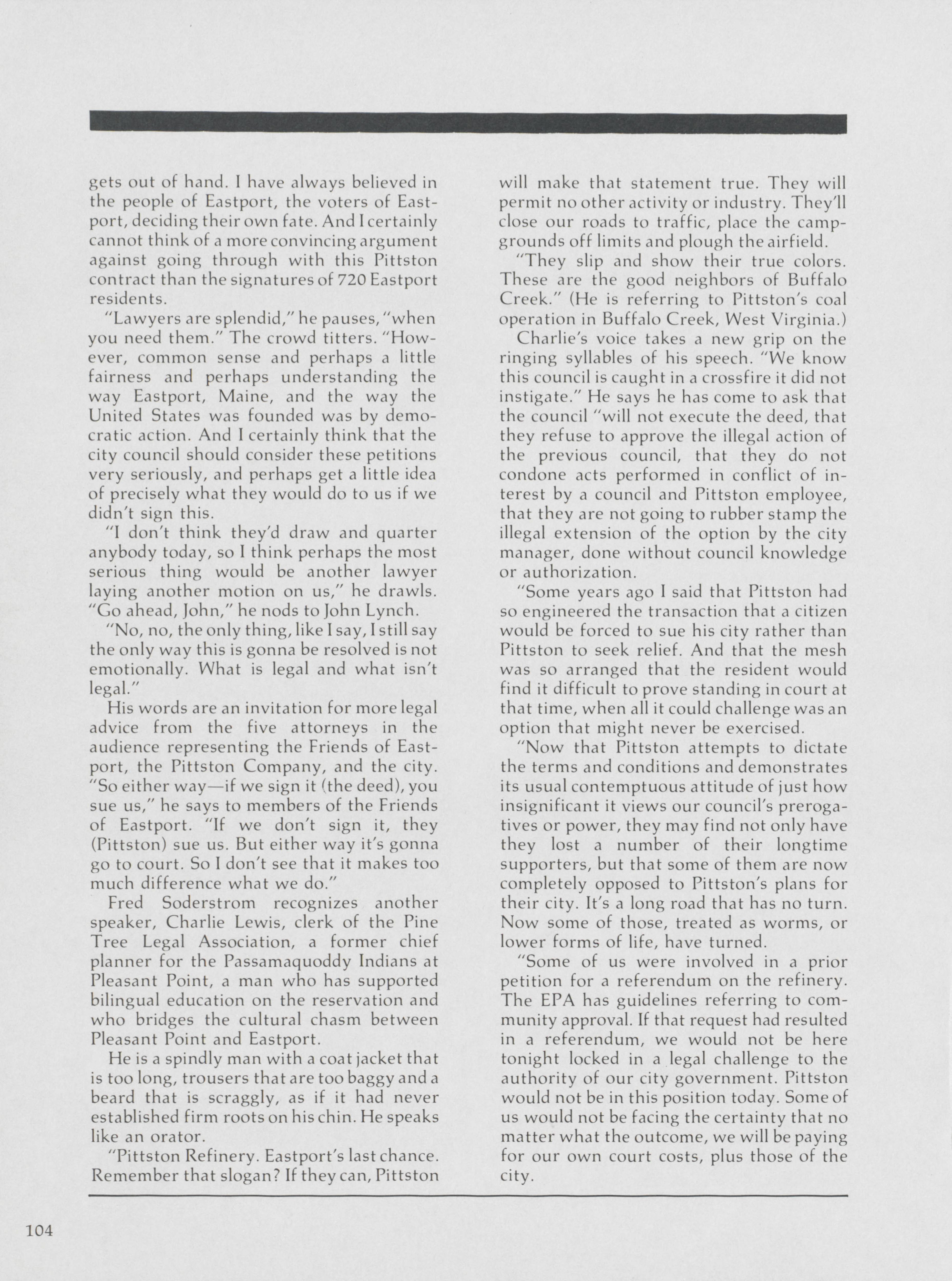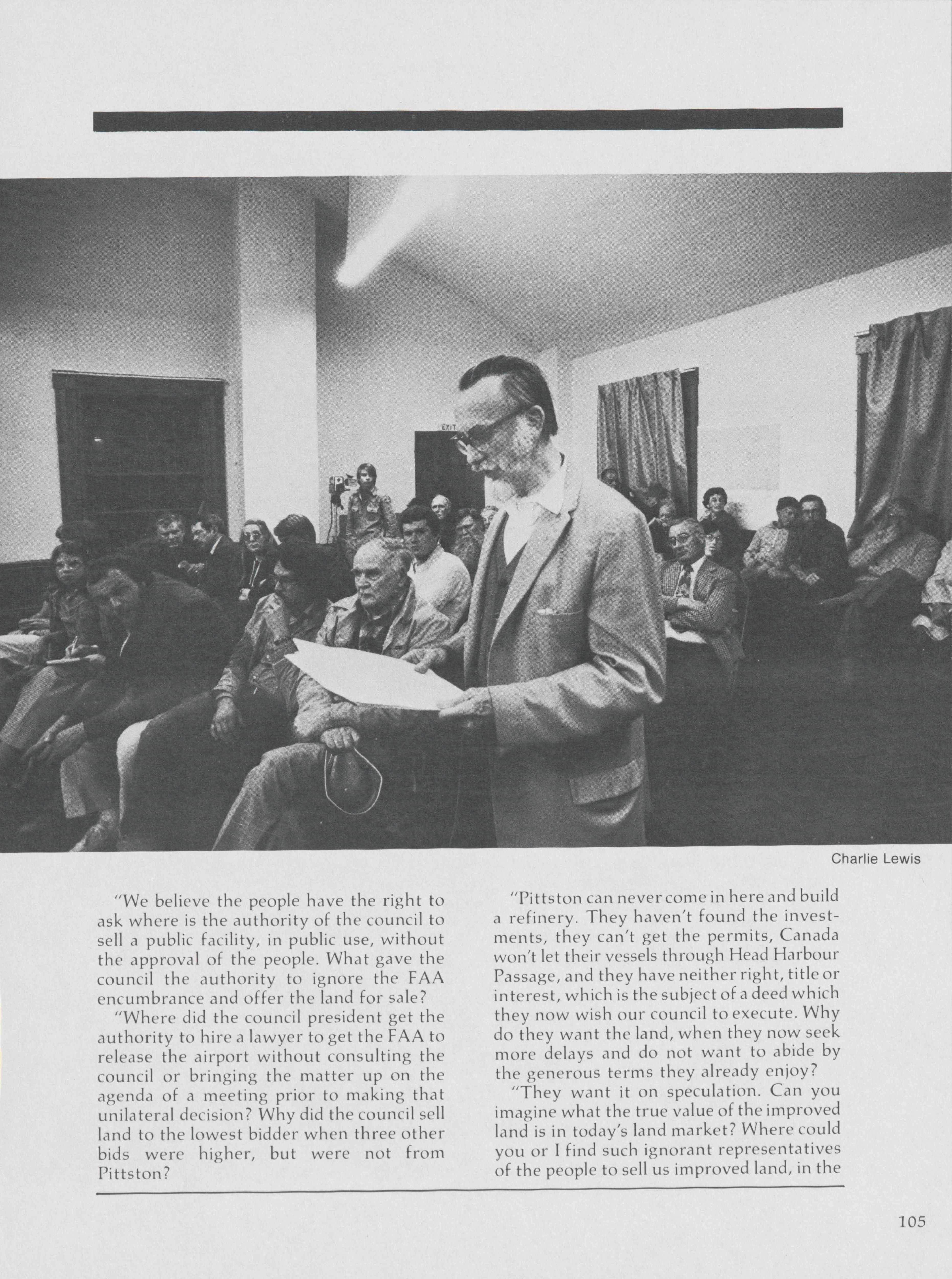 Coming together for a public meeting to discuss the Pittston Company, members of the community are at odds regarding their situation. Pamela Wood documents the tension regarding Eastport's civil war over oil.