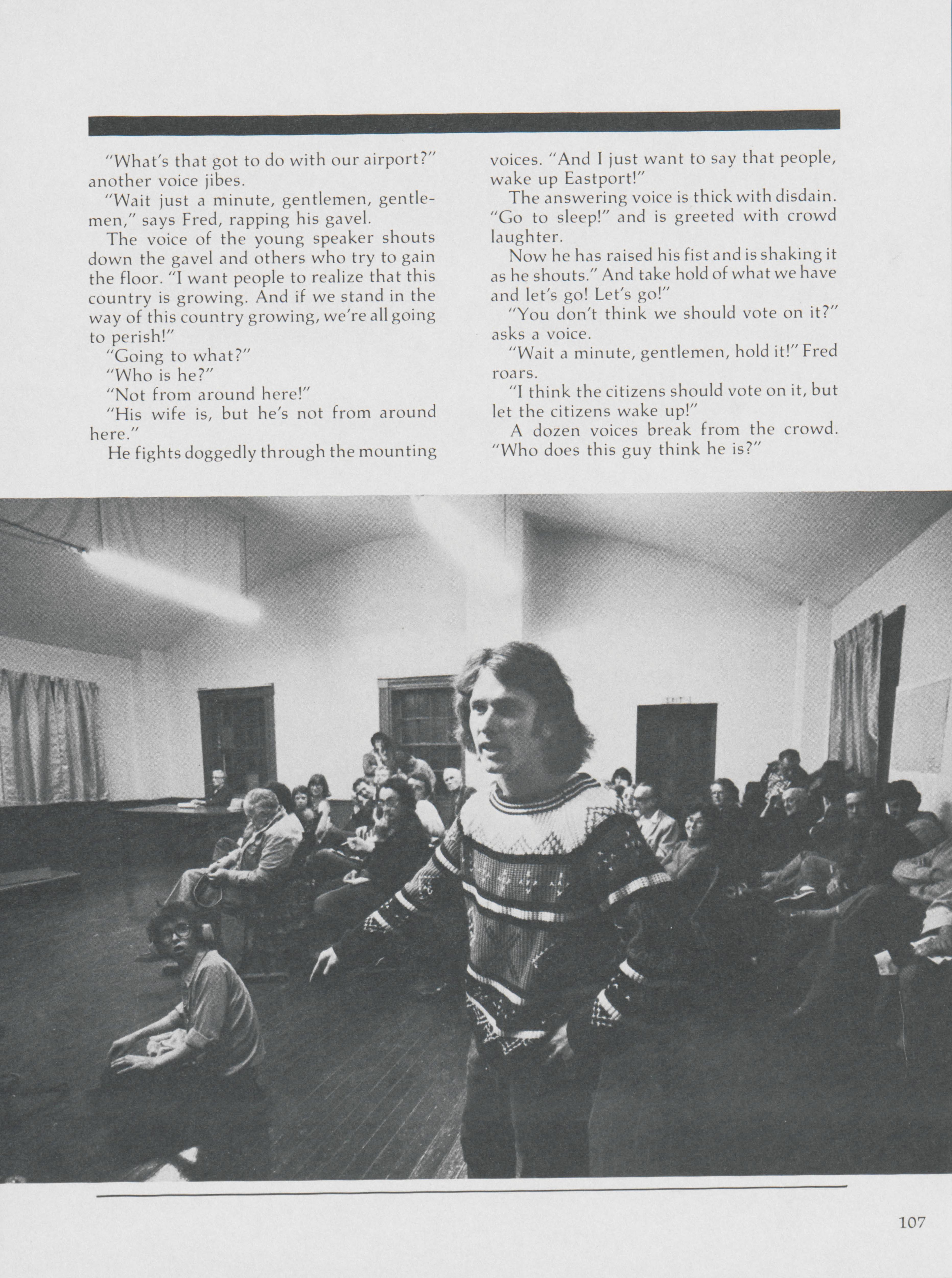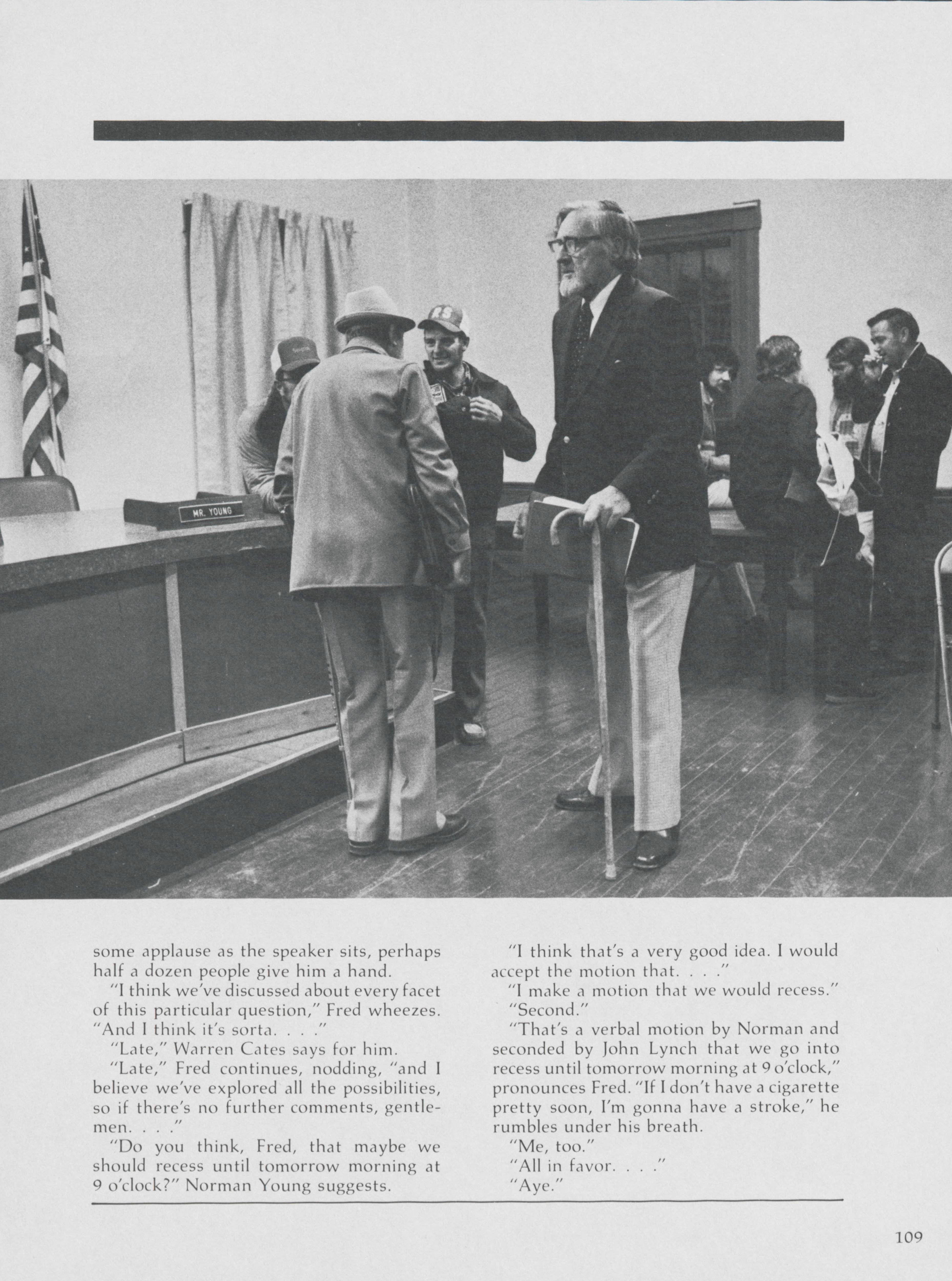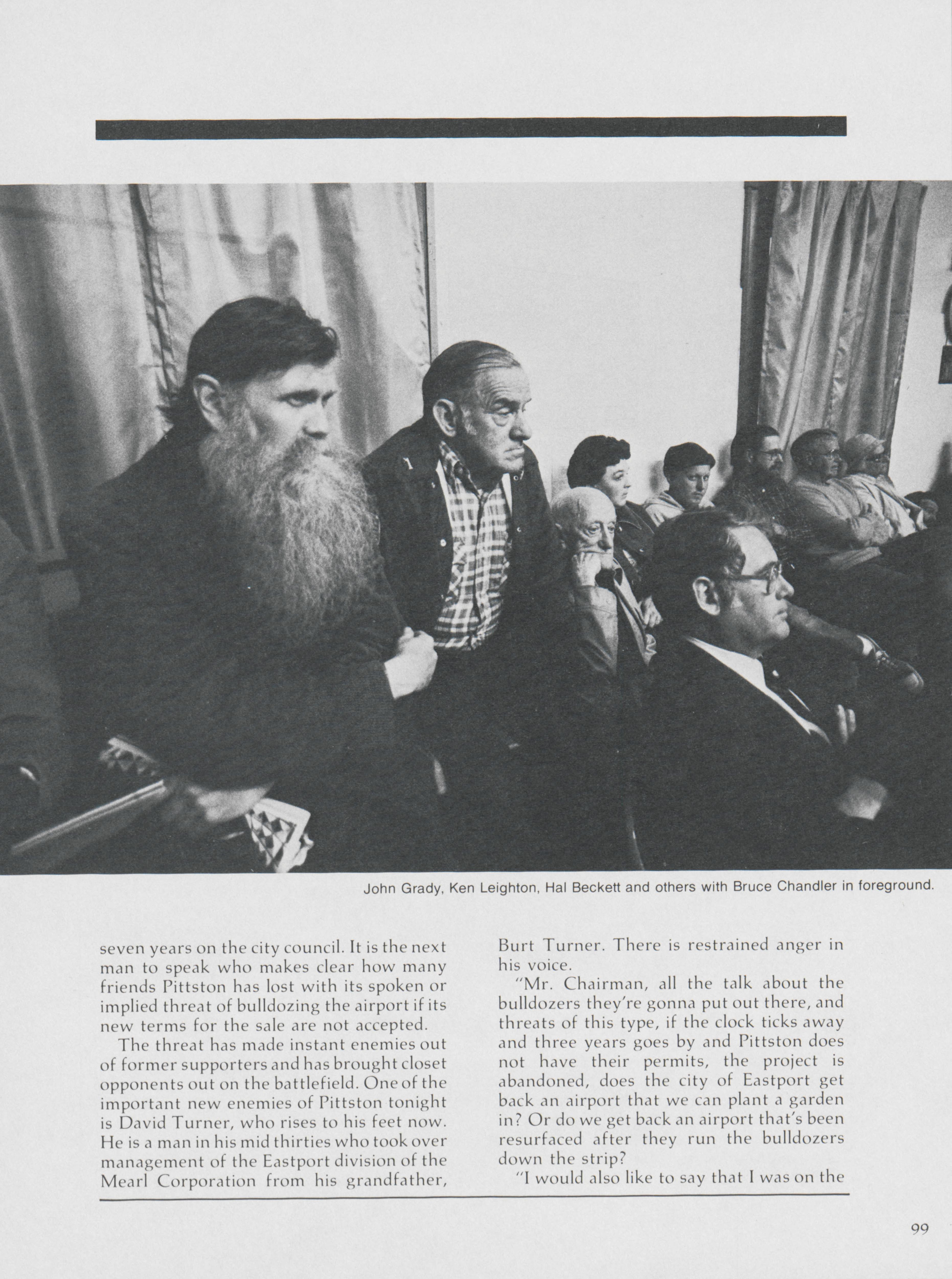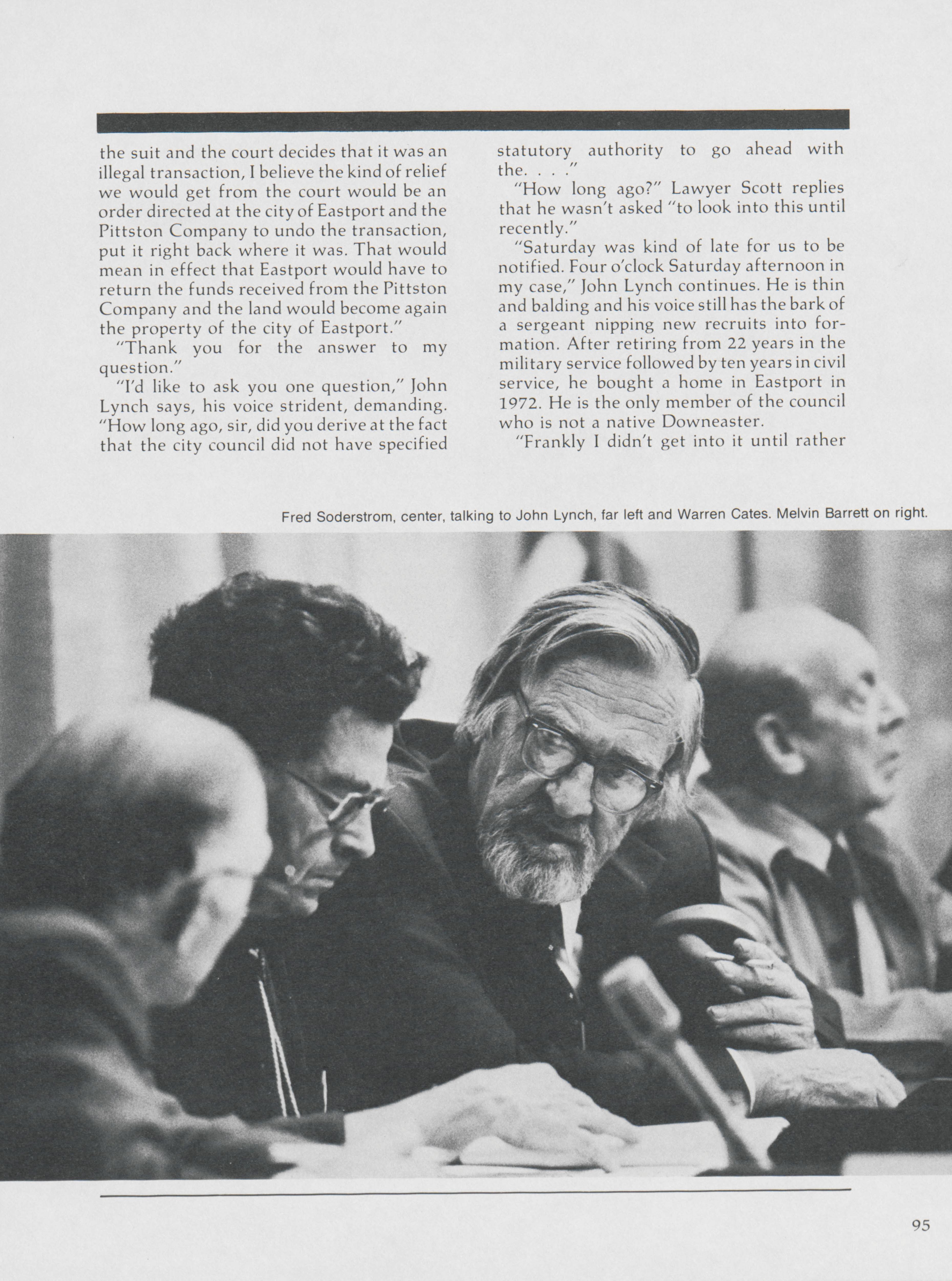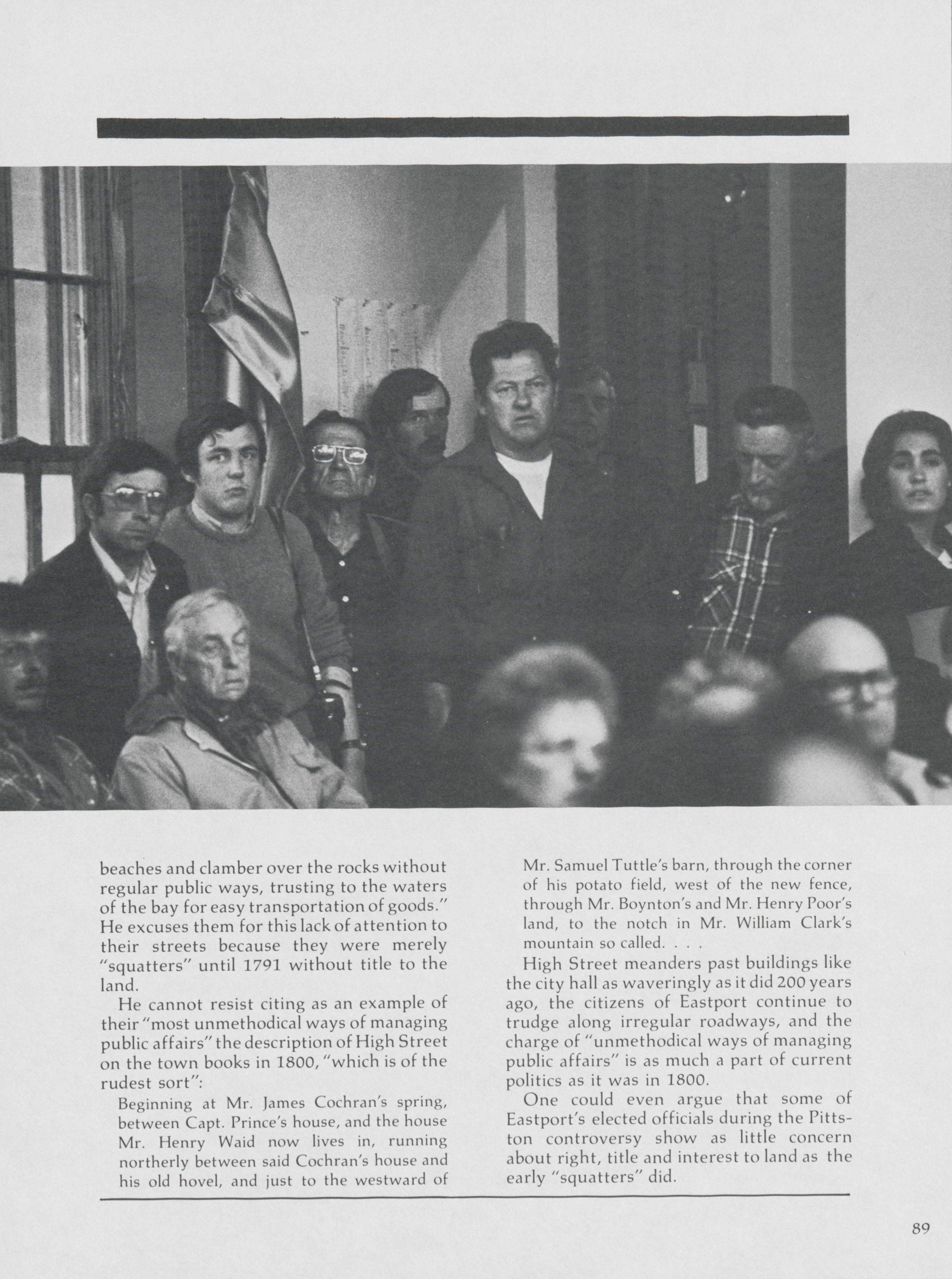 Coming together for a public meeting to discuss the Pittston Company, members of the community are at odds regarding their situation. Pamela Wood documents the tension regarding Eastport's civil war over oil.