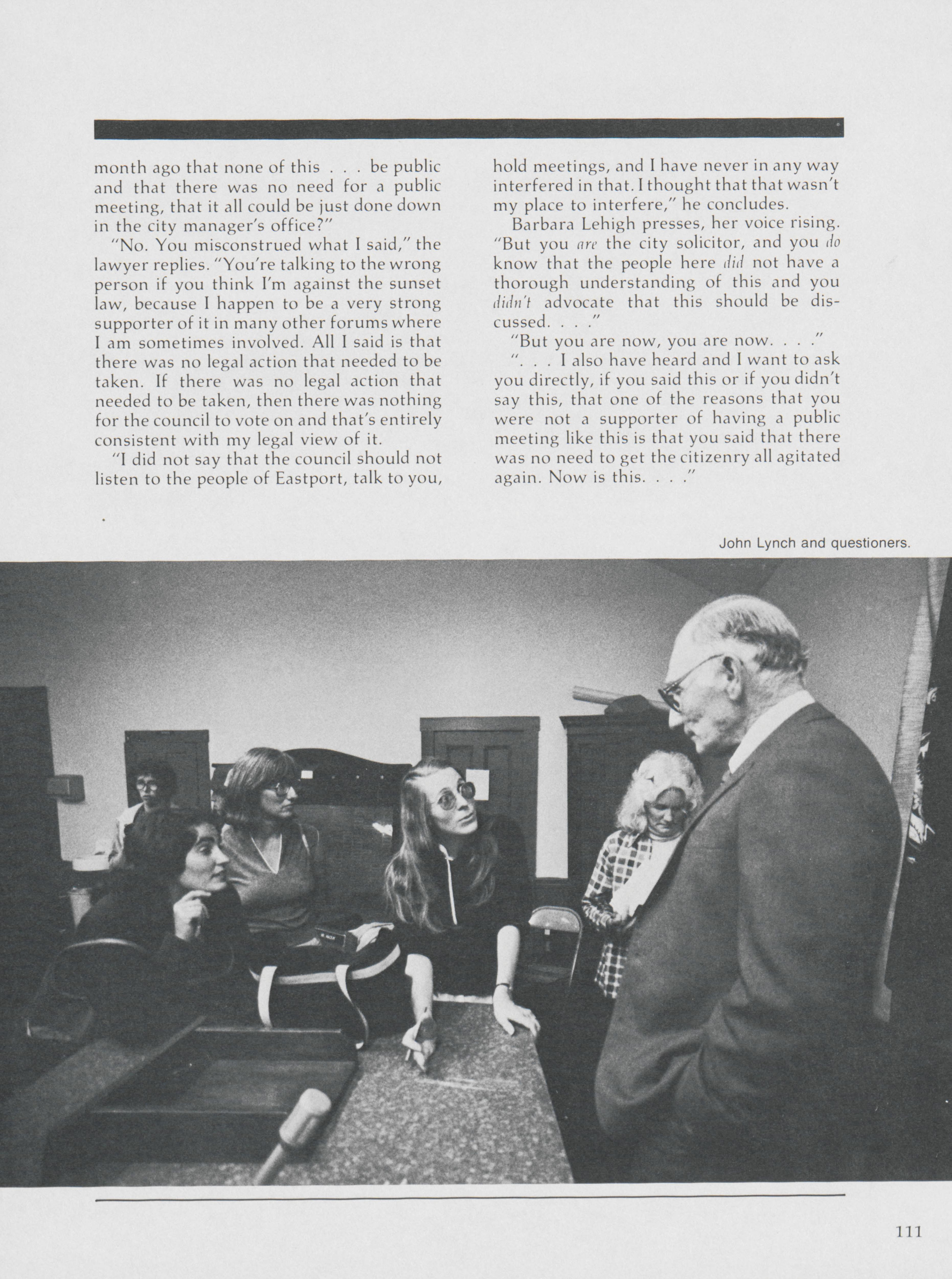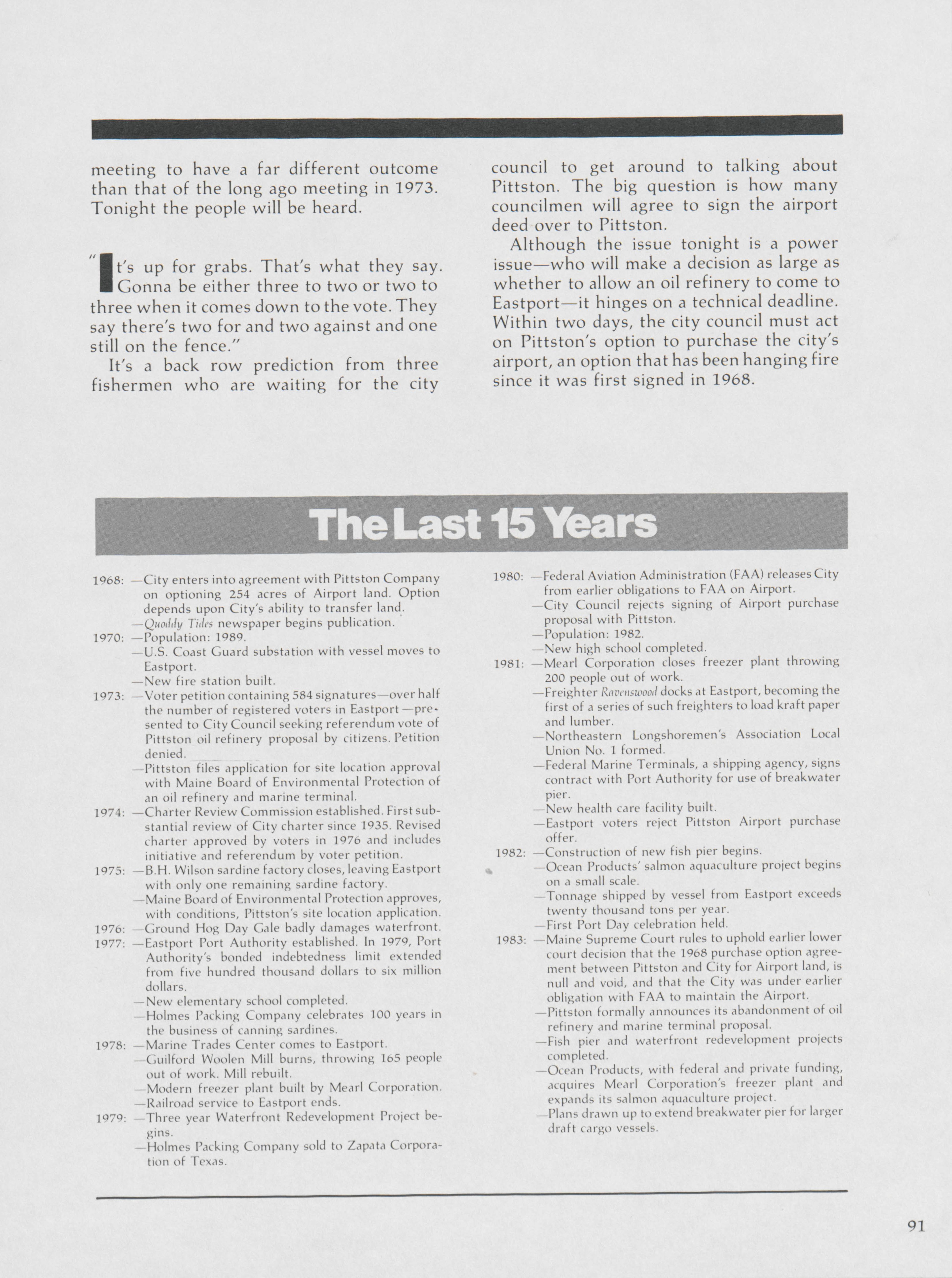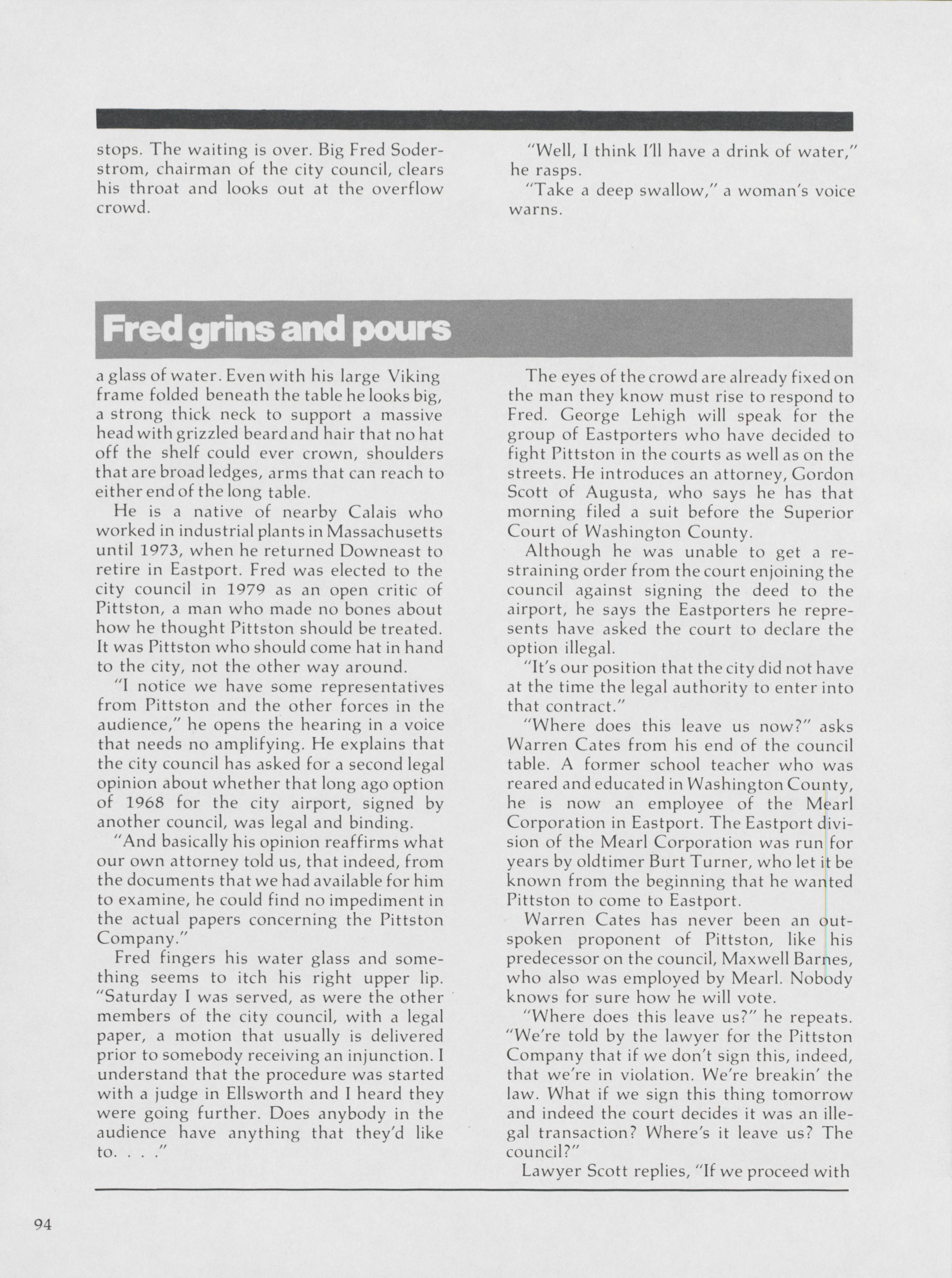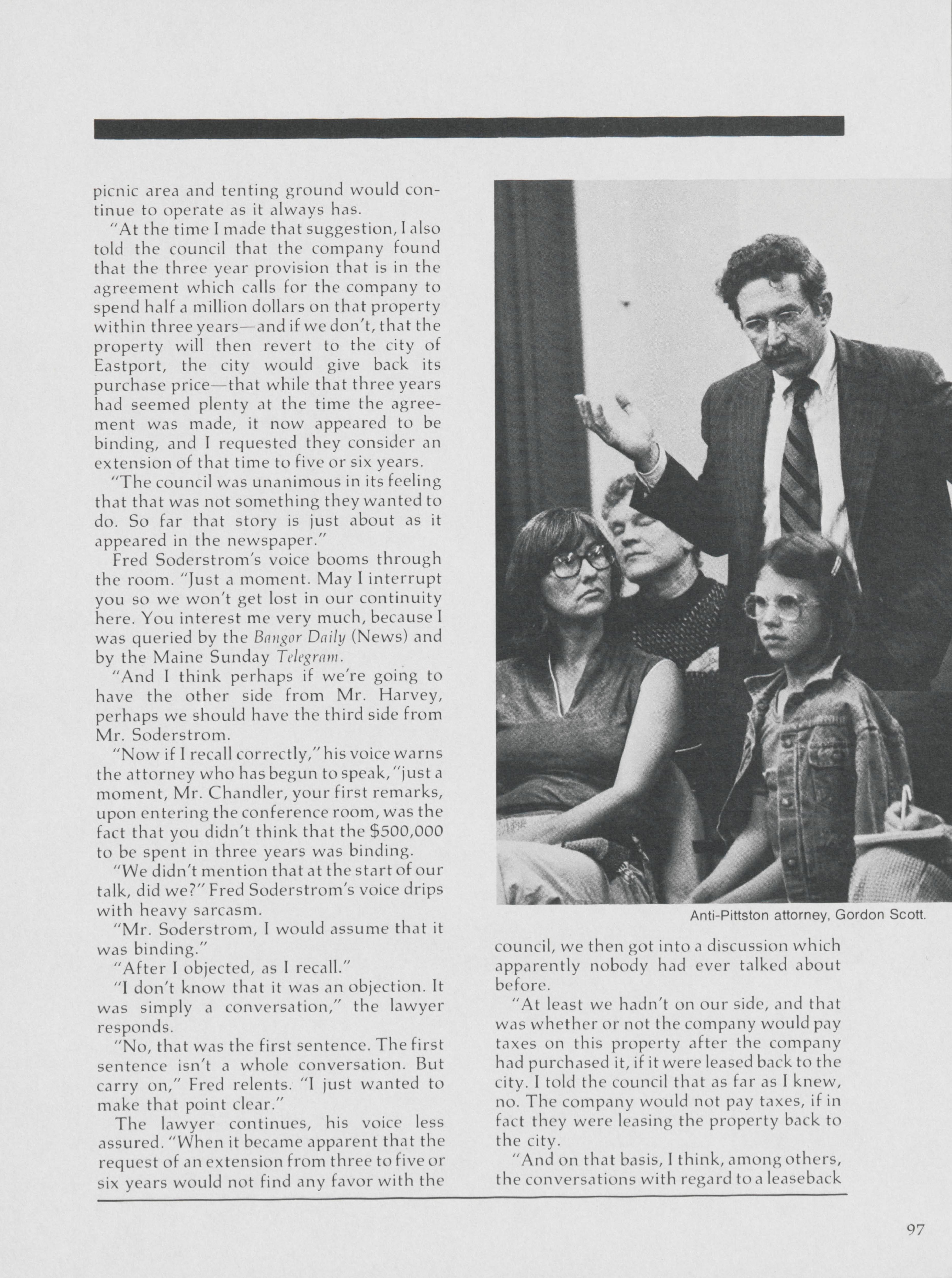 Coming together for a public meeting to discuss the Pittston Company, members of the community are at odds regarding their situation. Pamela Wood documents the tension regarding Eastport's civil war over oil.