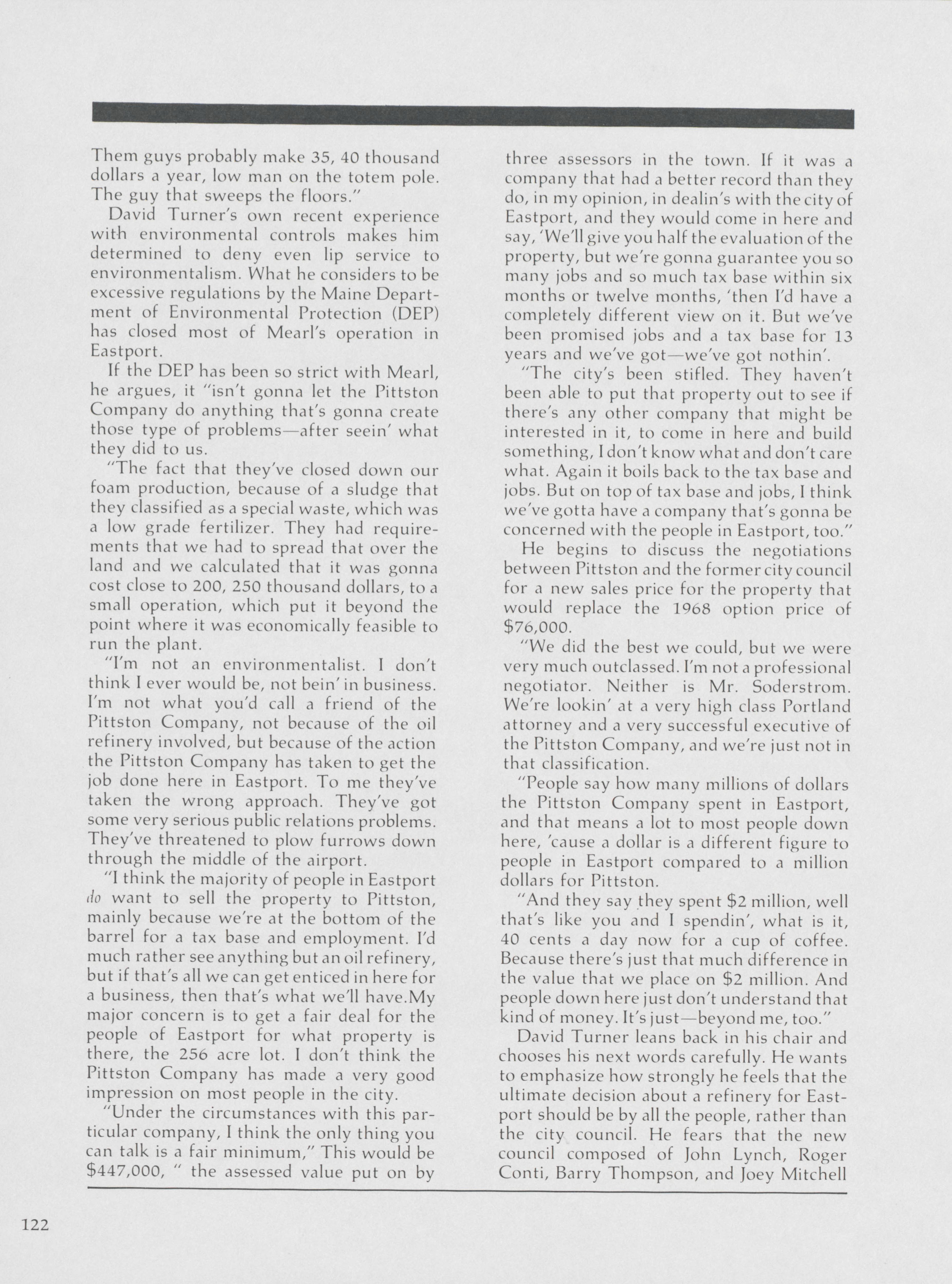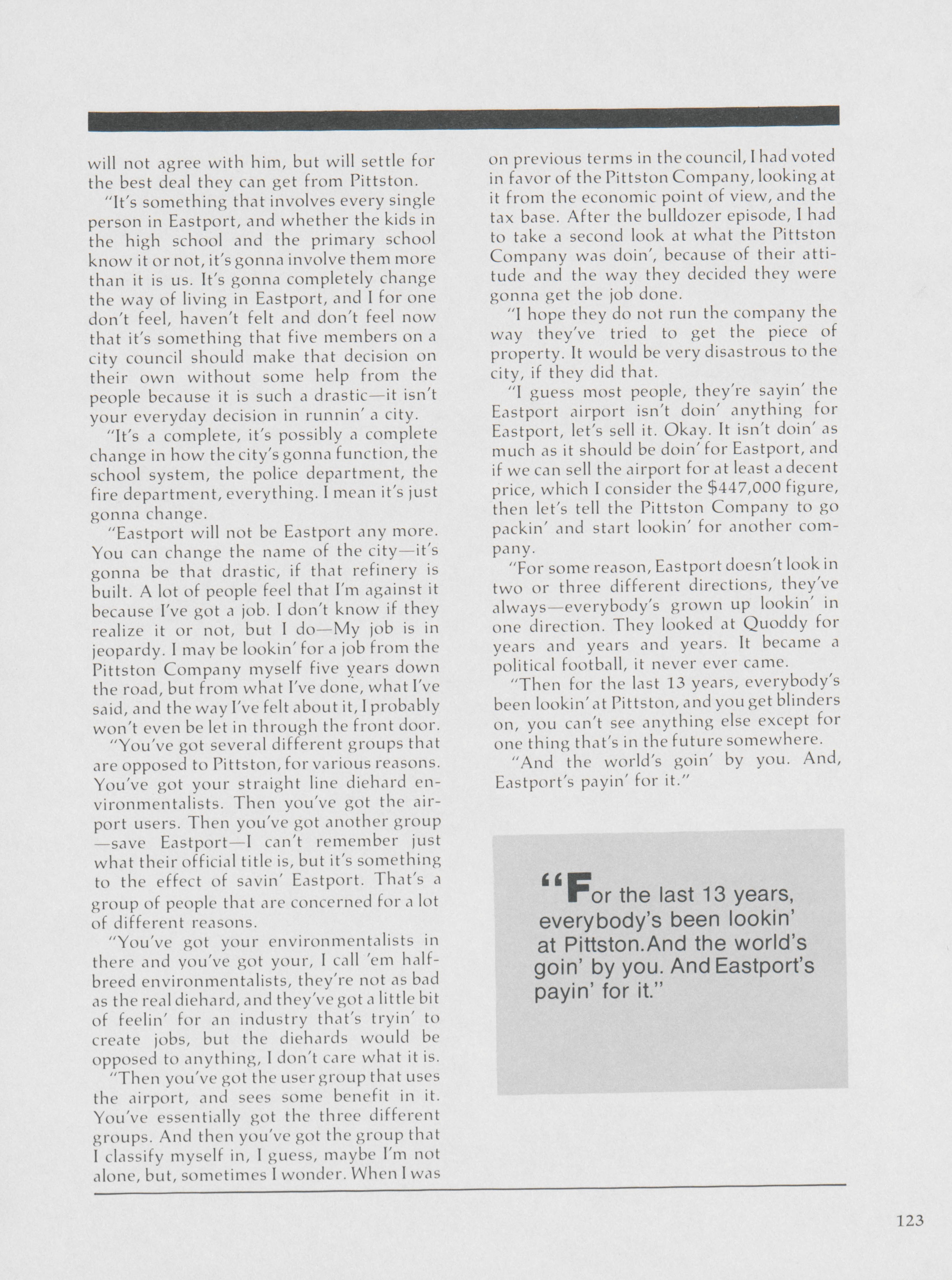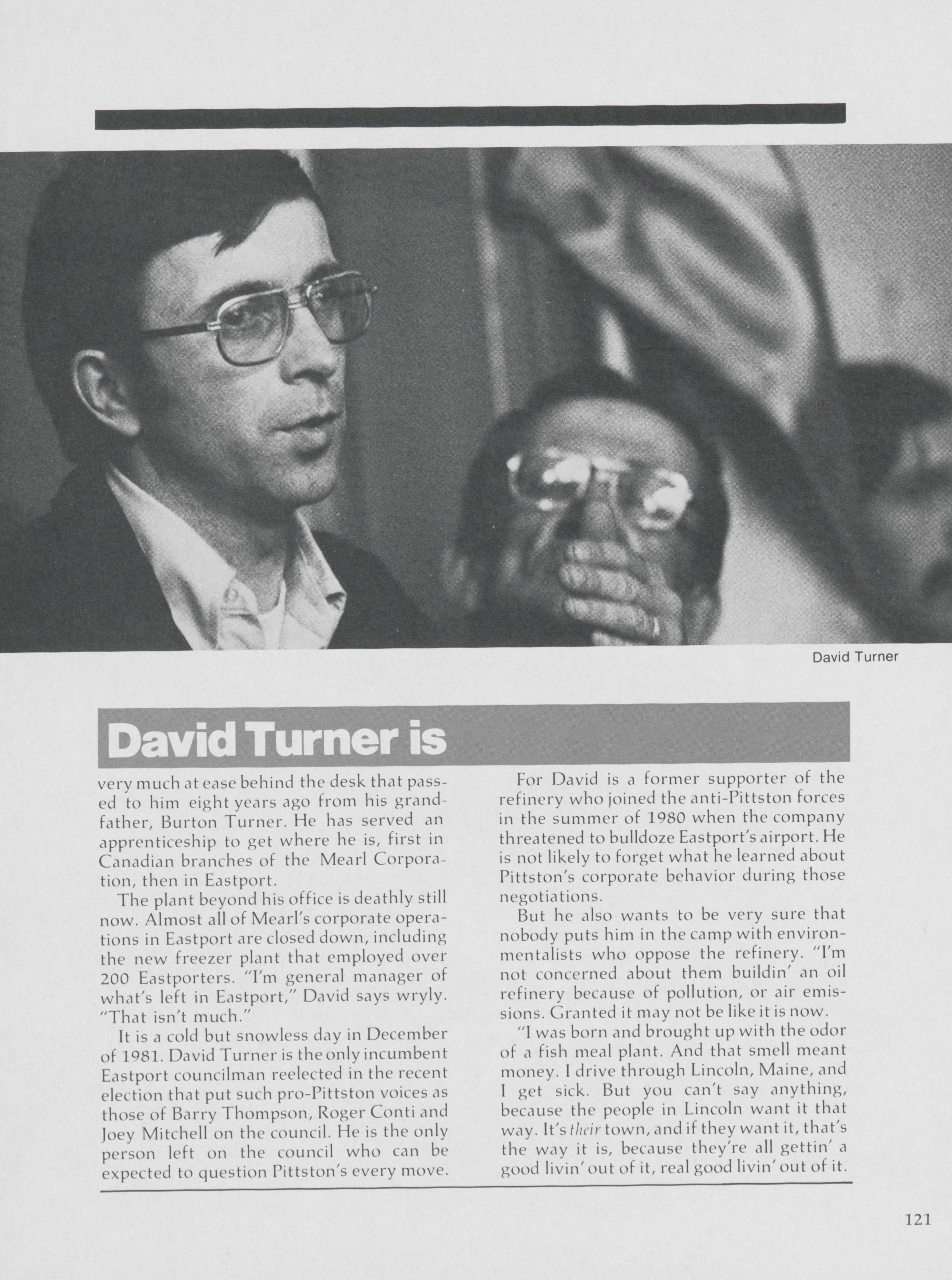Pamela Wood highlights how David Turner, an Eastport councilman, holds the power to question Pittston Company's actions.