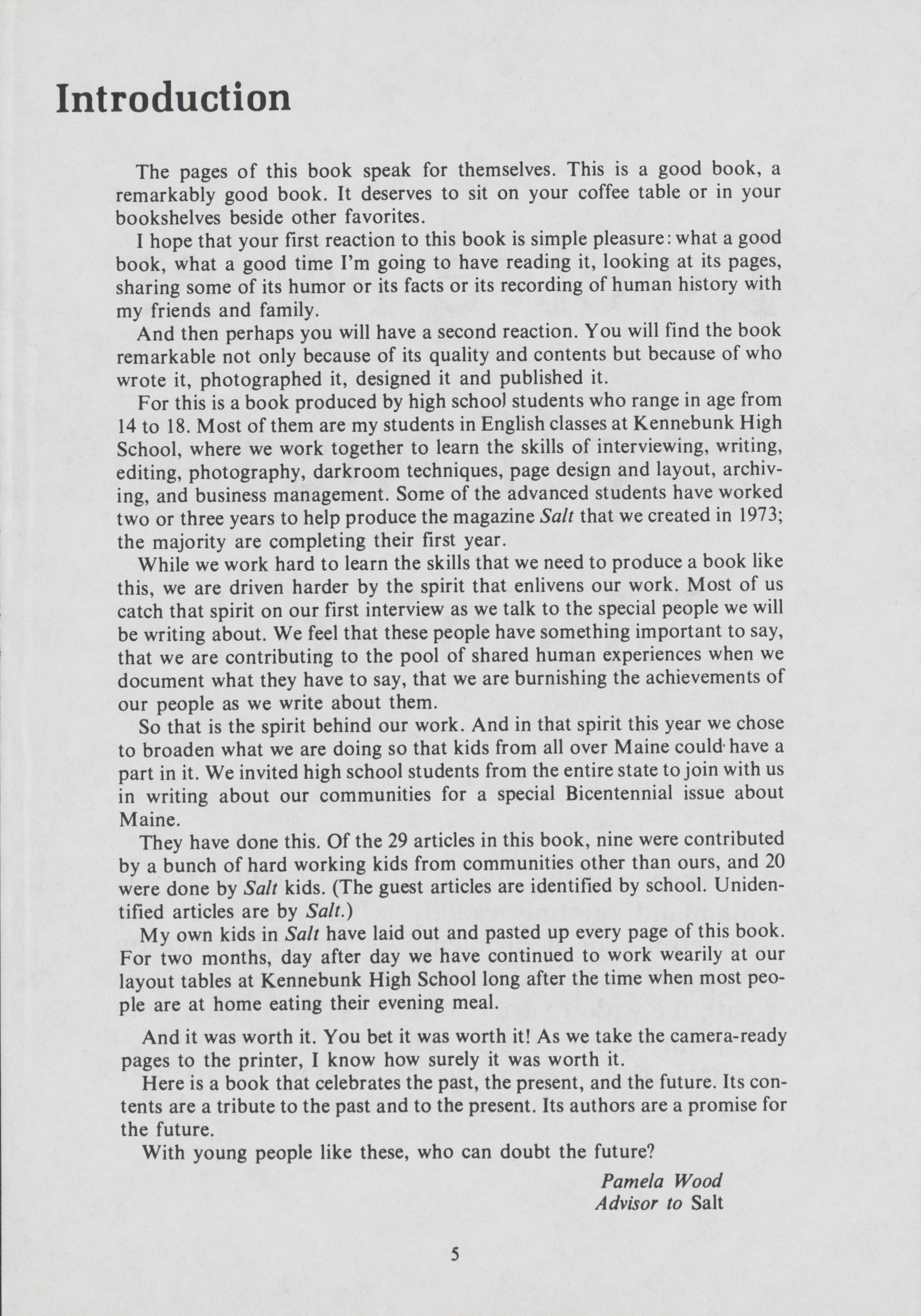 Pamela Wood introduces readers to the June 1976 Bicentennial Salt Magazine, discussing the work that her students put into the book.