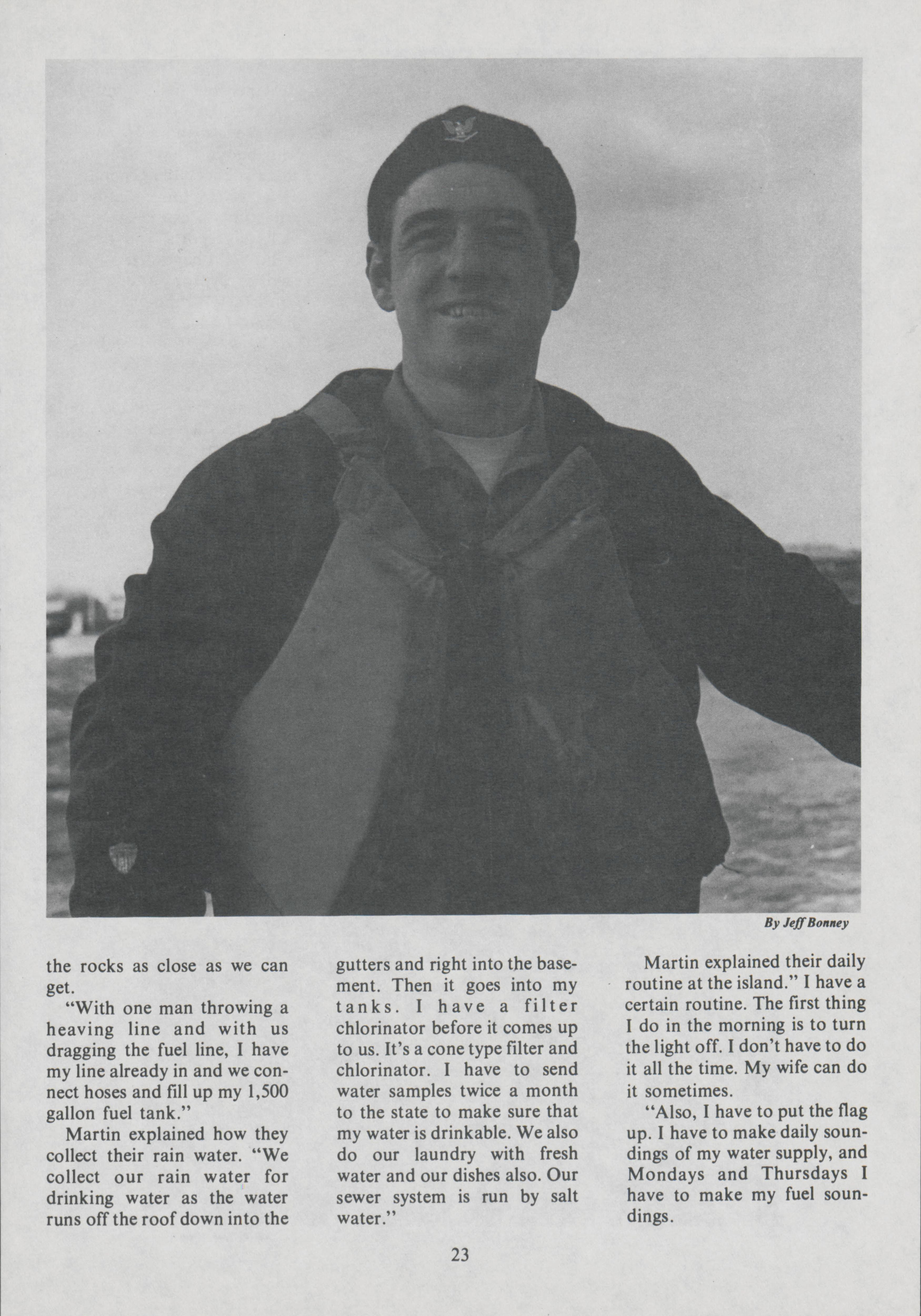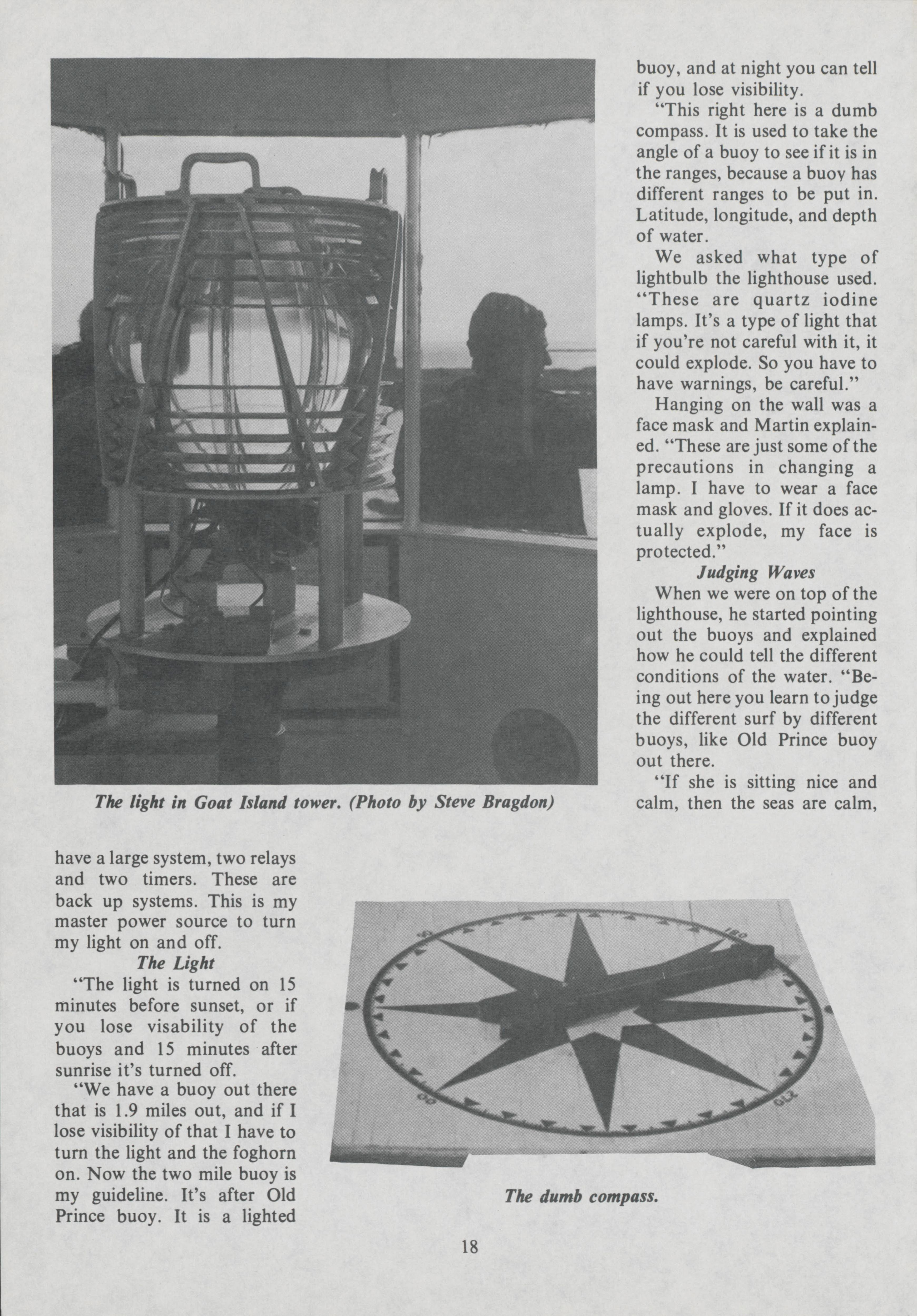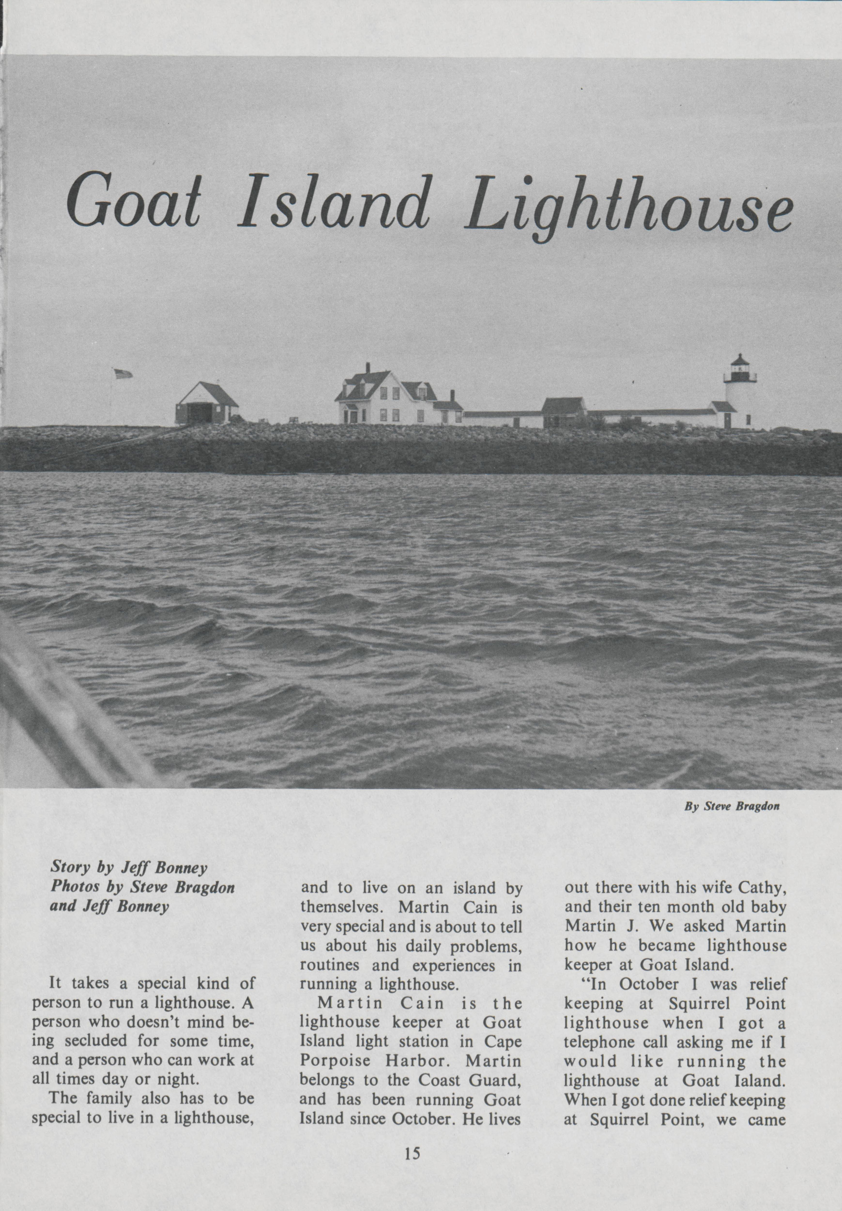 As the lighthouse keeper at Goat Island, Martin Cain has to live a secluded life. Jeffrey Bonney documents Cain's daily problems, routines, and experiences in running a lighthouse.