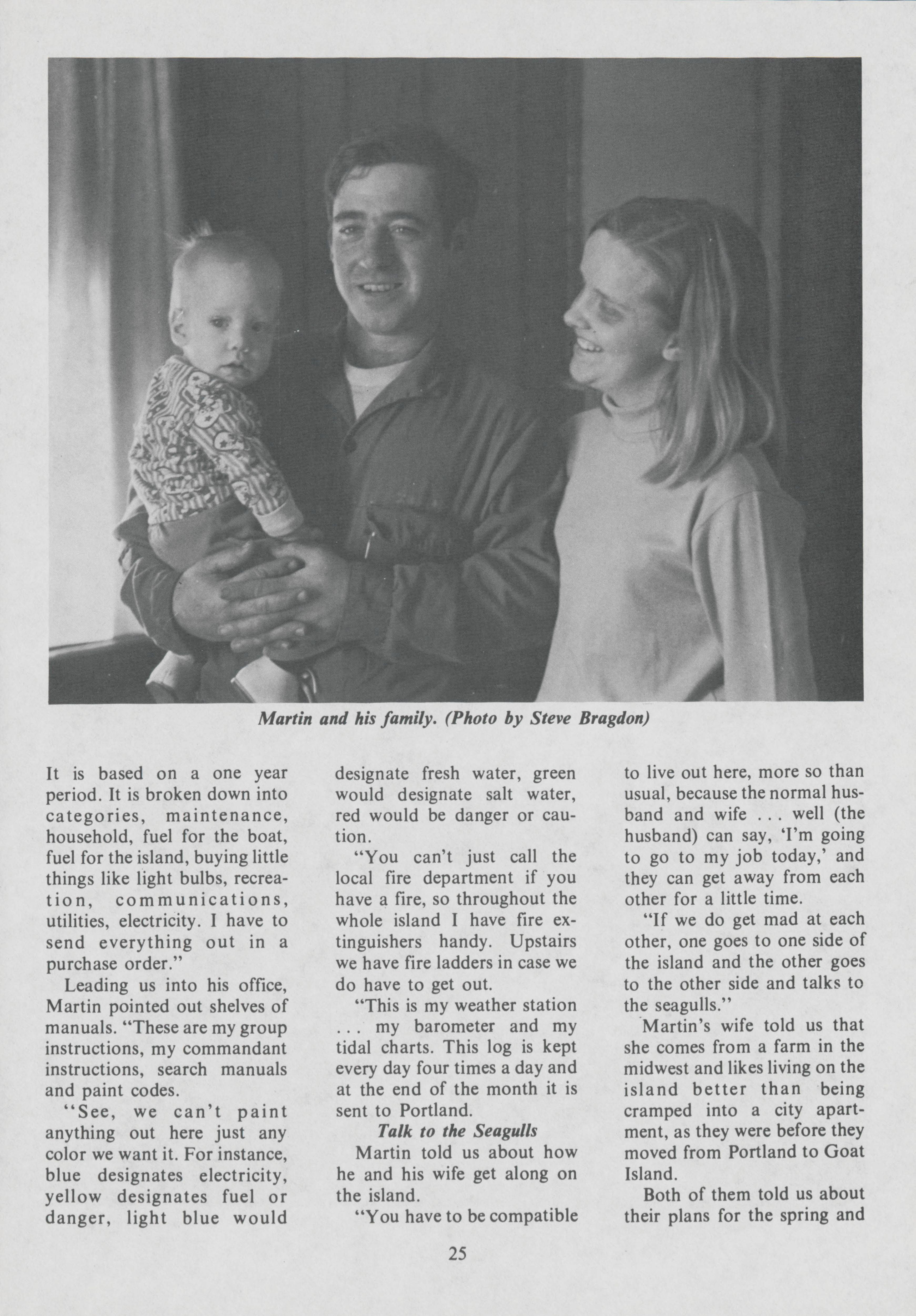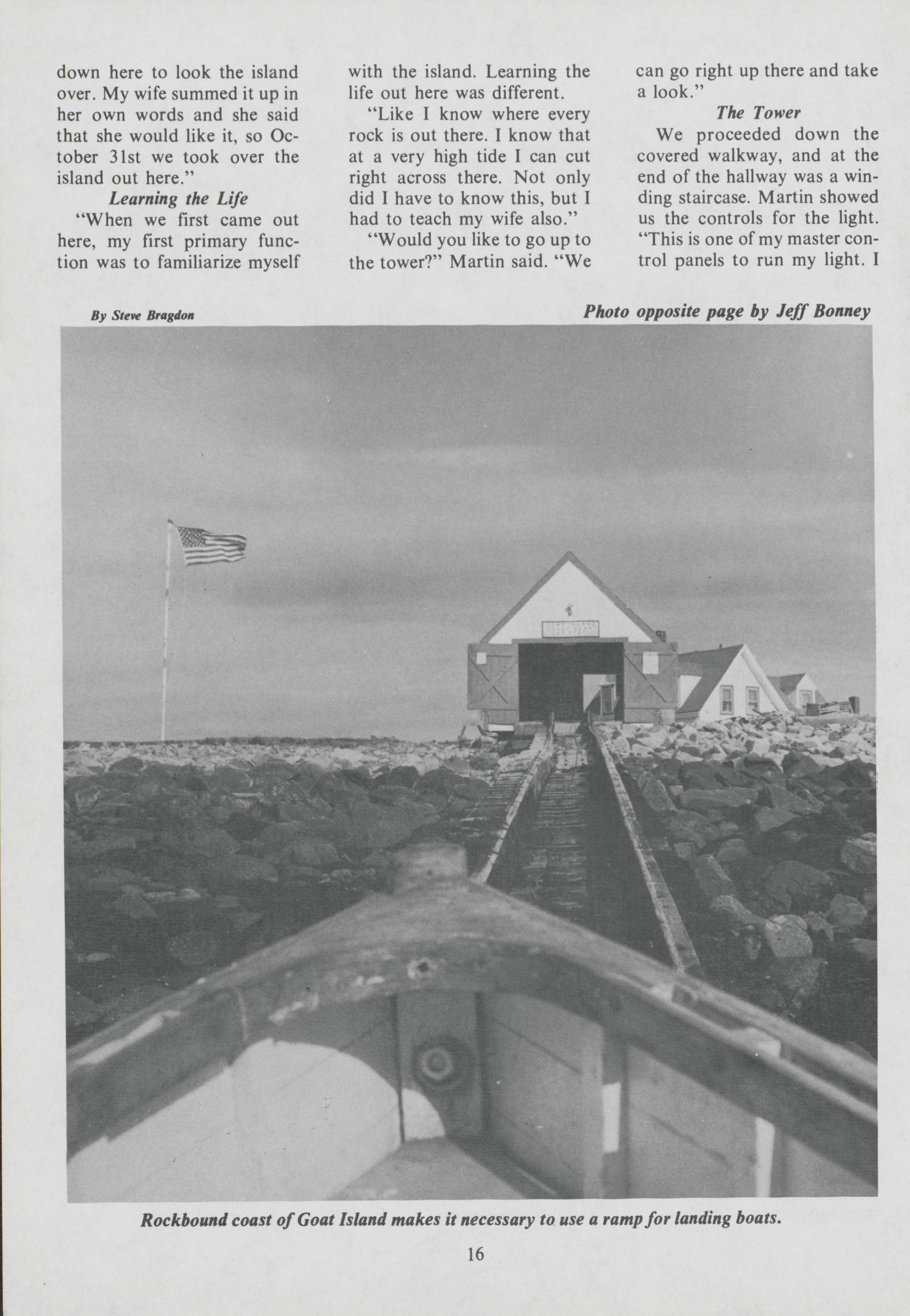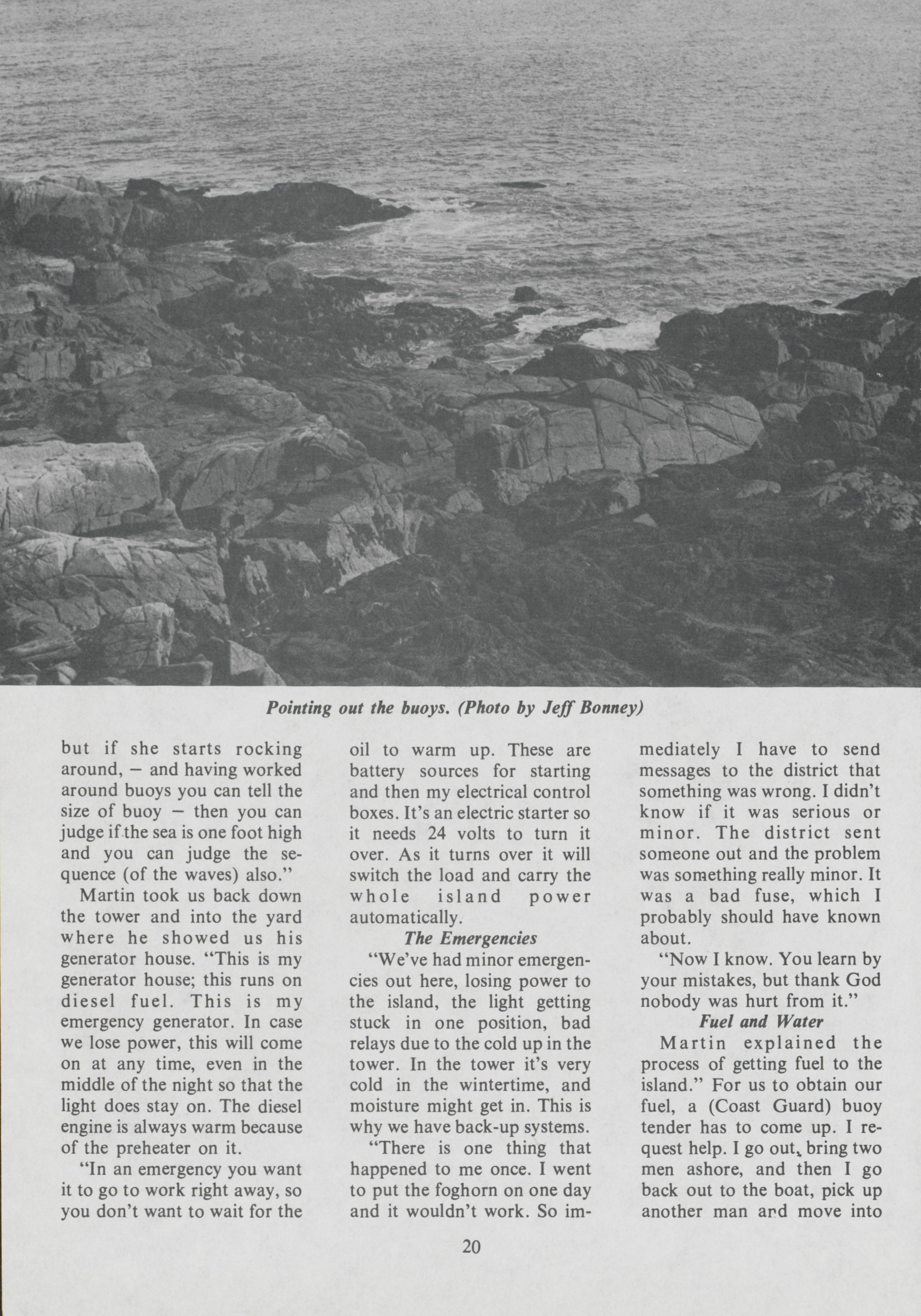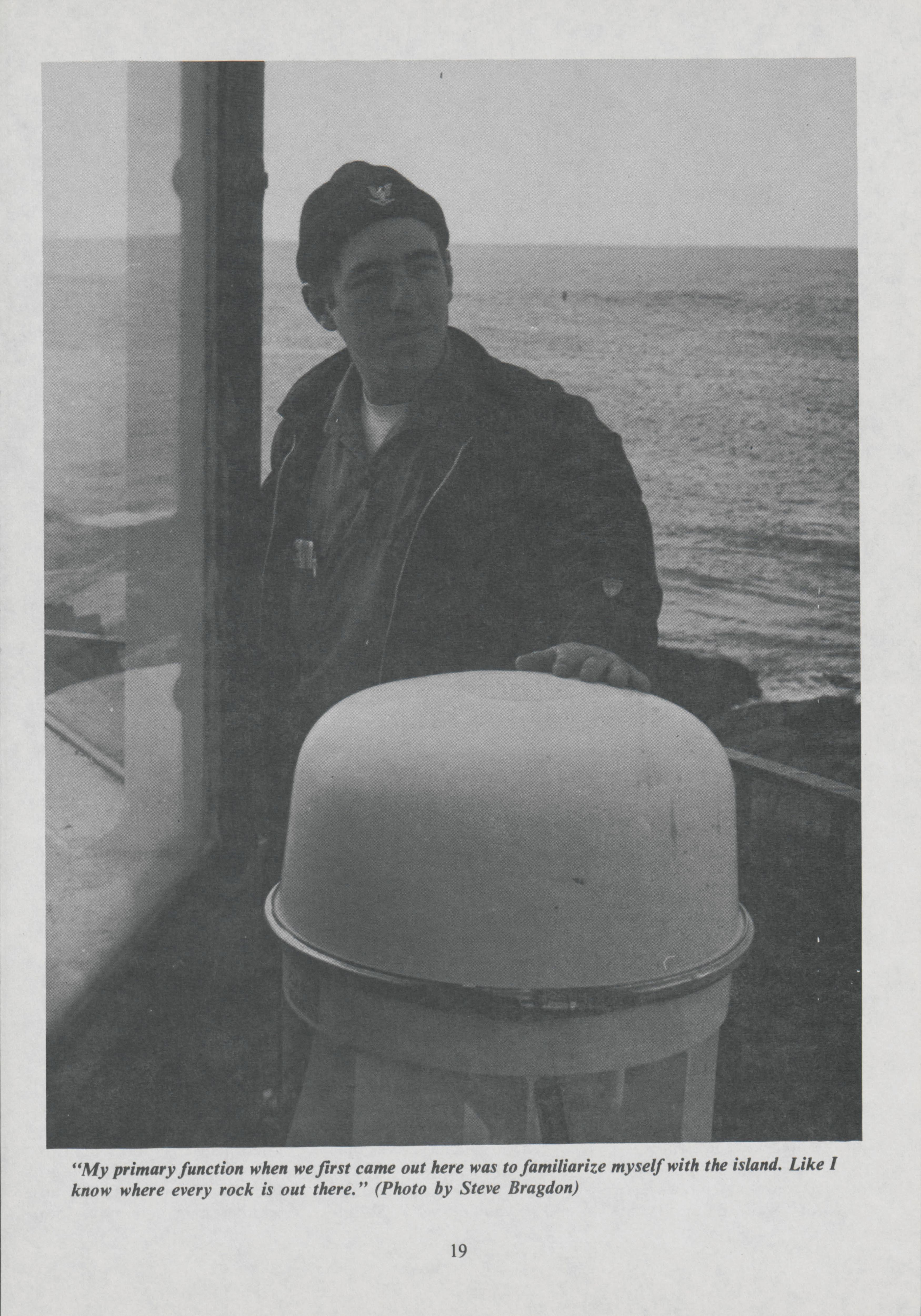 As the lighthouse keeper at Goat Island, Martin Cain has to live a secluded life. Jeffrey Bonney documents Cain's daily problems, routines, and experiences in running a lighthouse.