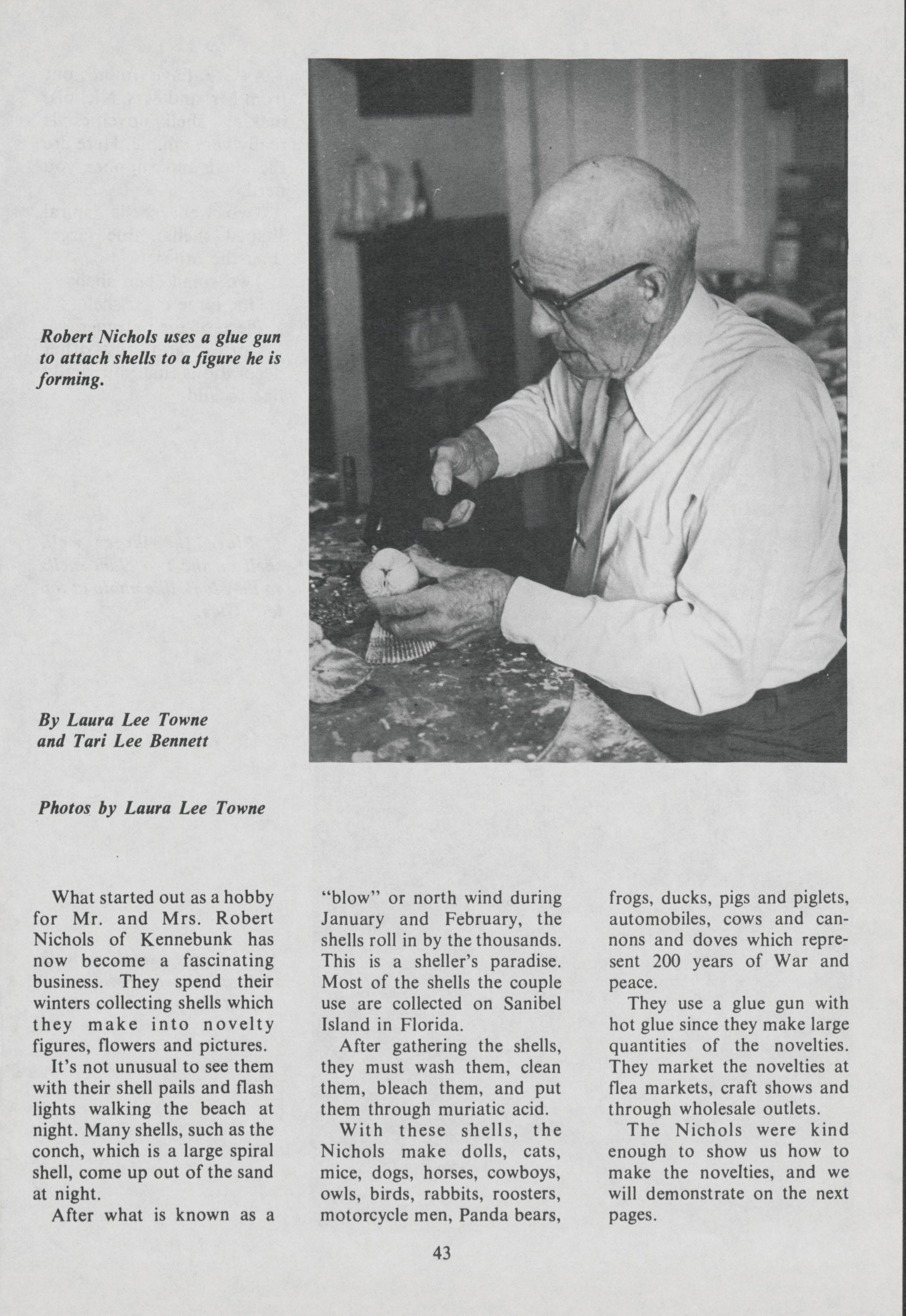 Starting off as a hobby for Mr. and Mrs. Robert Nichols, creating art with shells has become a business. Laura Lee Towne and Tari Lee Bennett speak to the Nichols' about their craft work to make figures with shells.
