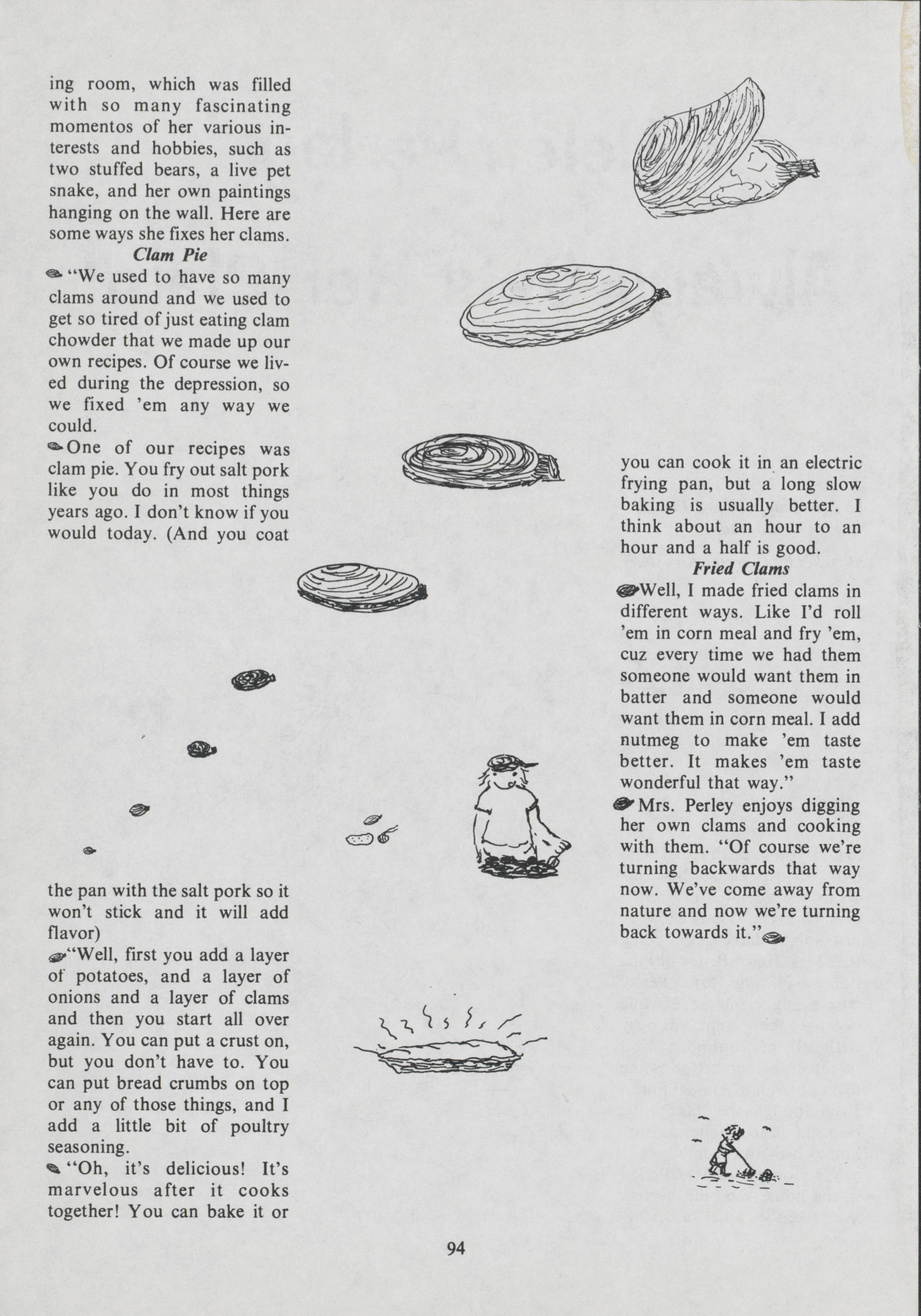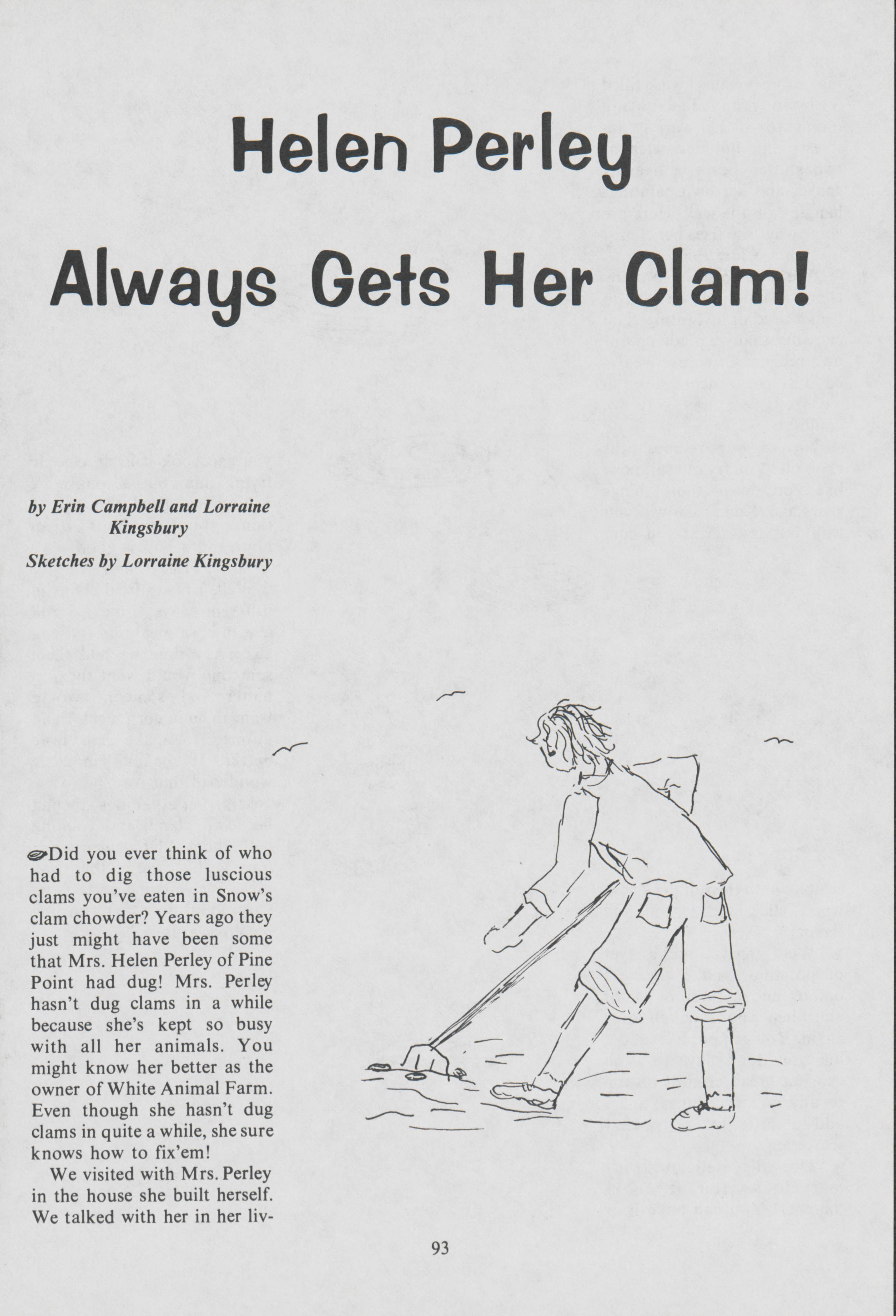 Although Helen Perley has not gone clam digging in a while, she knows how to prepare them. Erin Campbell and Lorraine Kingsbury speak to Perley about the various ways to prepare clams.
