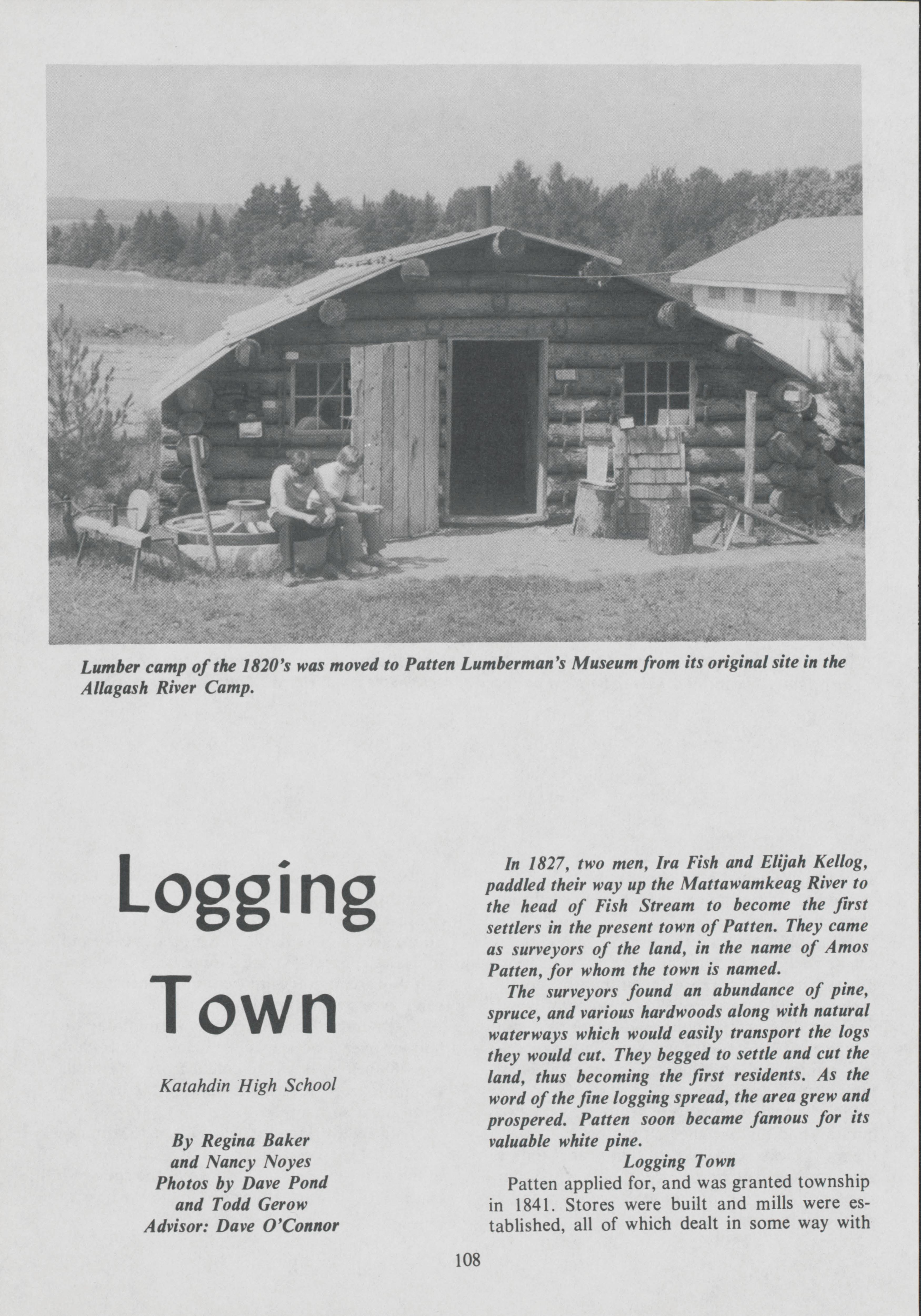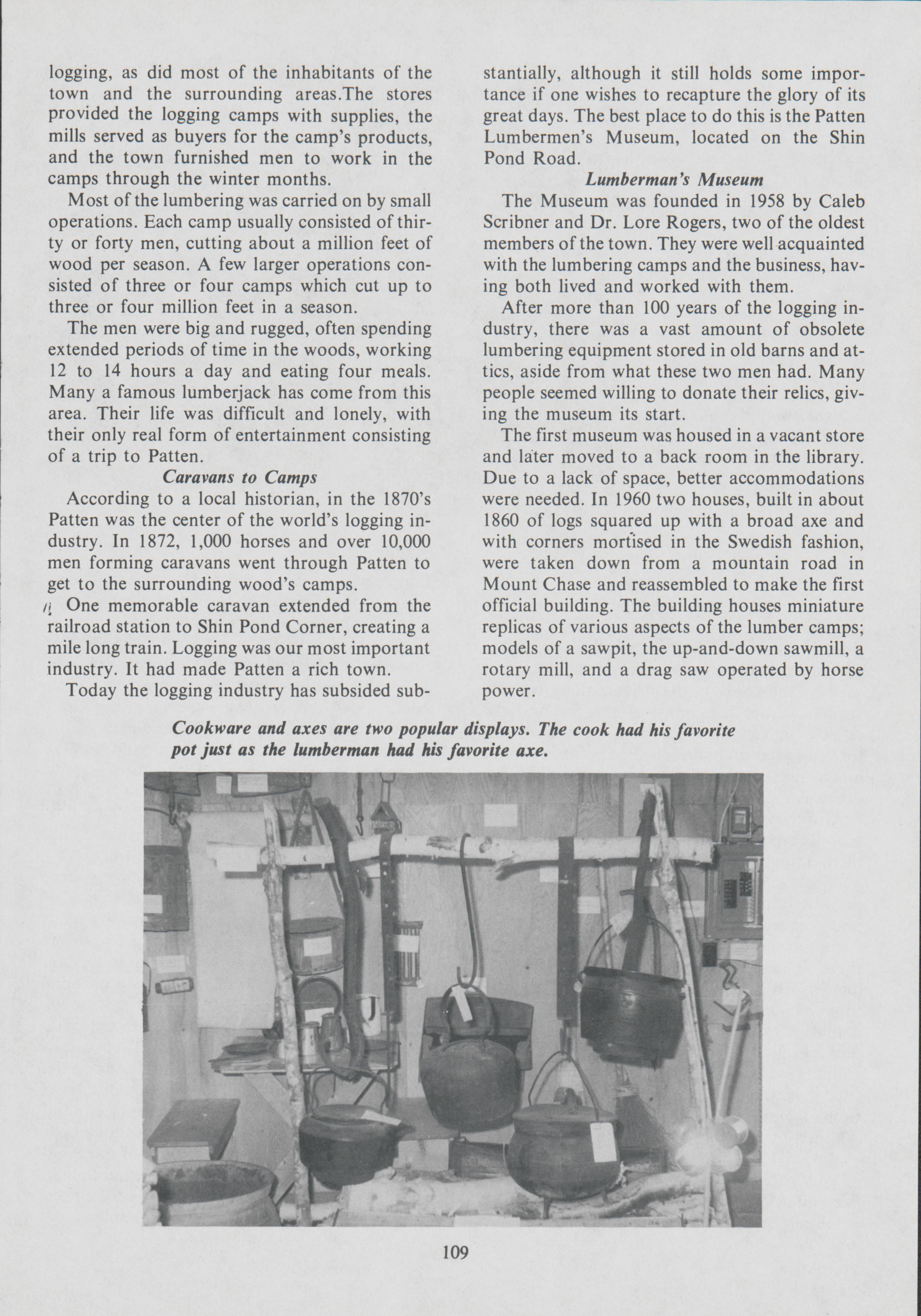 For the town of Patten, Maine, the logging industry made a large impact, being considered the lumbering center of the world. Regina Baker and Nancy Noyes document how lumbering became ingrained into the local history, and write about the museum that holds that history.