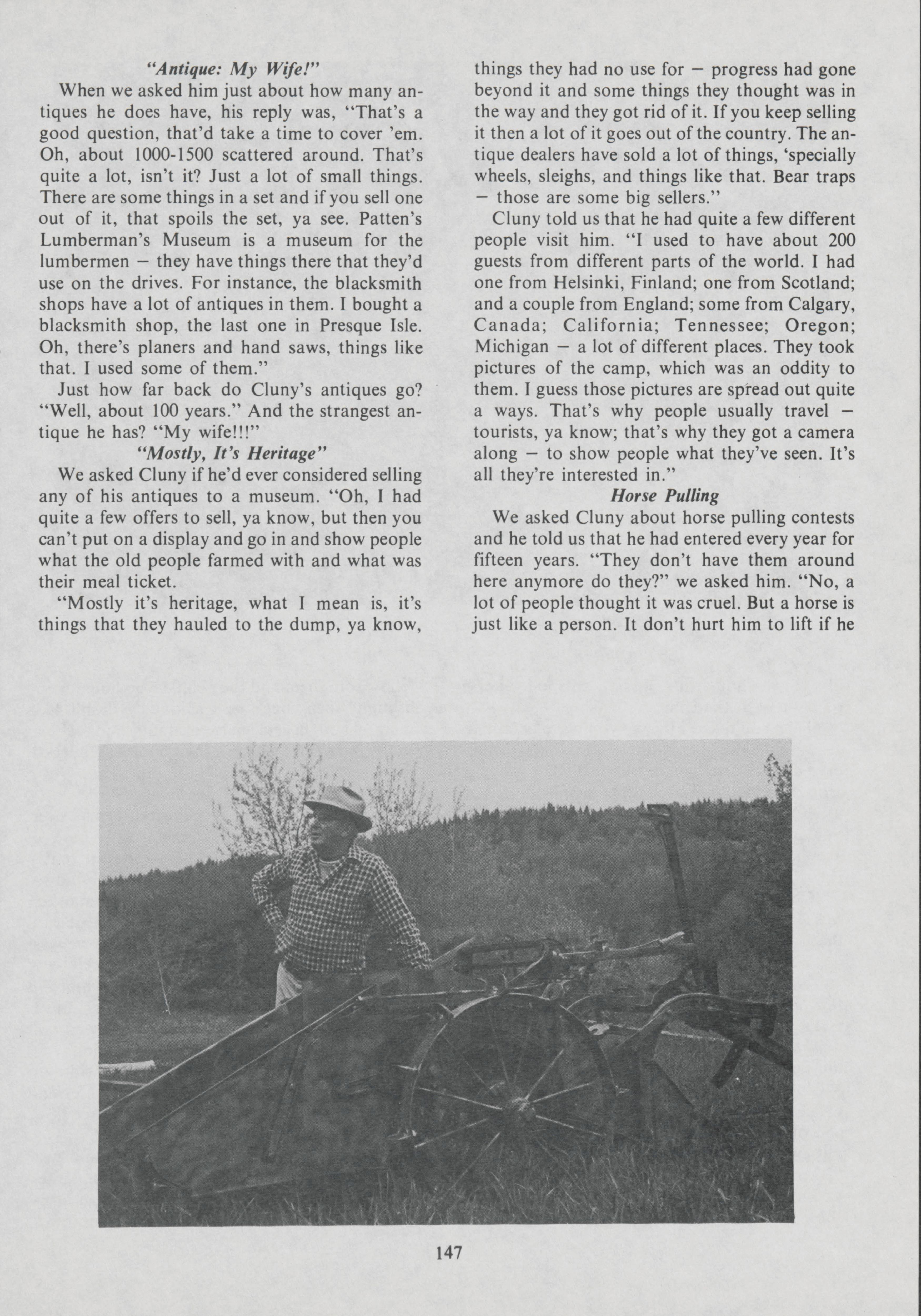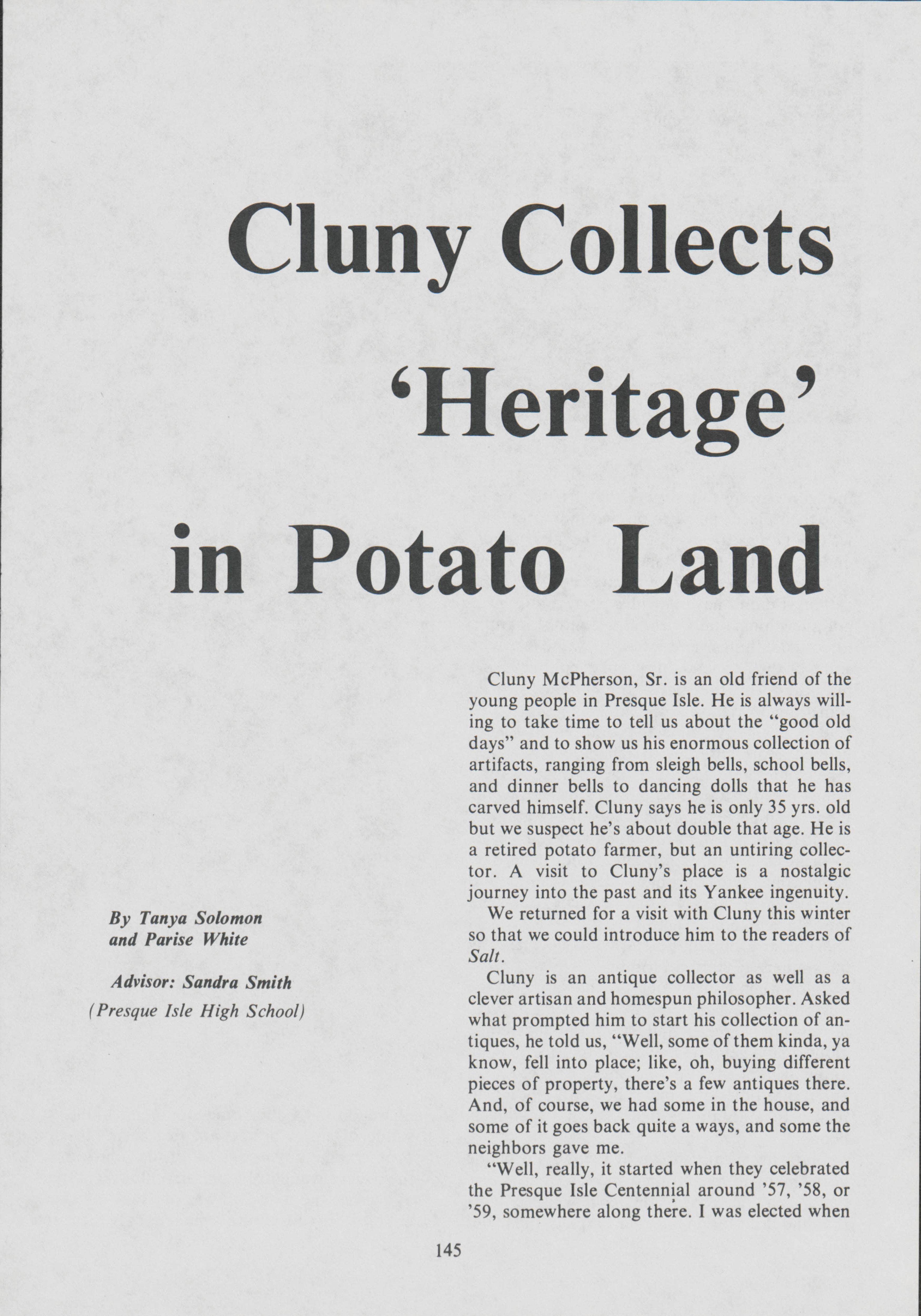 In Presque Isle, Cluny McPherson collects the heritage of potato growing people. Tanya Solomon and Parise White speak to McPherson about his collection of old farm tools.