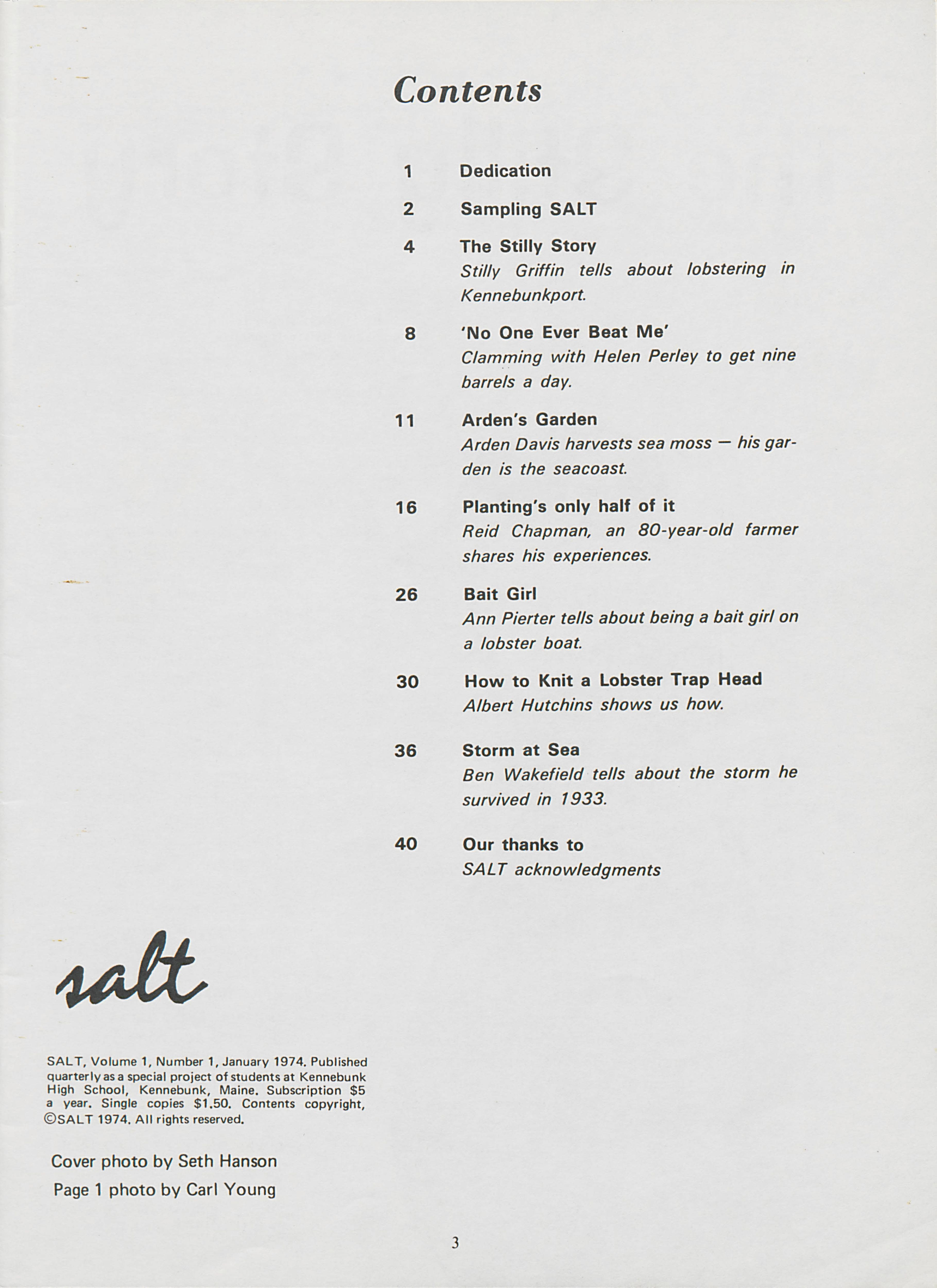 January 1974 Salt Magazine, Table of Contents