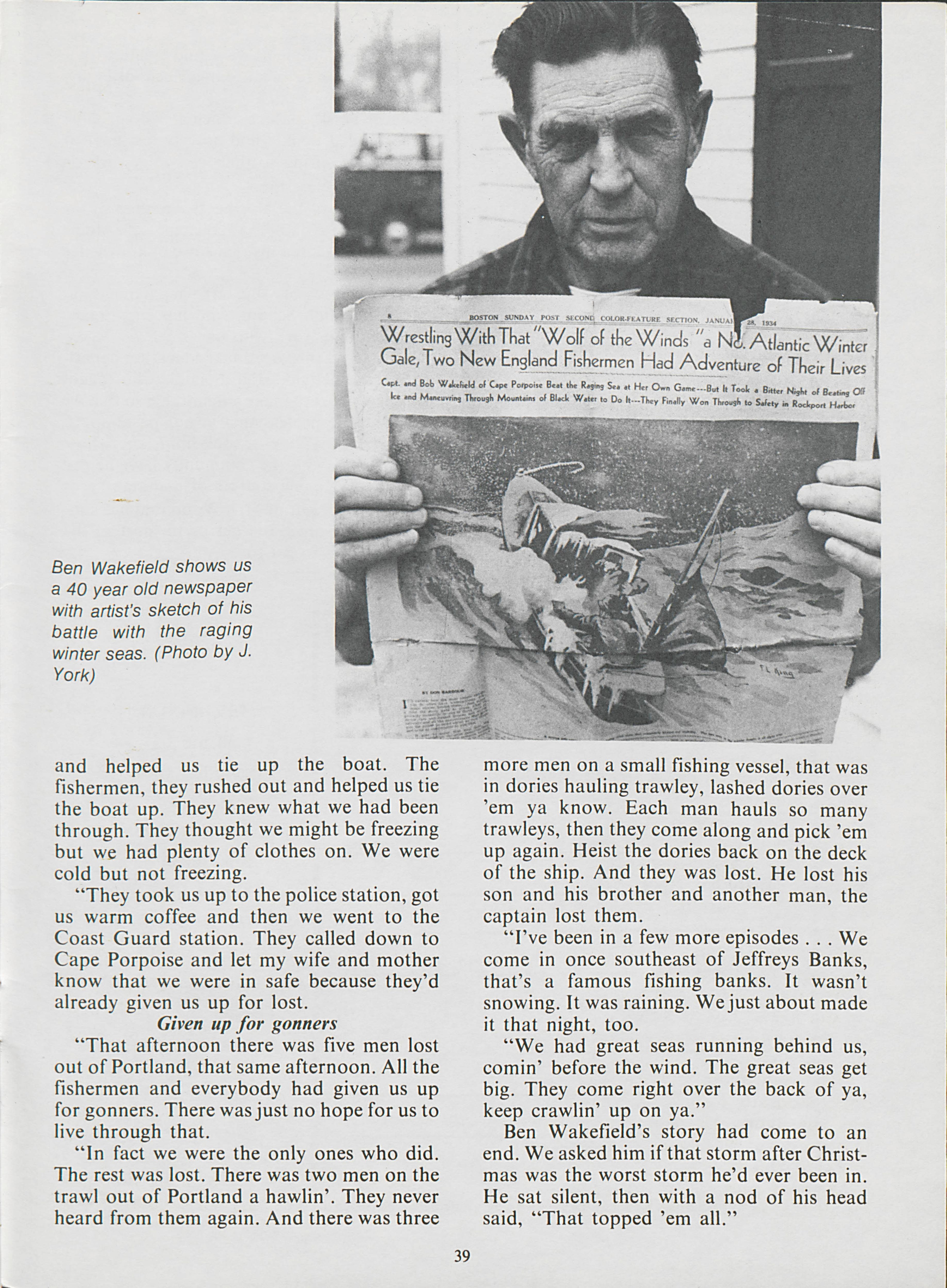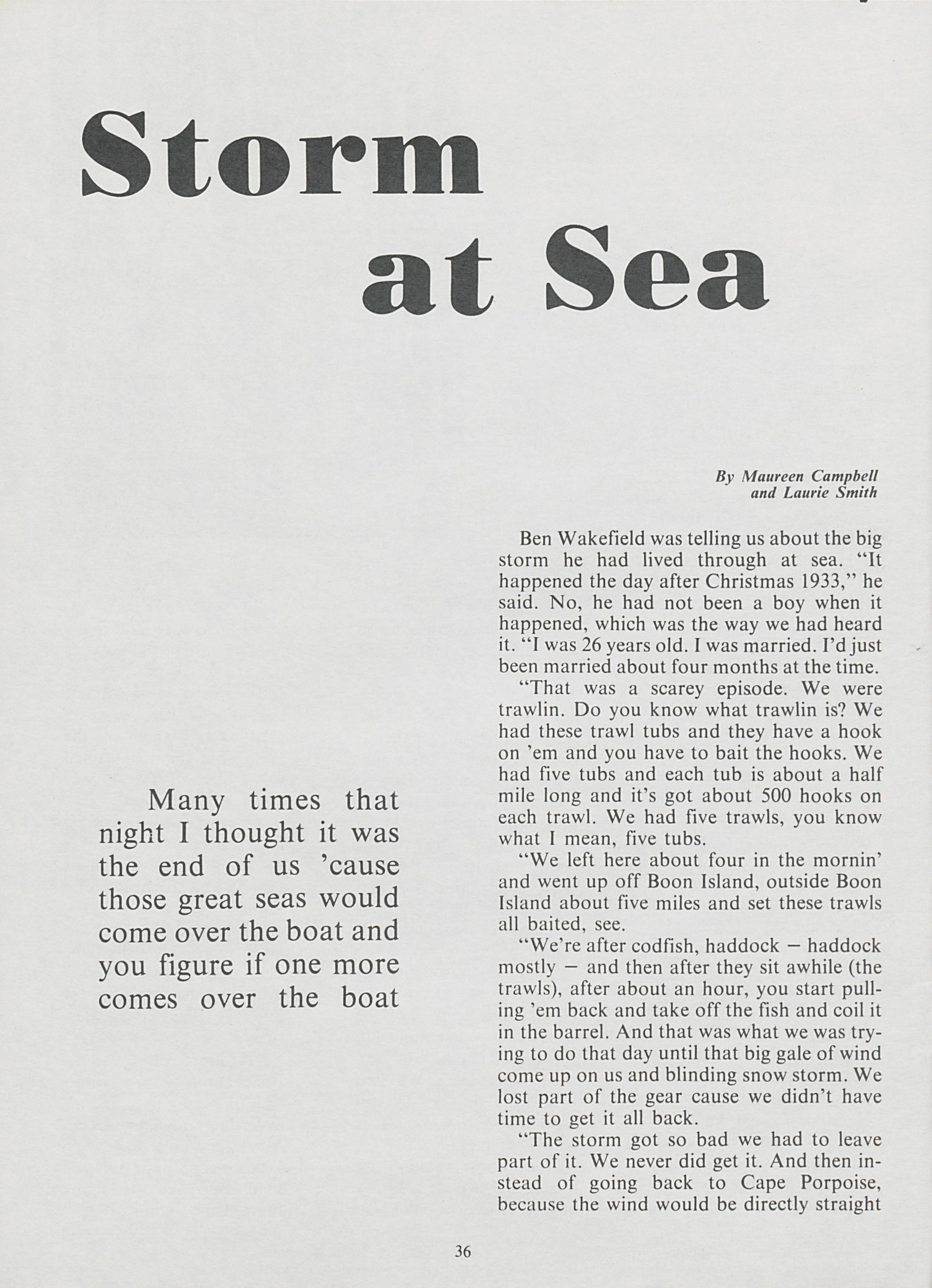 On the day after Christmas in 1933, Ben Wakefield found himself facing a big storm while on the sea. Maureen Campbell and Laurie Smith document Wakefield's story of battling against the winter seas.