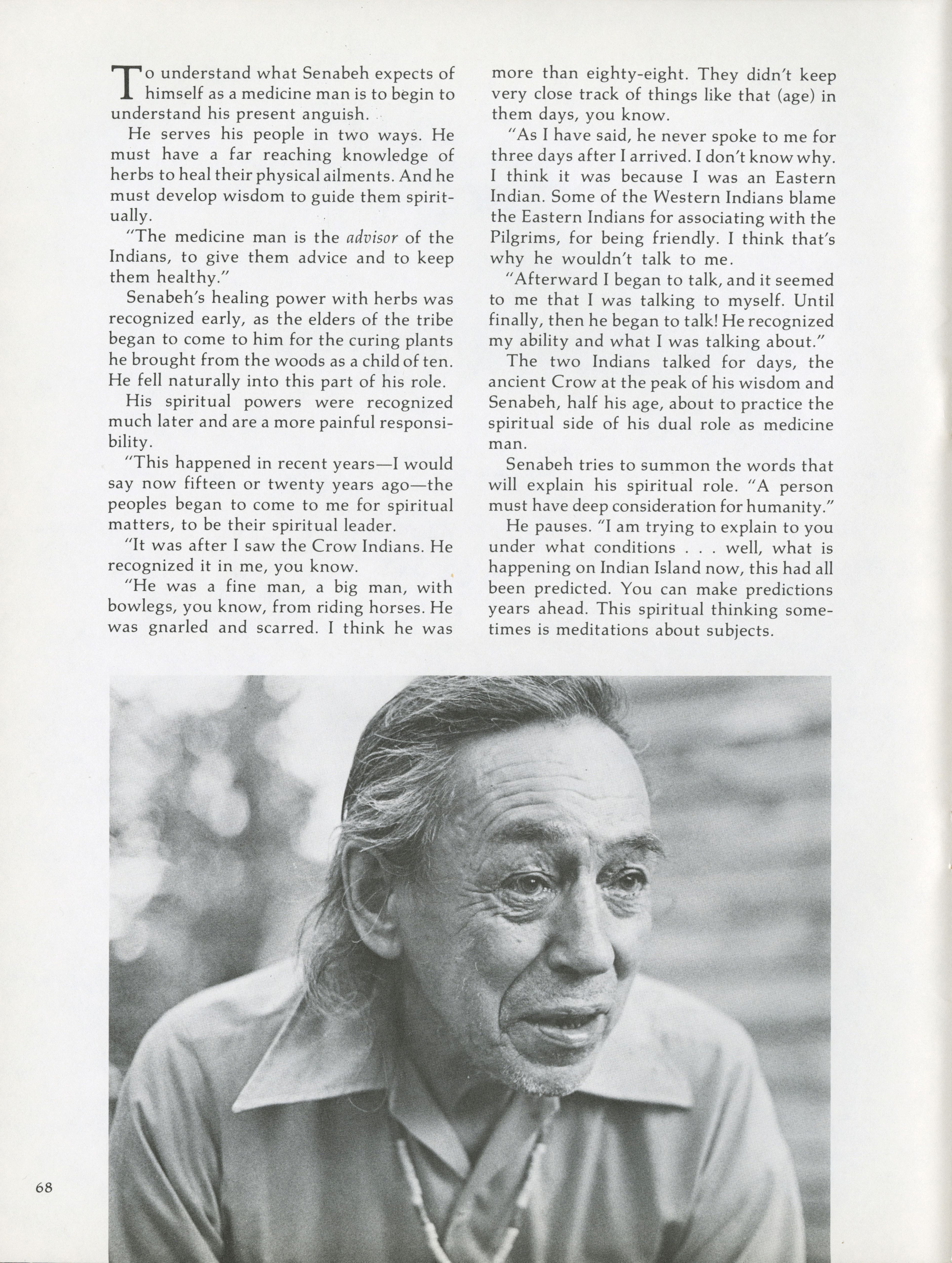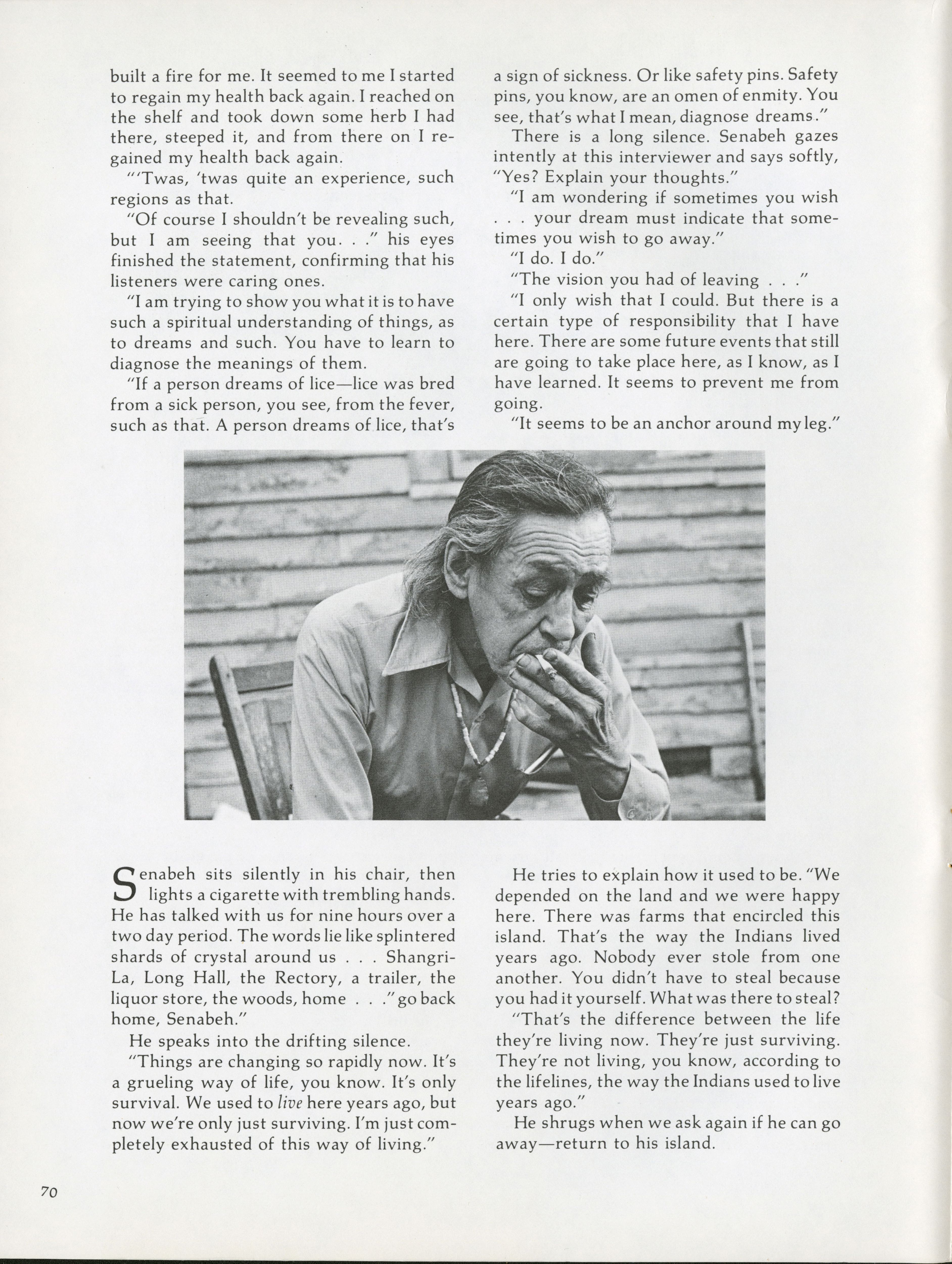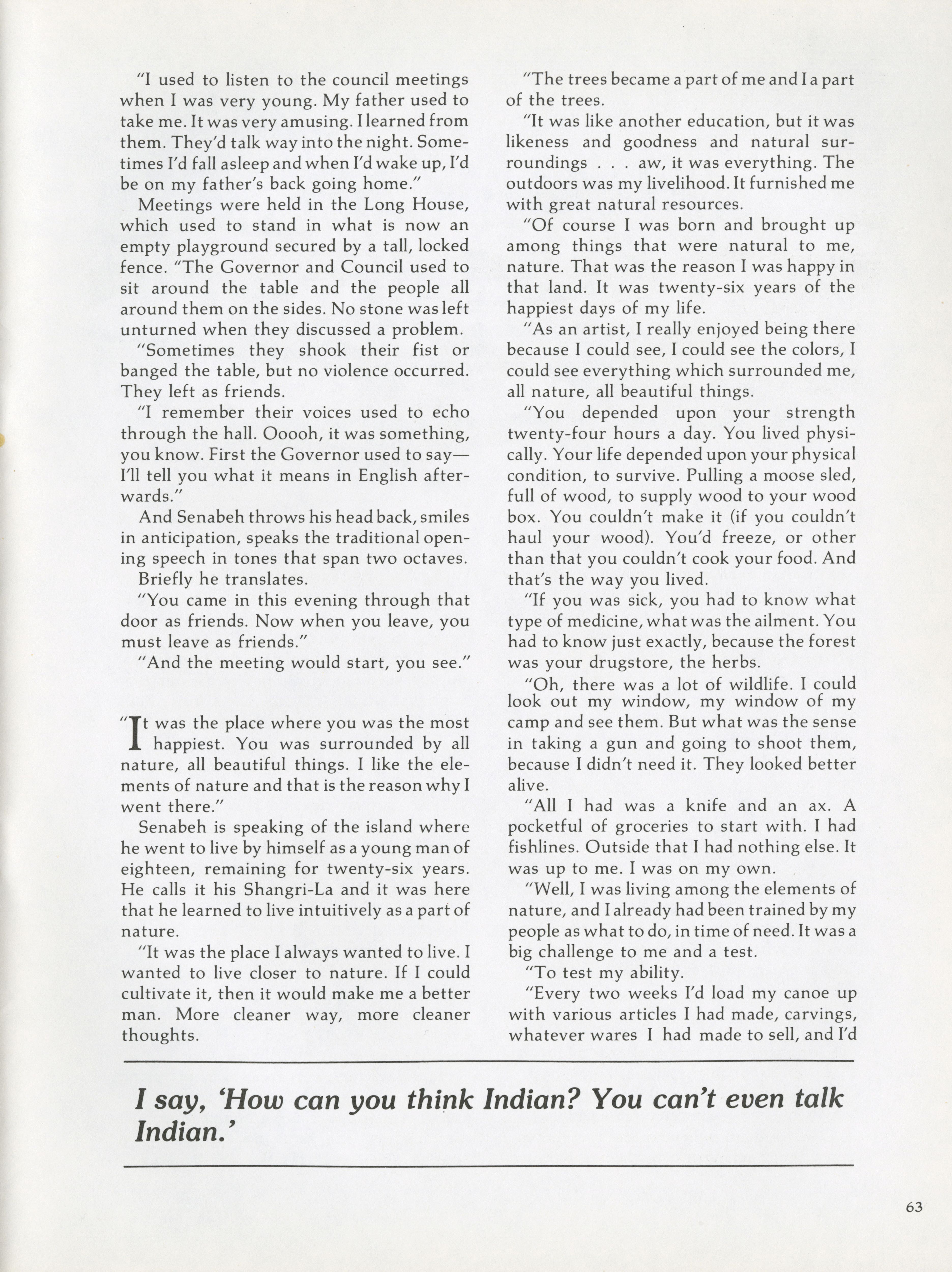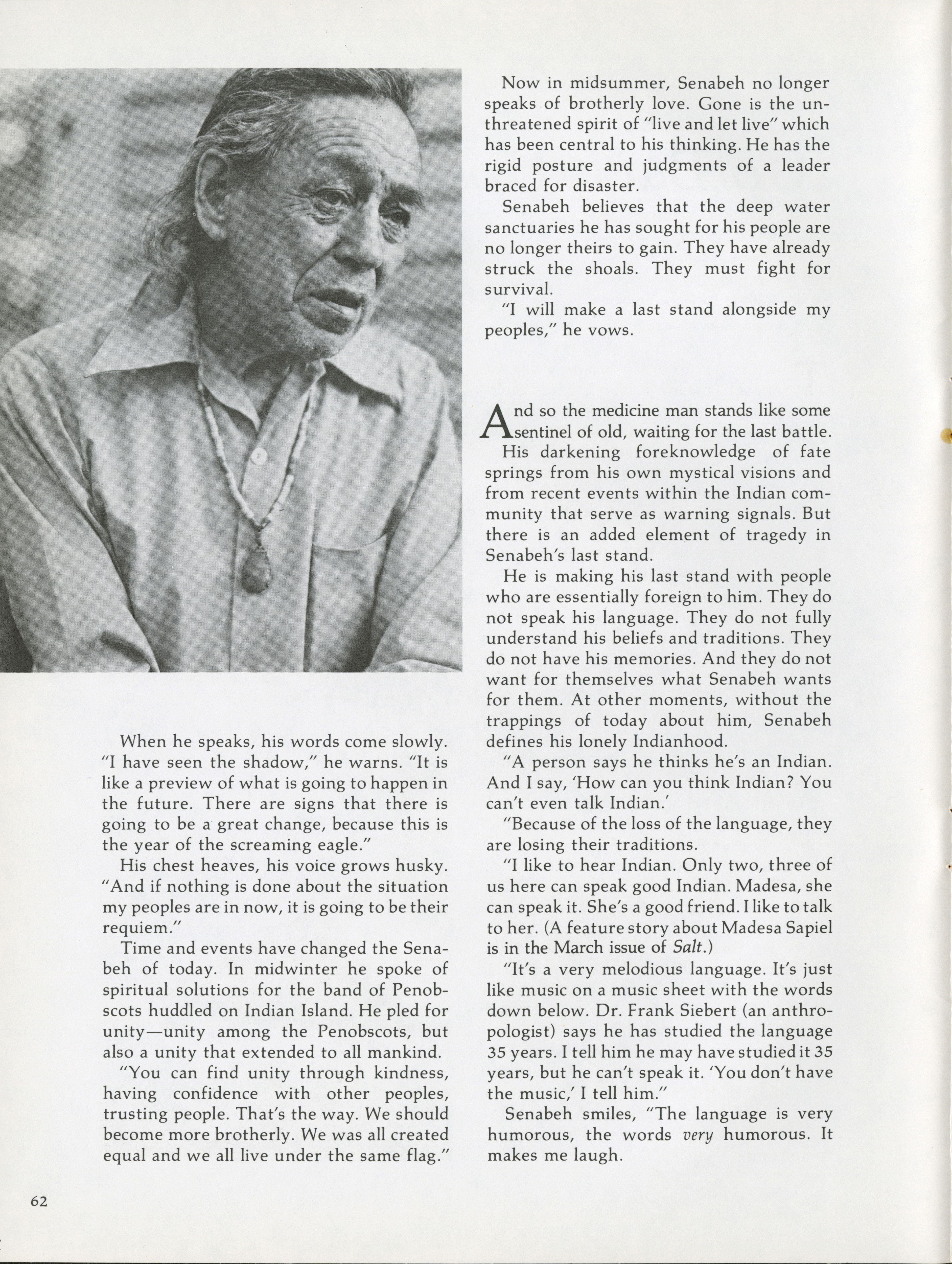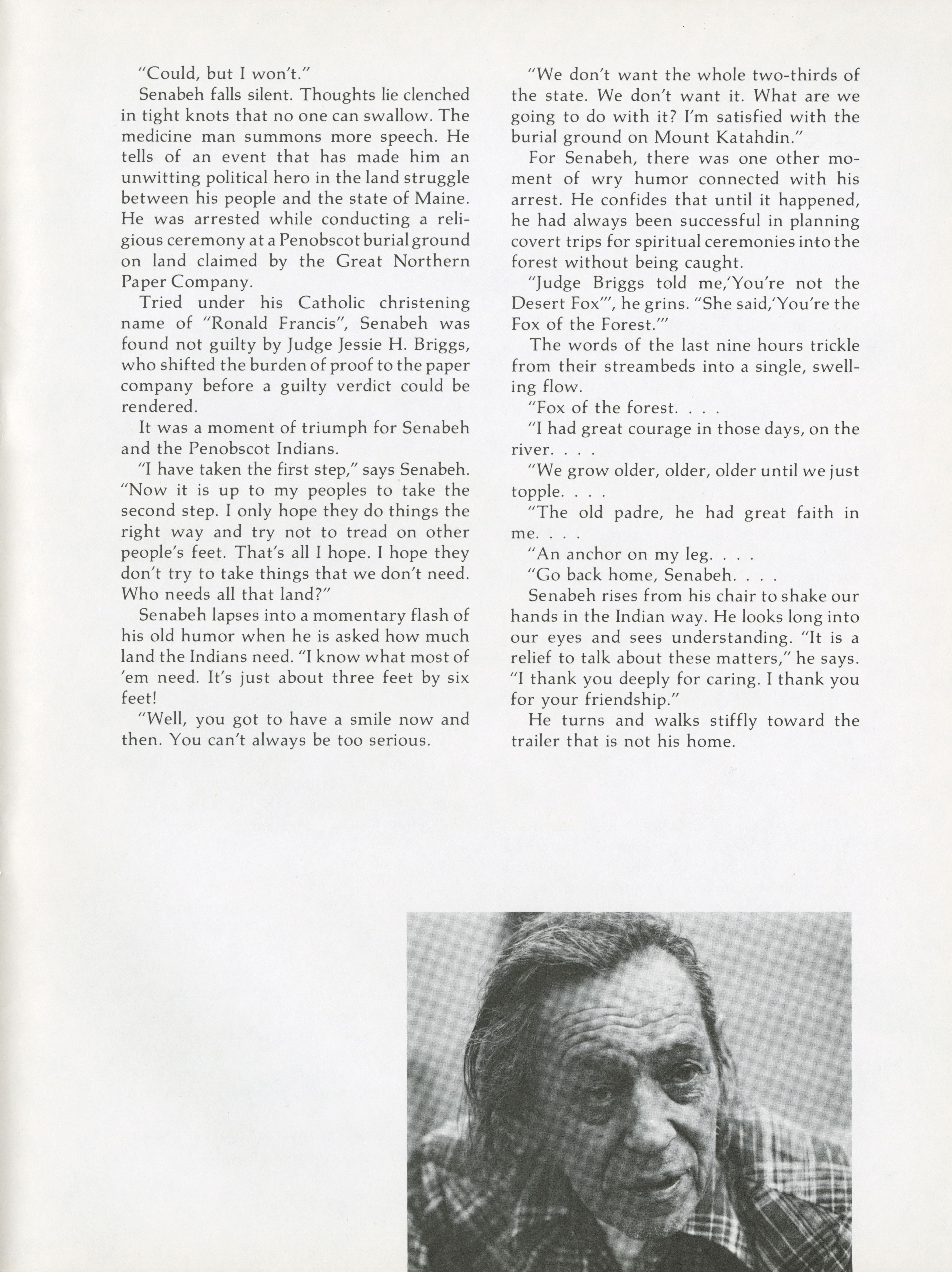 As the spiritual leader of the Penobscots, Senabeh believes he must make a last stand alongside his peoples. Pamela Wood speaks to Senabeh about how he defines his lonely Indianhood.