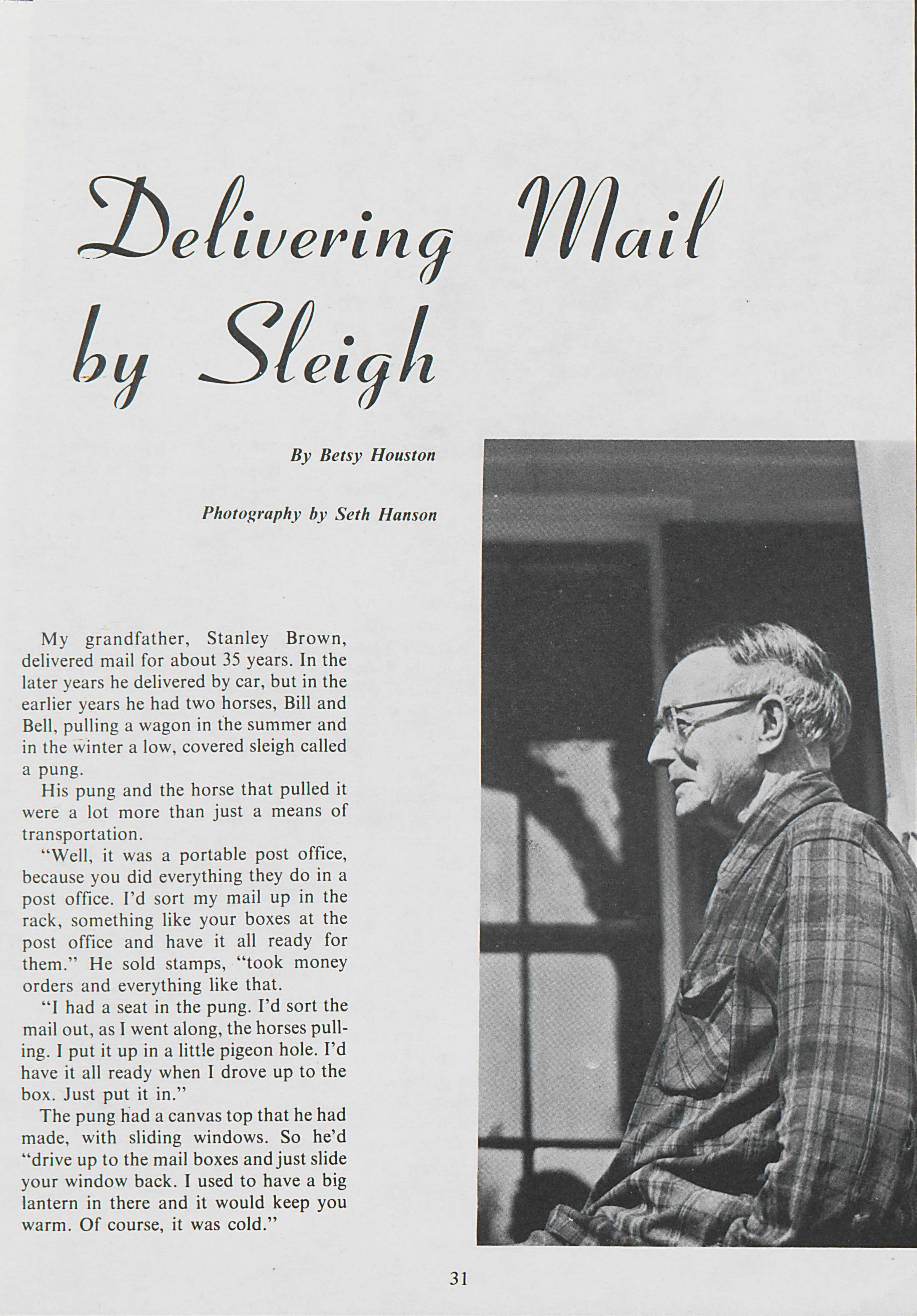 For about 35 years, Stanley Brown delivered by mail, both by car and sleigh. Betsy Houston documents Brown's work as a mailman.