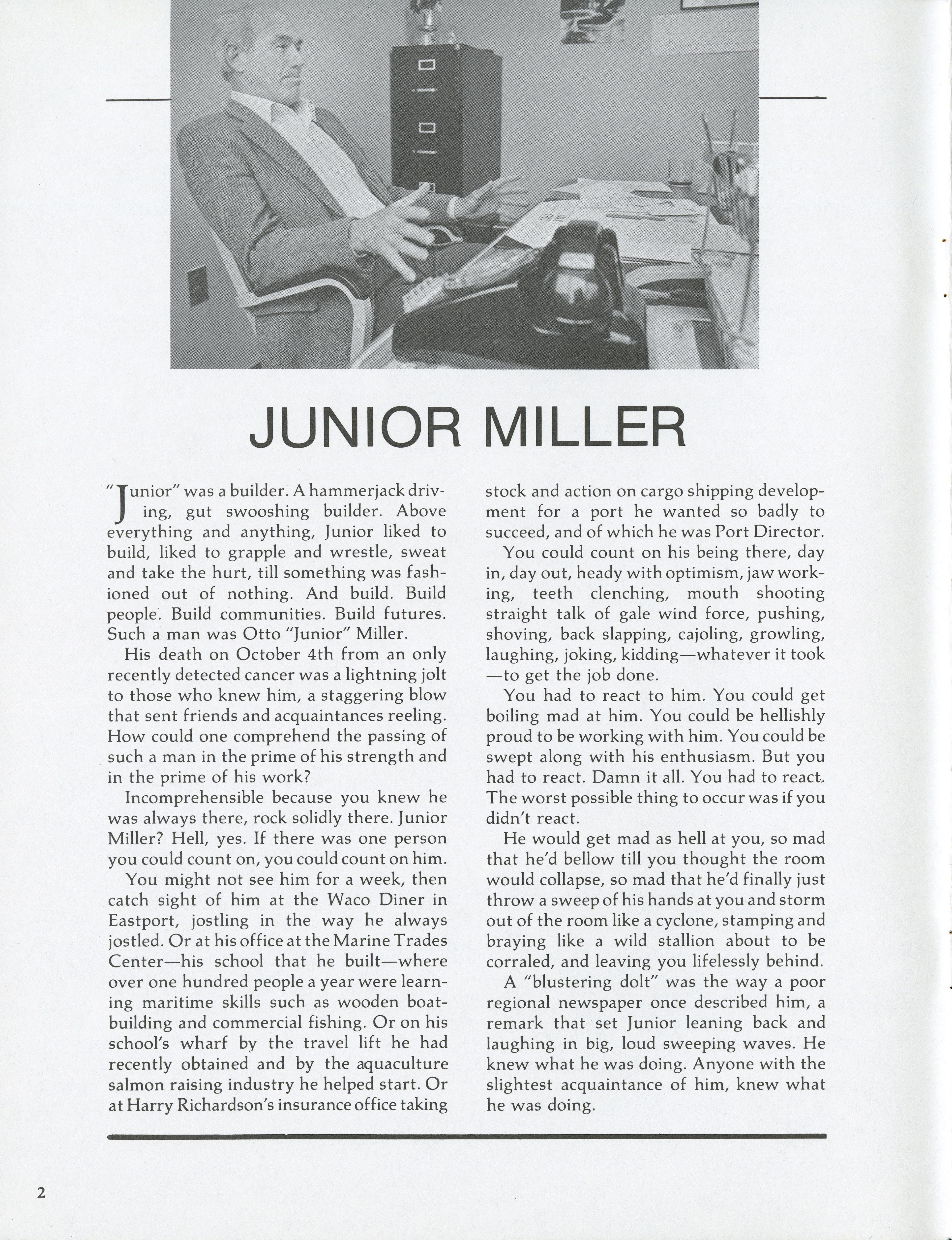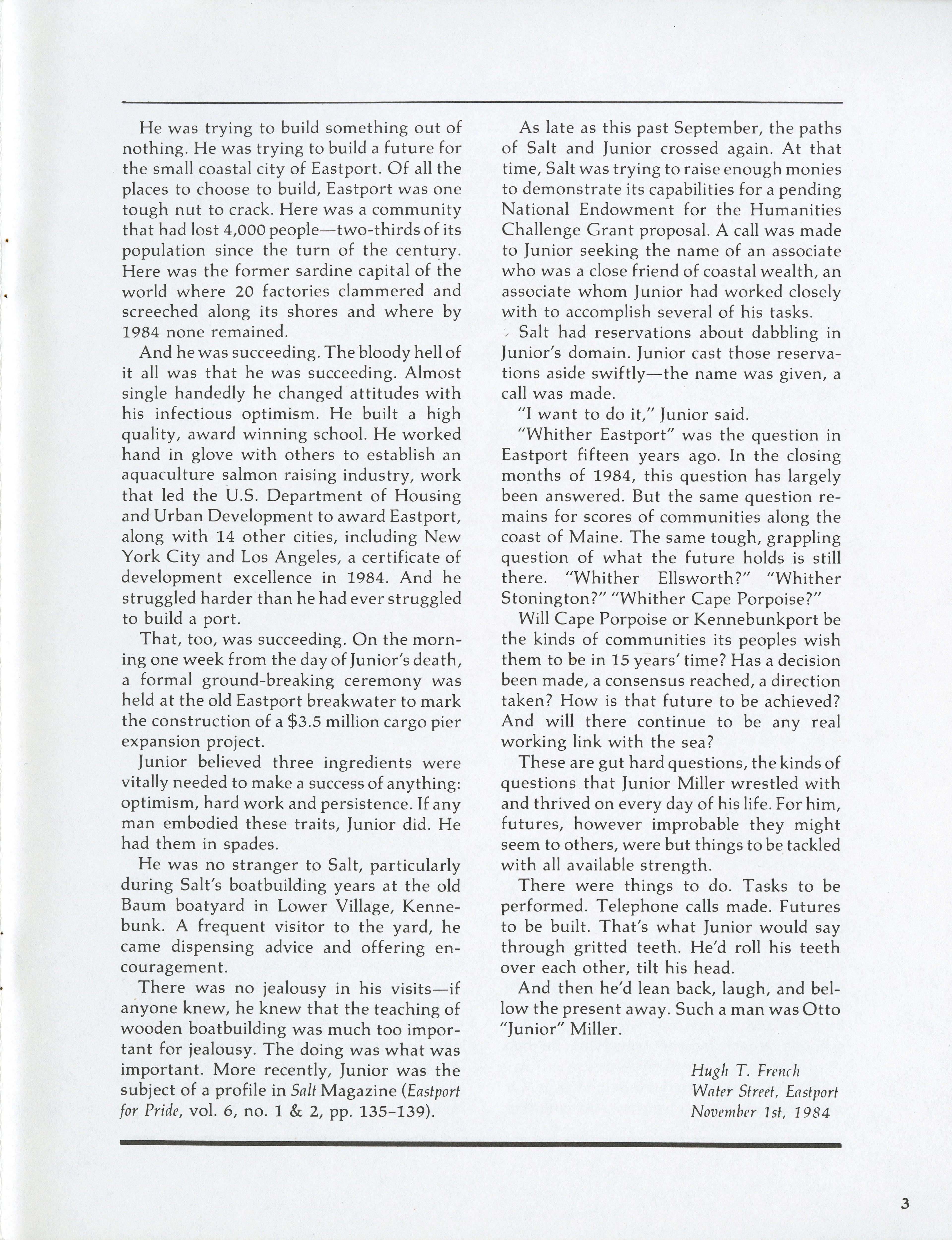 Hugh French pays homage to Junior Miller of Eastport. French speaks about Miller's character and his successes.