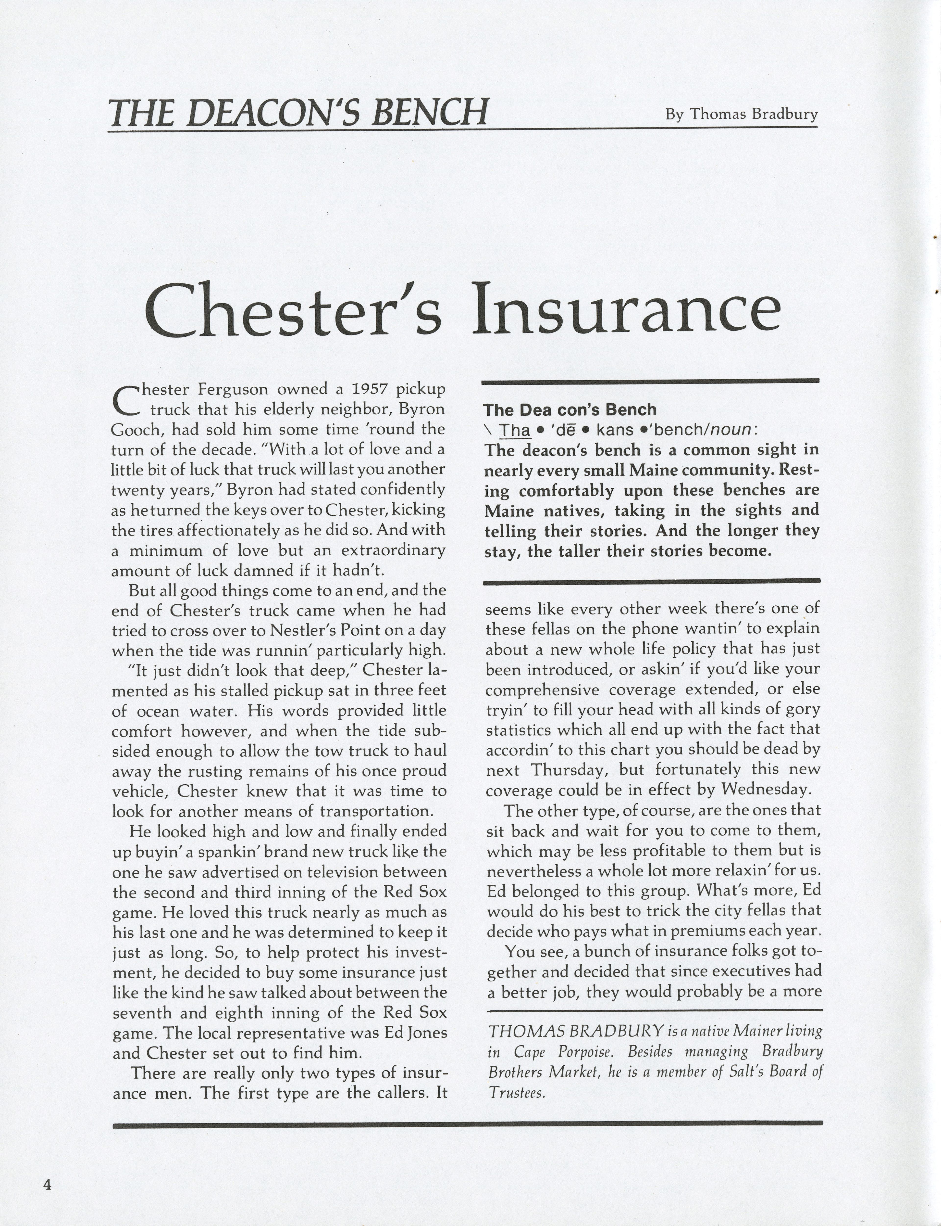 Column by Thomas Bradbury on Chester Ferguson's new truck, and trying to get insurance for it.