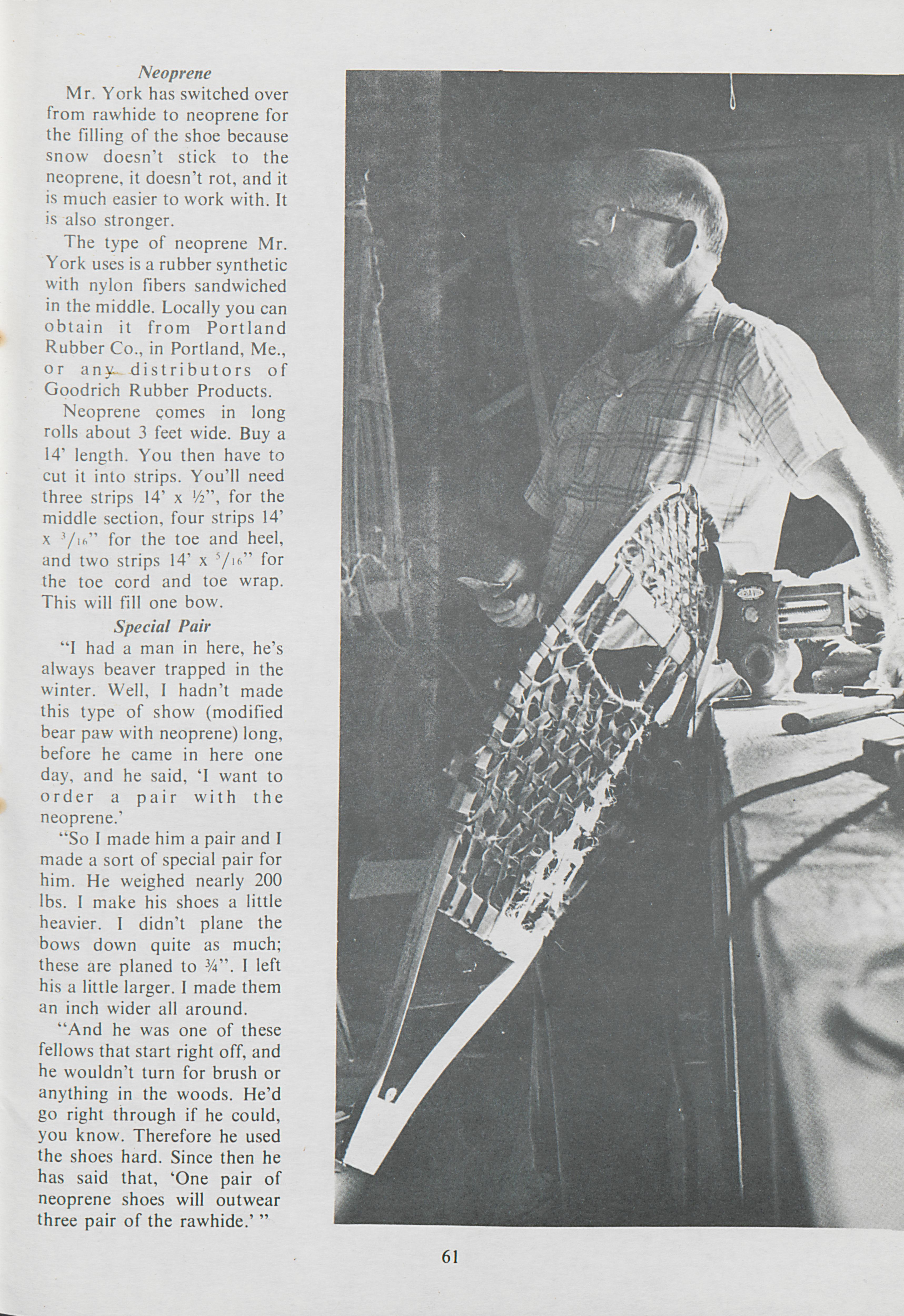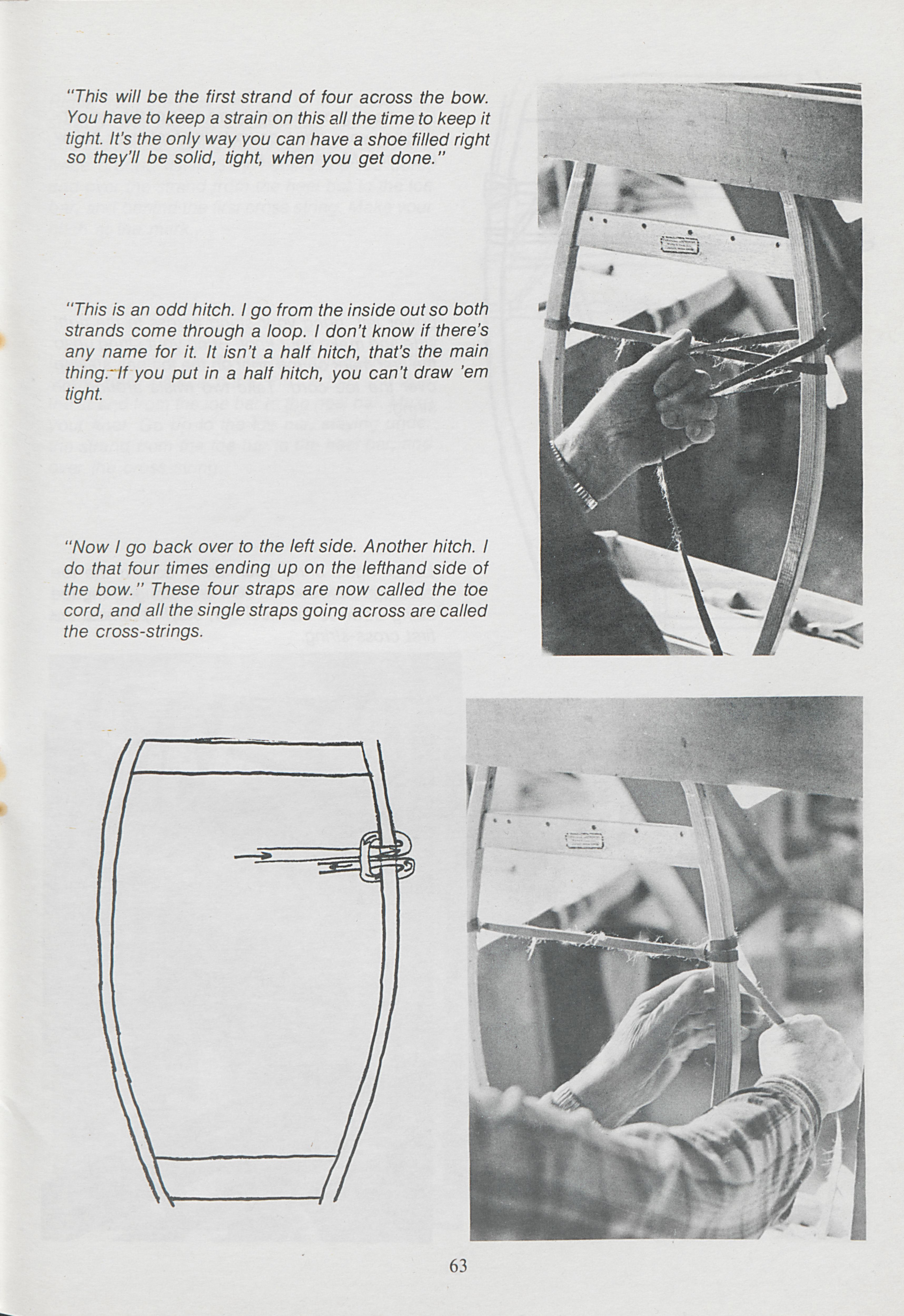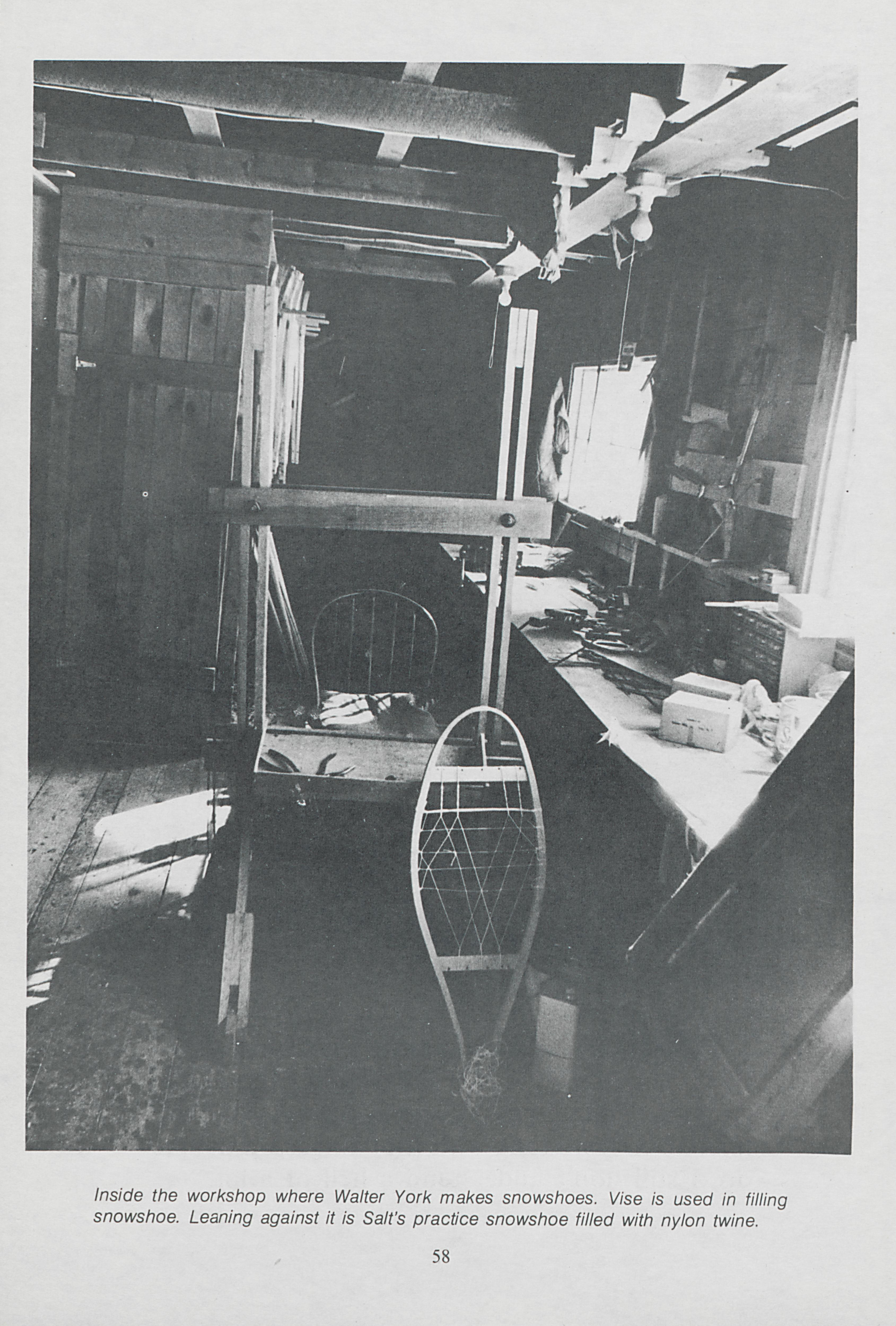 From his workshop in Caratunk, Walter York creates snowshoes. Anne Gorham covers the steps of filling the bows for snowshoes.