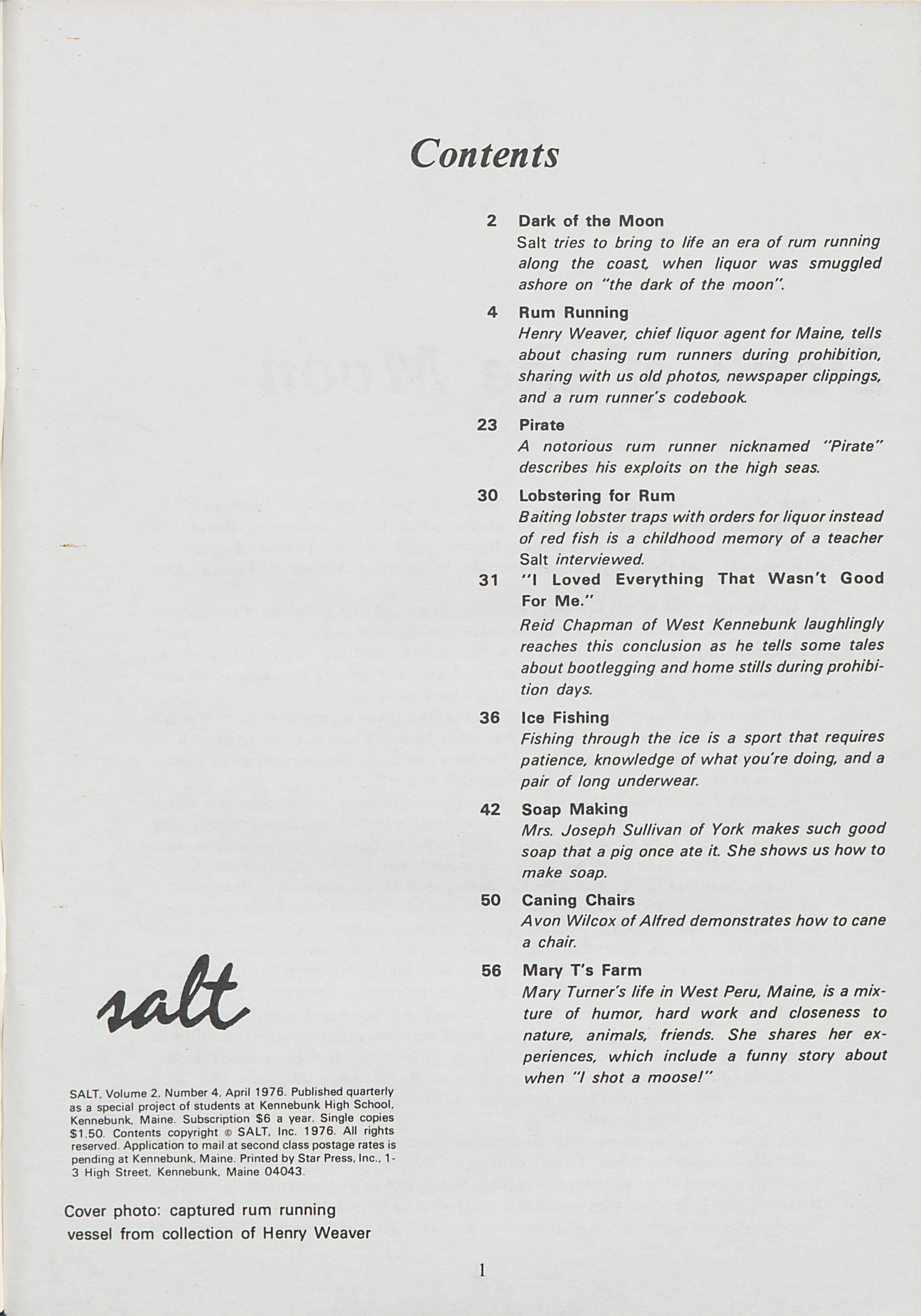 Table of contents for April 1976 Salt Magazine.