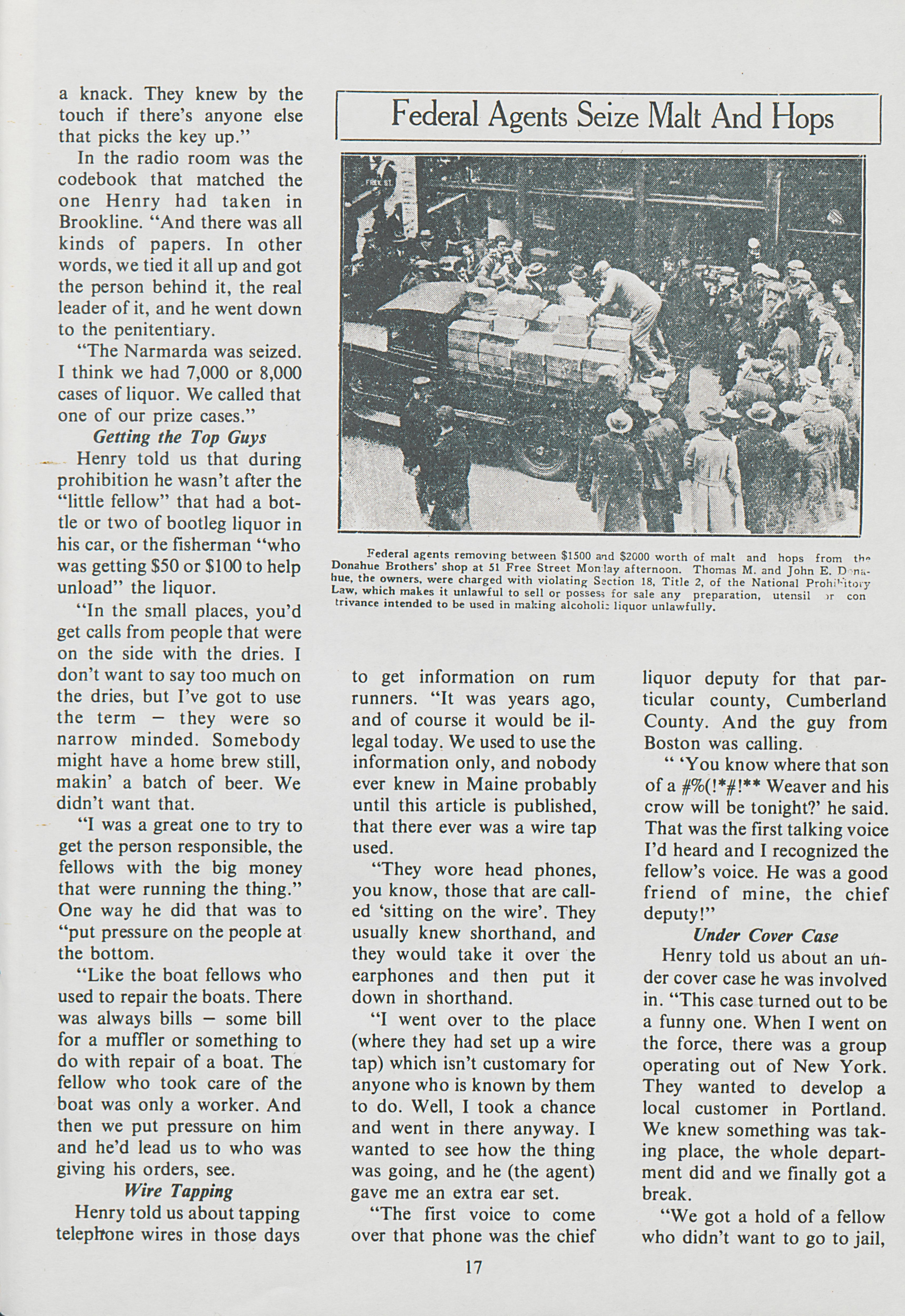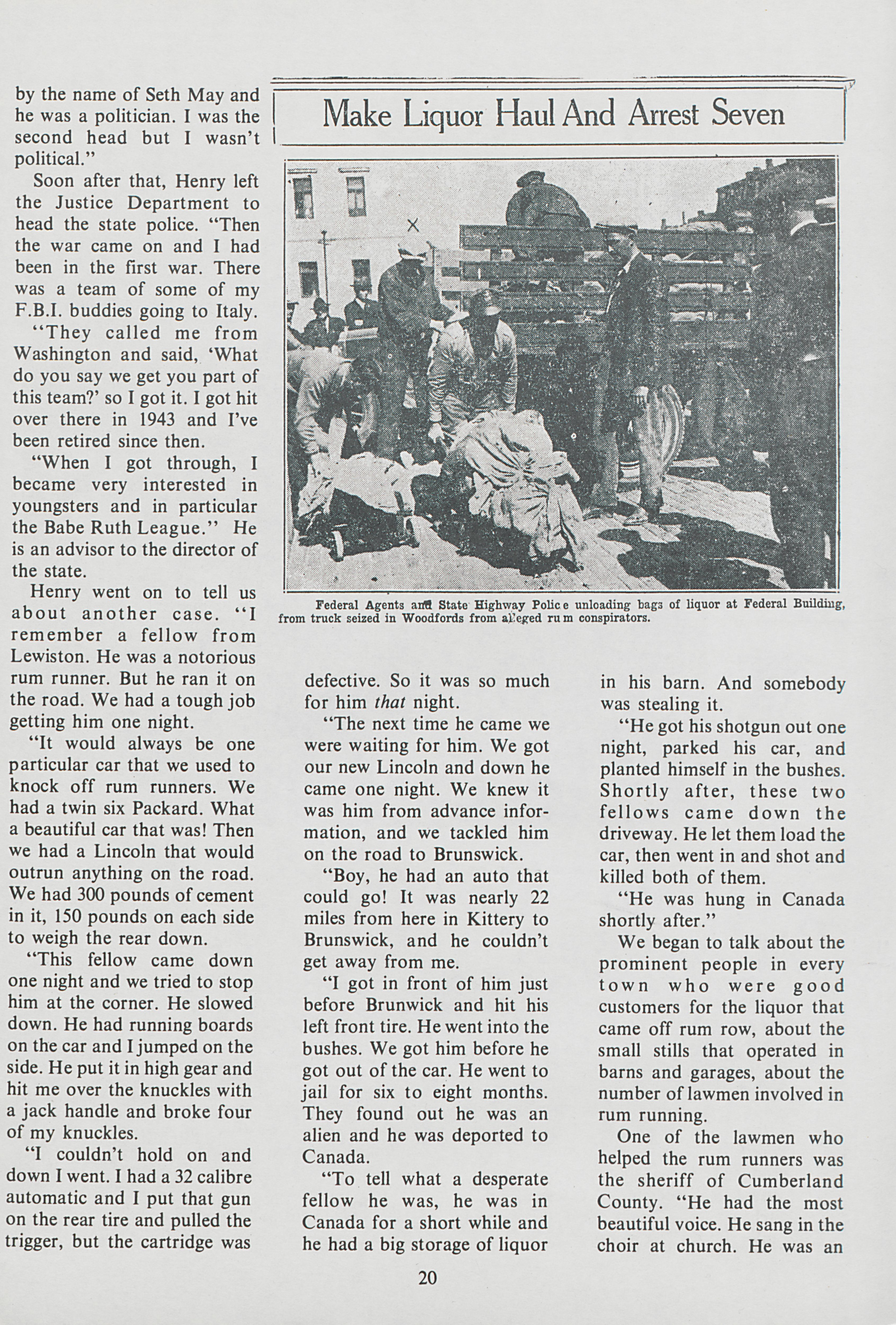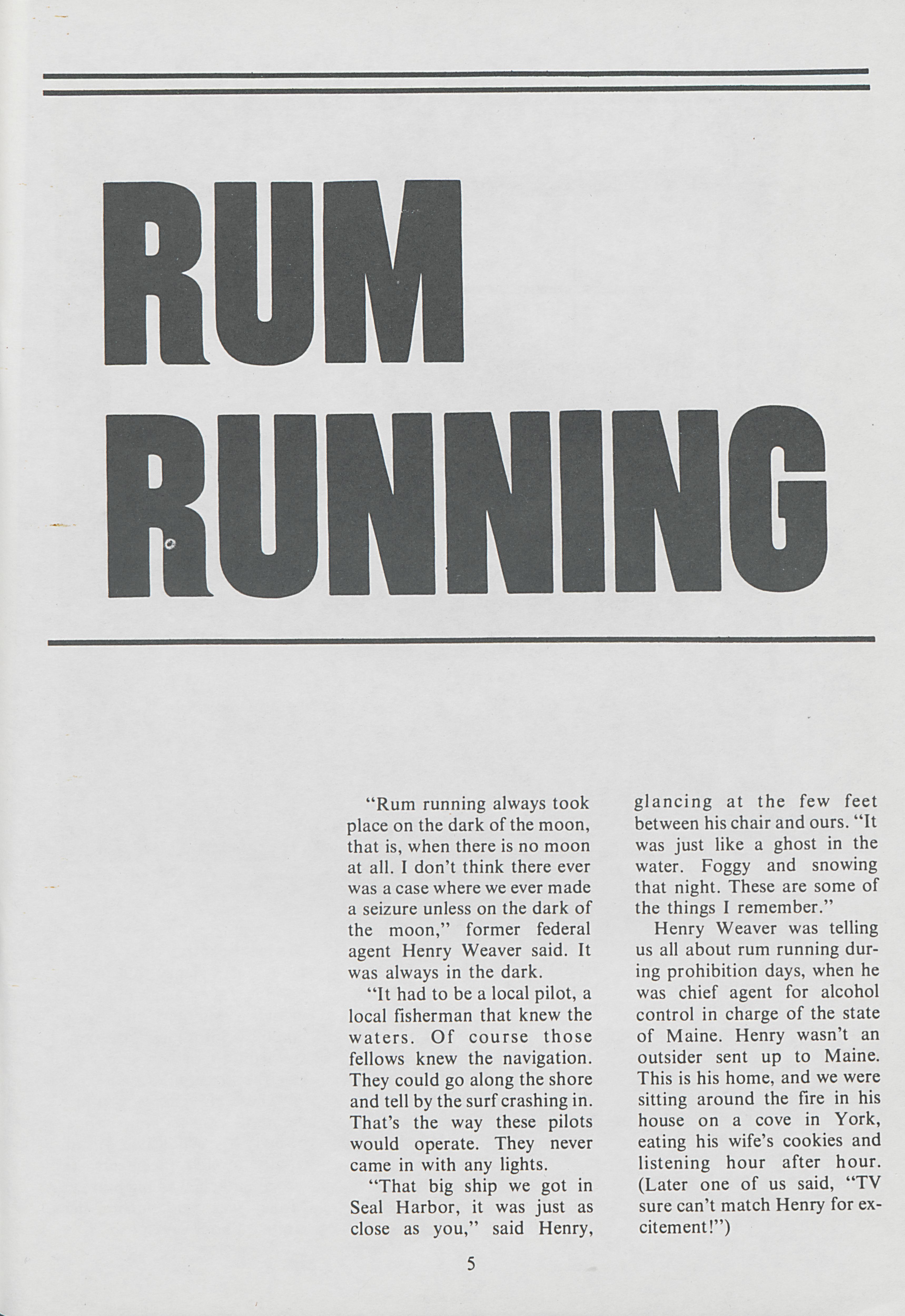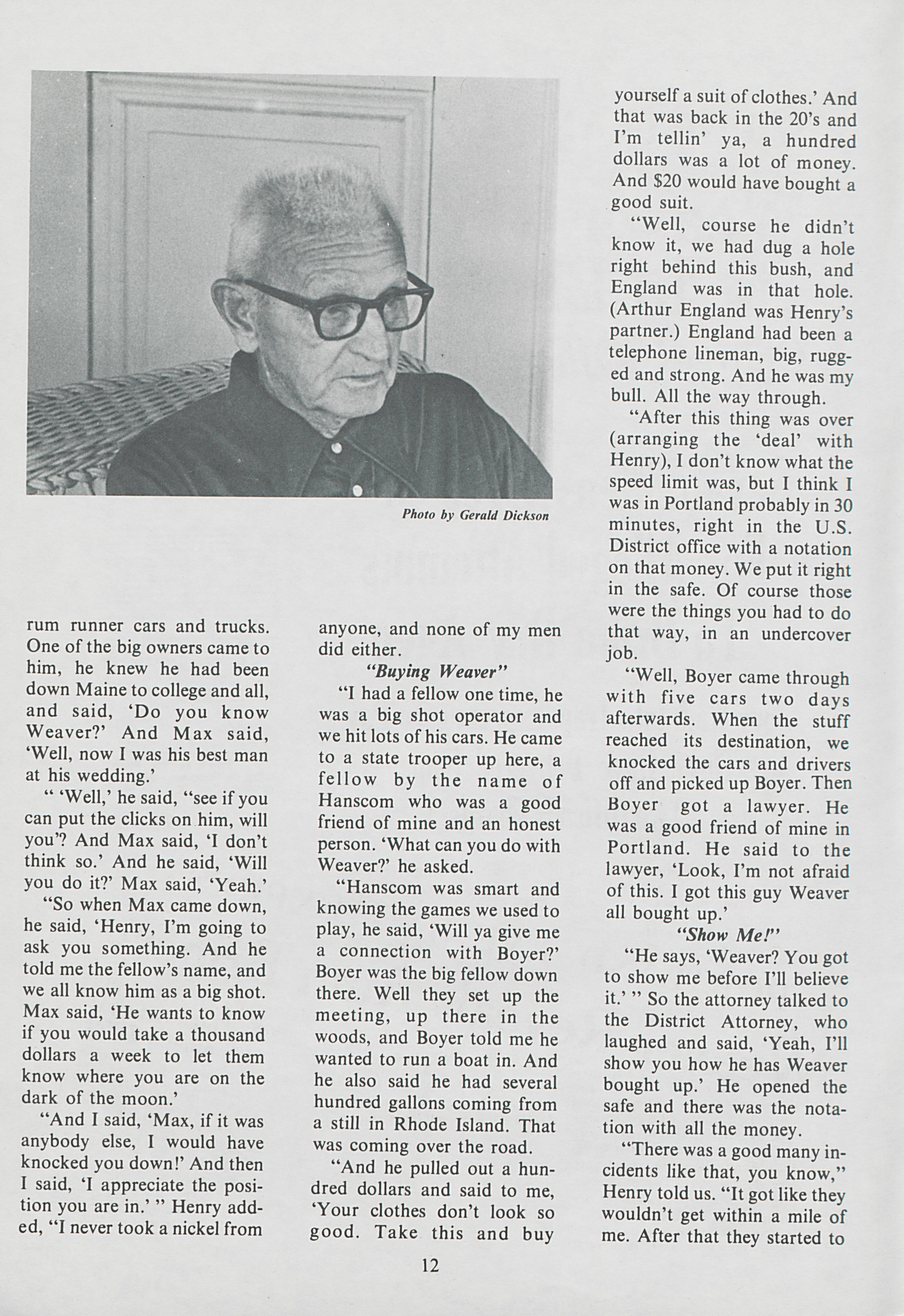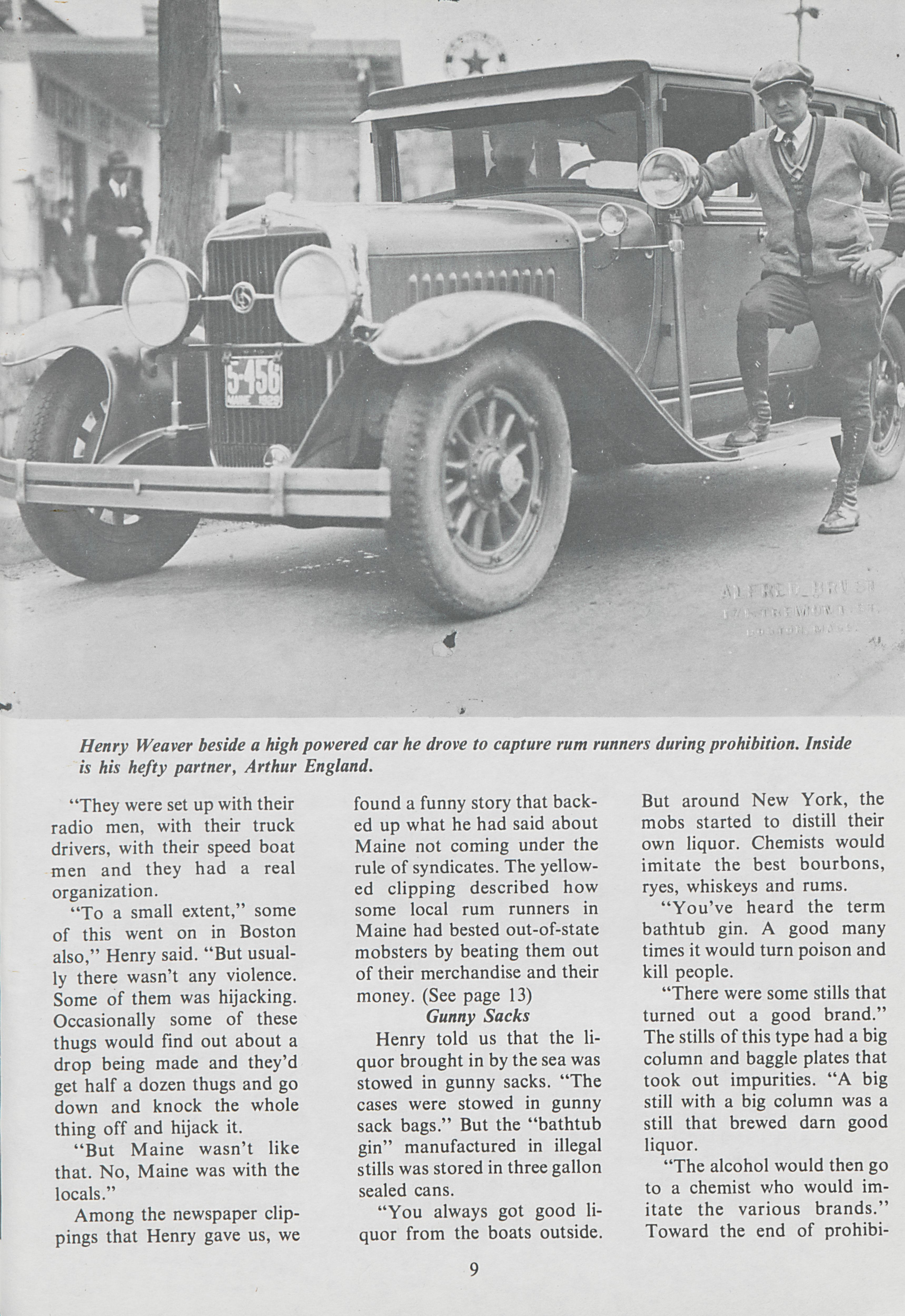 As the chief agent for alcohol control in charge of the state of Maine, Henry Weaver experienced different situations with rum running. Keith Euler and others from Salt speak to Weaver about his experiences and stories as a federal officer during the prohibition era.