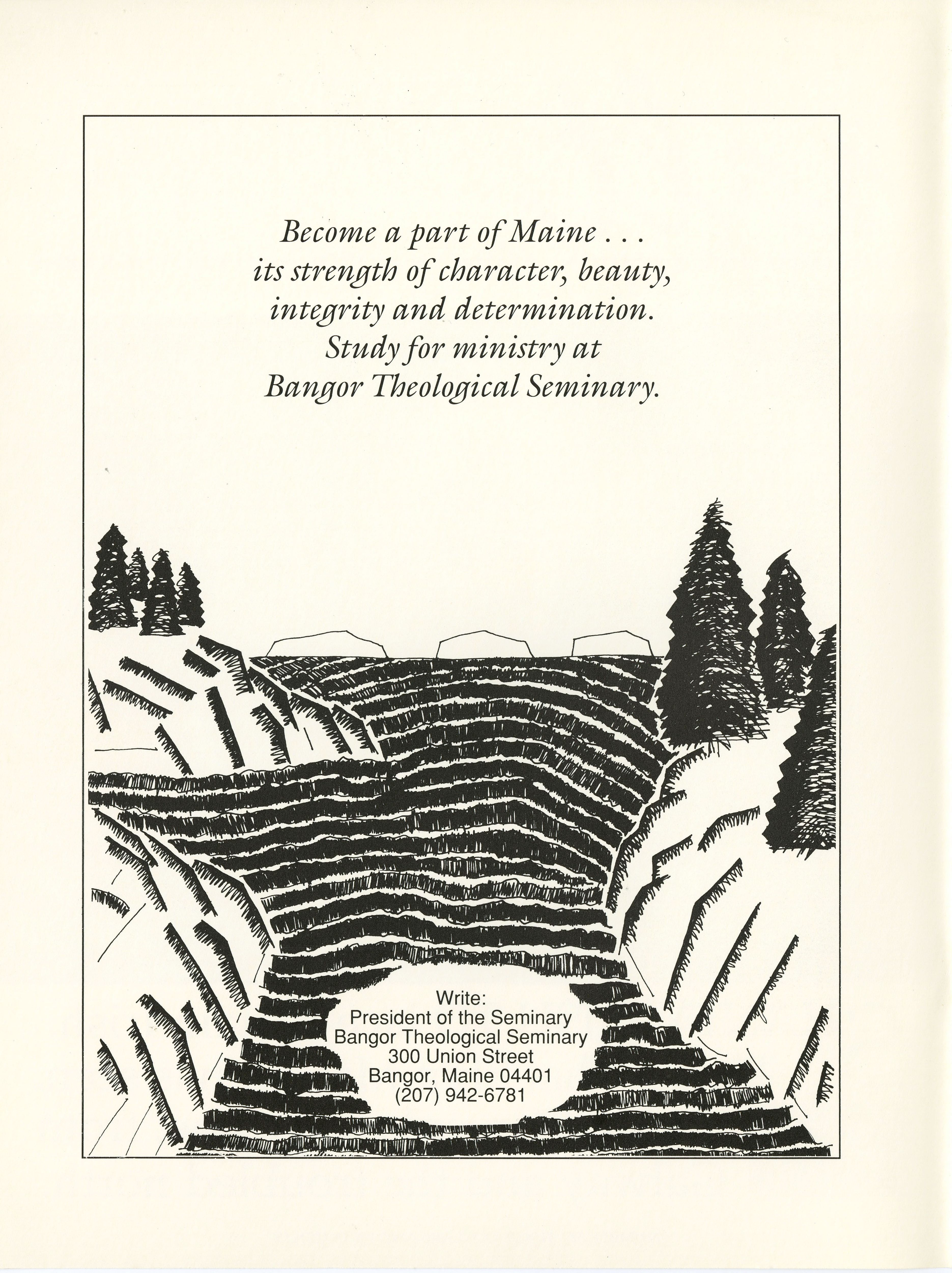 Inside front cover for the April 1990 Salt Magazine, with advertisement for the Bangor Theological Seminary.