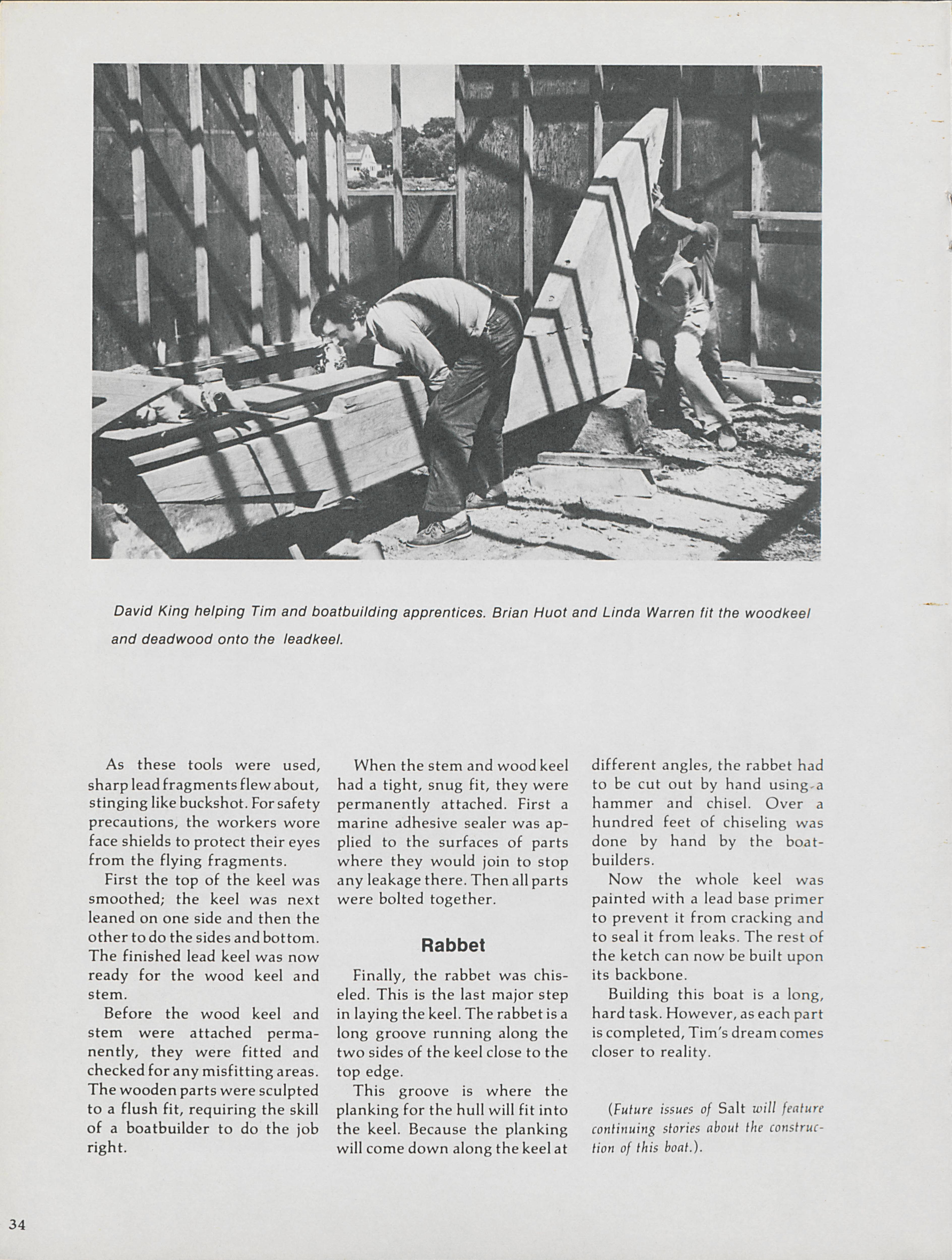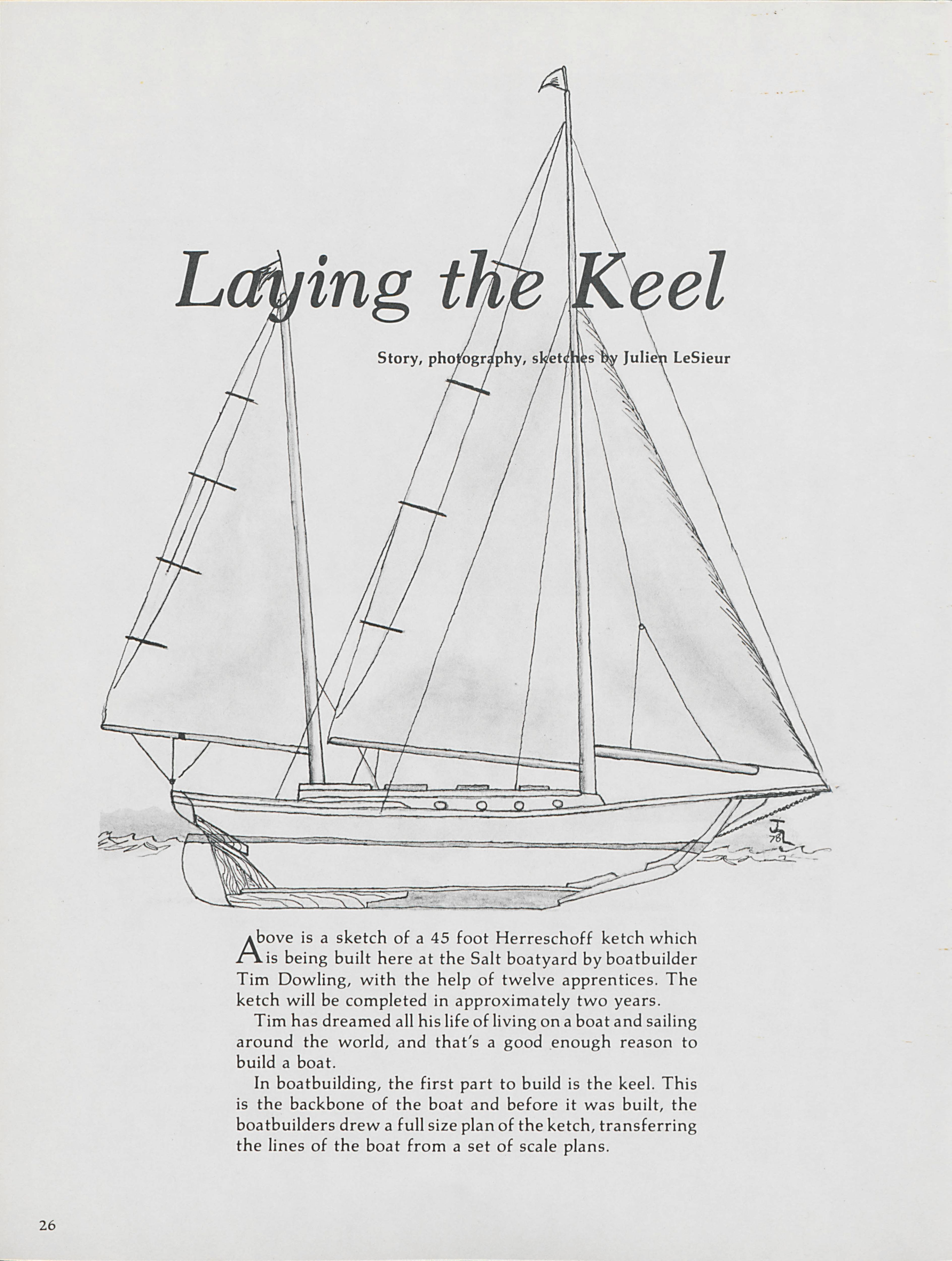 At the Salt boatyard in Kennebunk, Tim Dowling is working with twelve apprentices to create a 45 foot Herreshoff ketch. Julien LeSieur documents the work Dowling has done and the steps that need to be taken to complete the project.