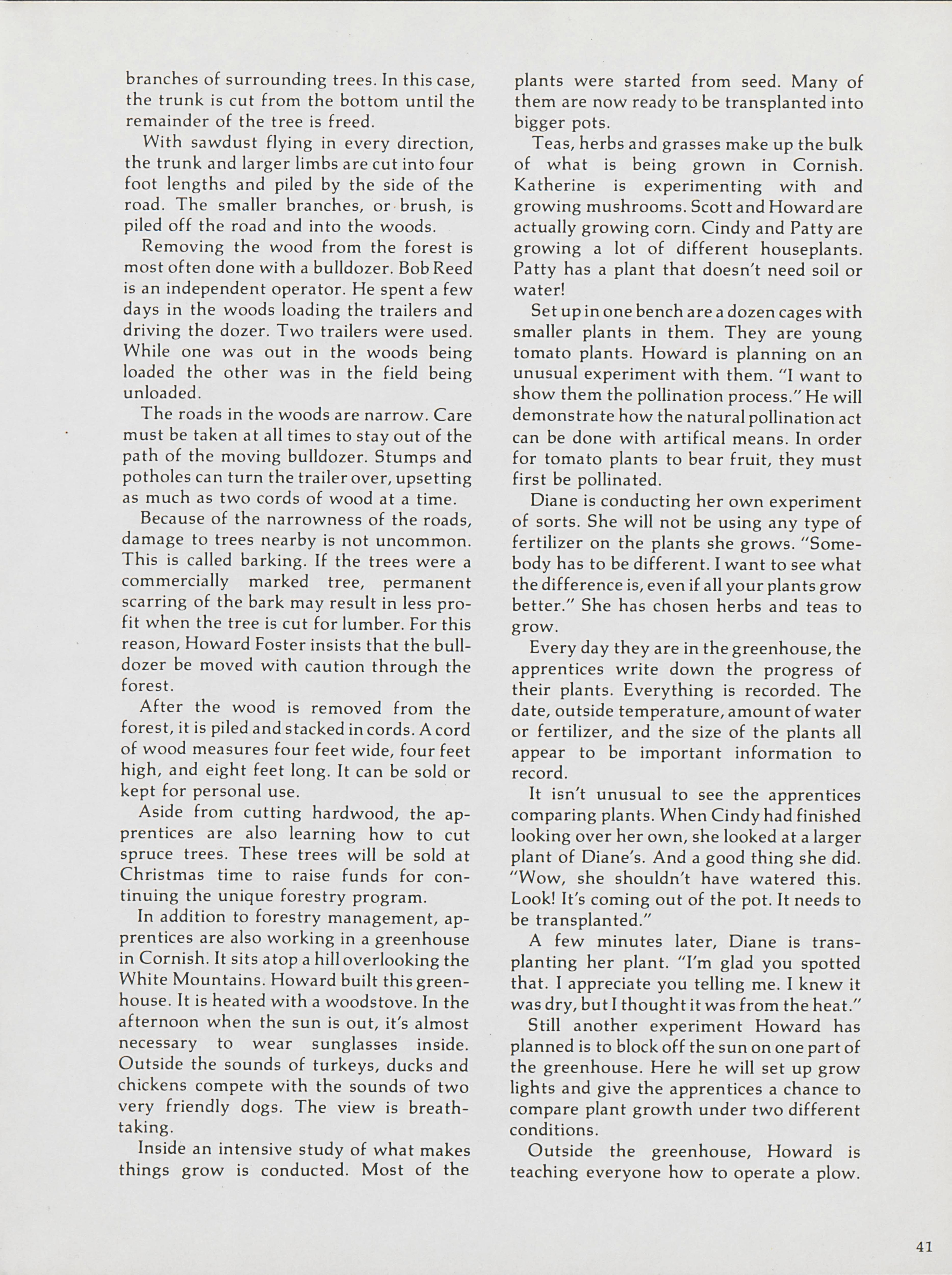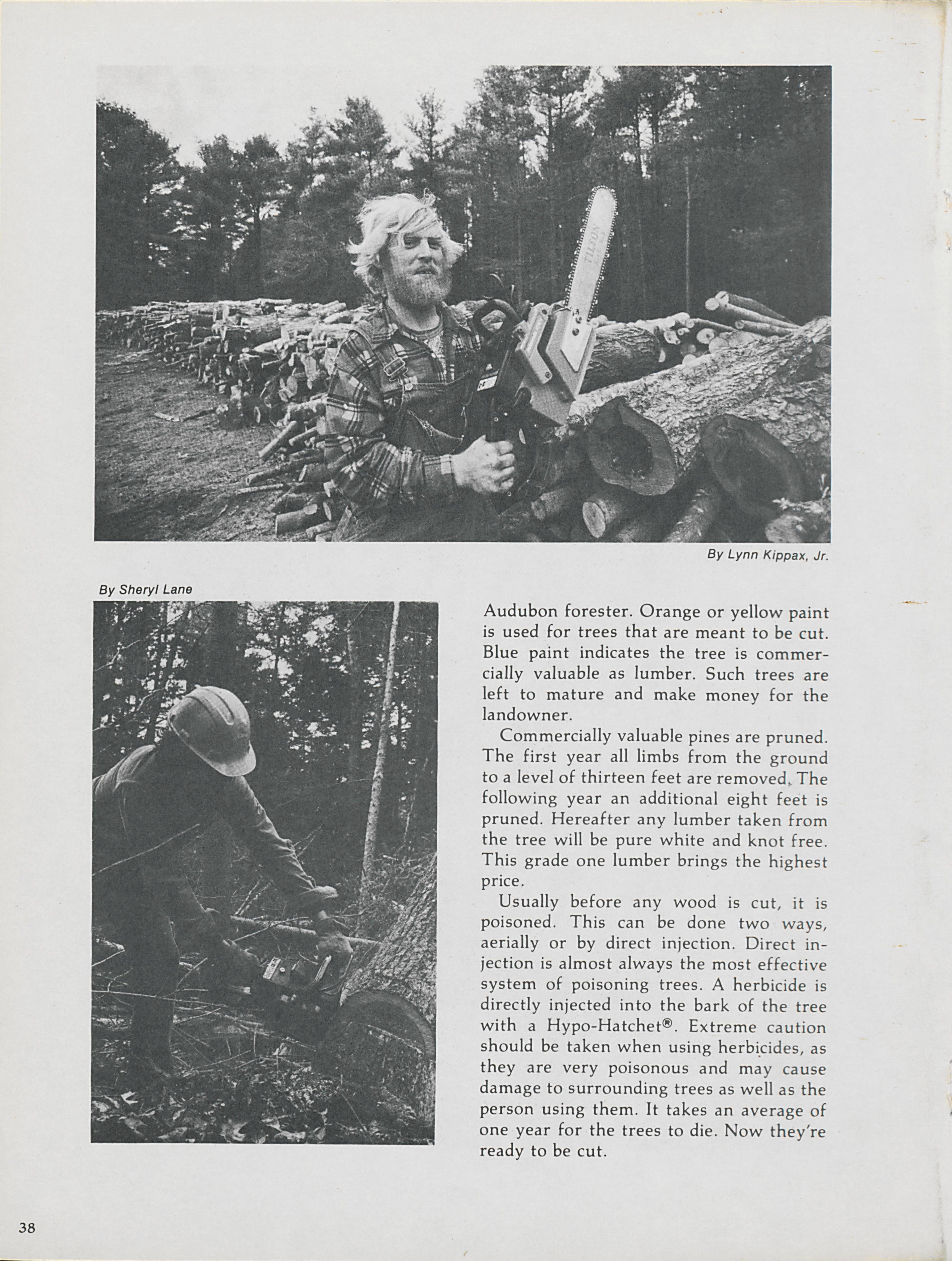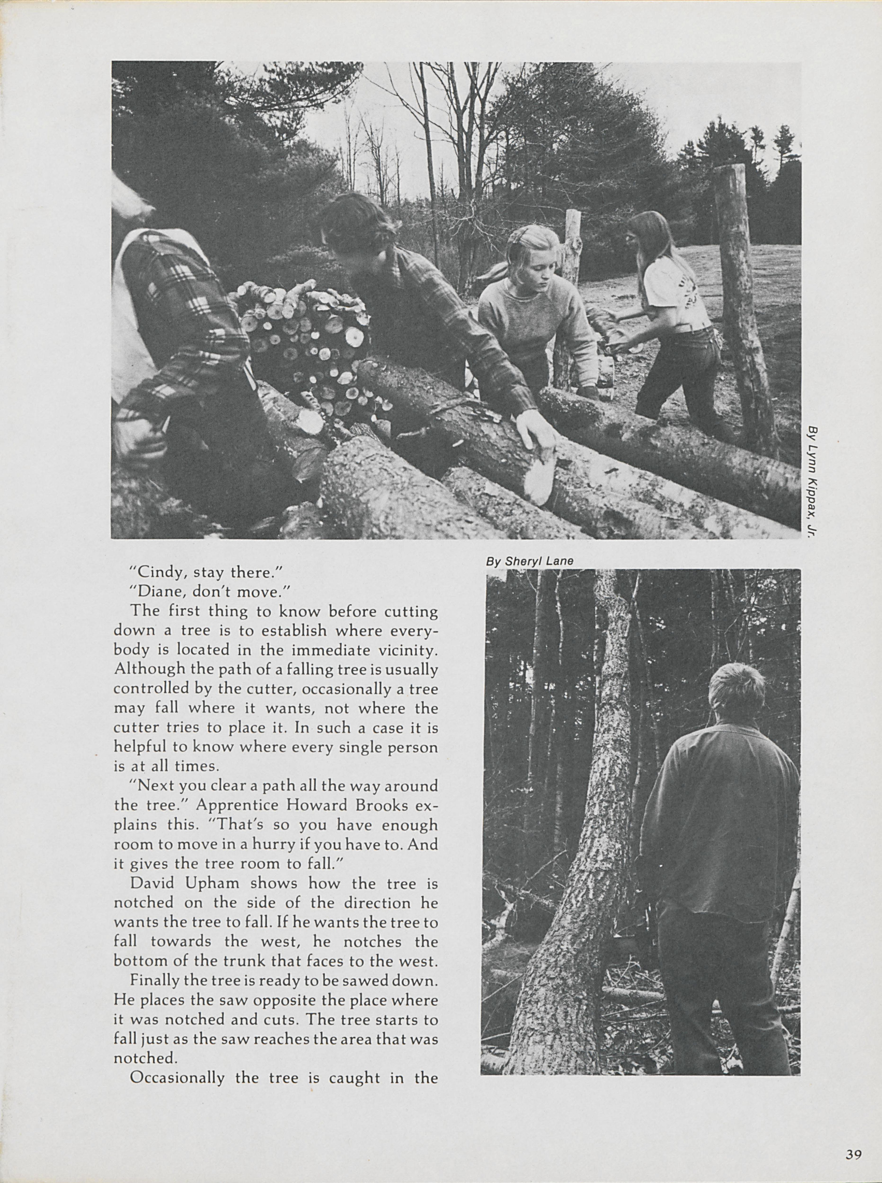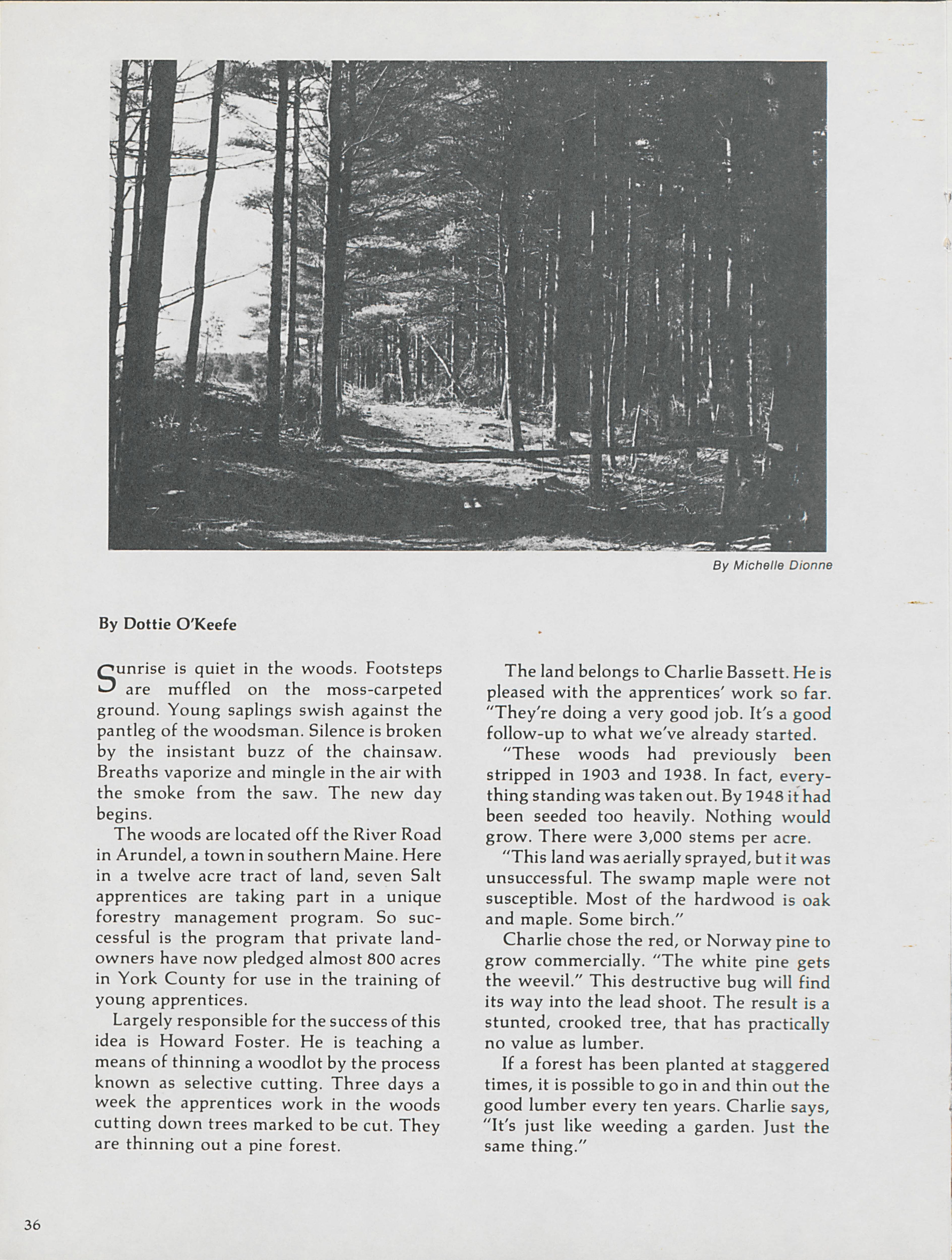 In the woods of Arundel in southern Maine, seven Salt apprentices took part in a forestry management program. Dottie O'Keefe documents the work that the Salt students performed in the woods, learning about the process of selective cutting.