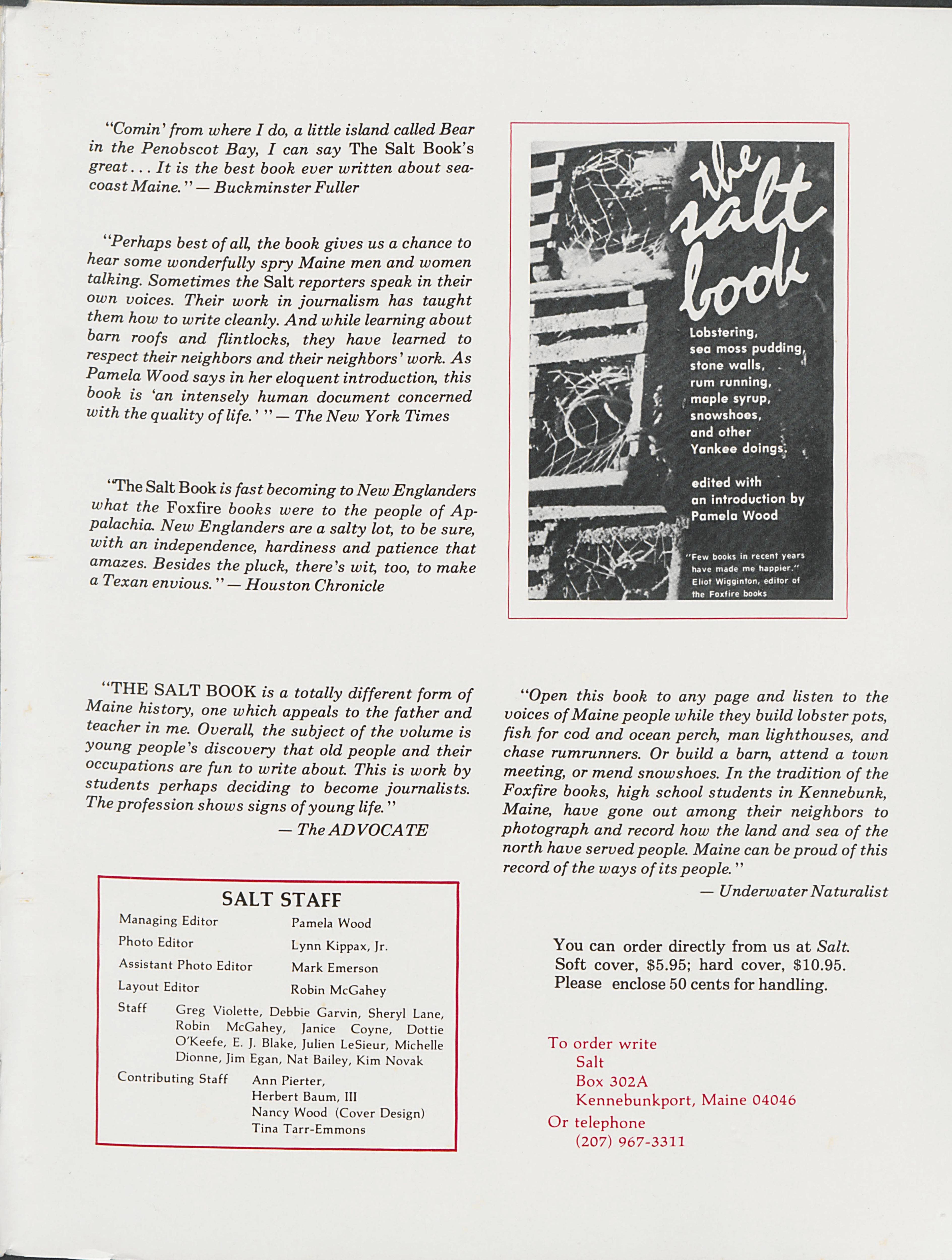 Testimonials page for The Salt Book on the inside back cover of the December 1978 Salt Magazine.