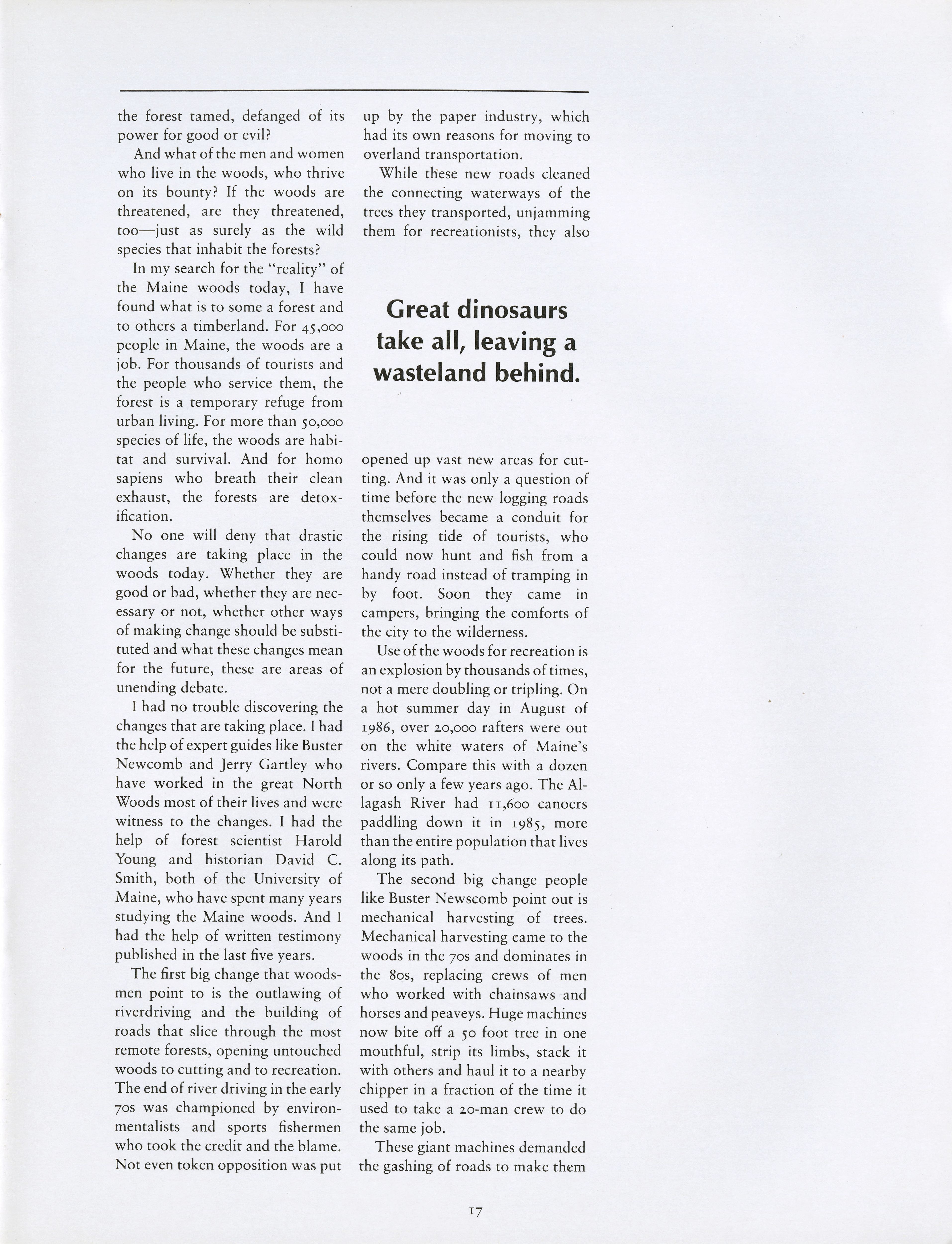 As Maine's largest myth, the Great North Woods provides questions about the Woods of today and tomorrow. Nancy Jesser explores which of these myths will survive over time.