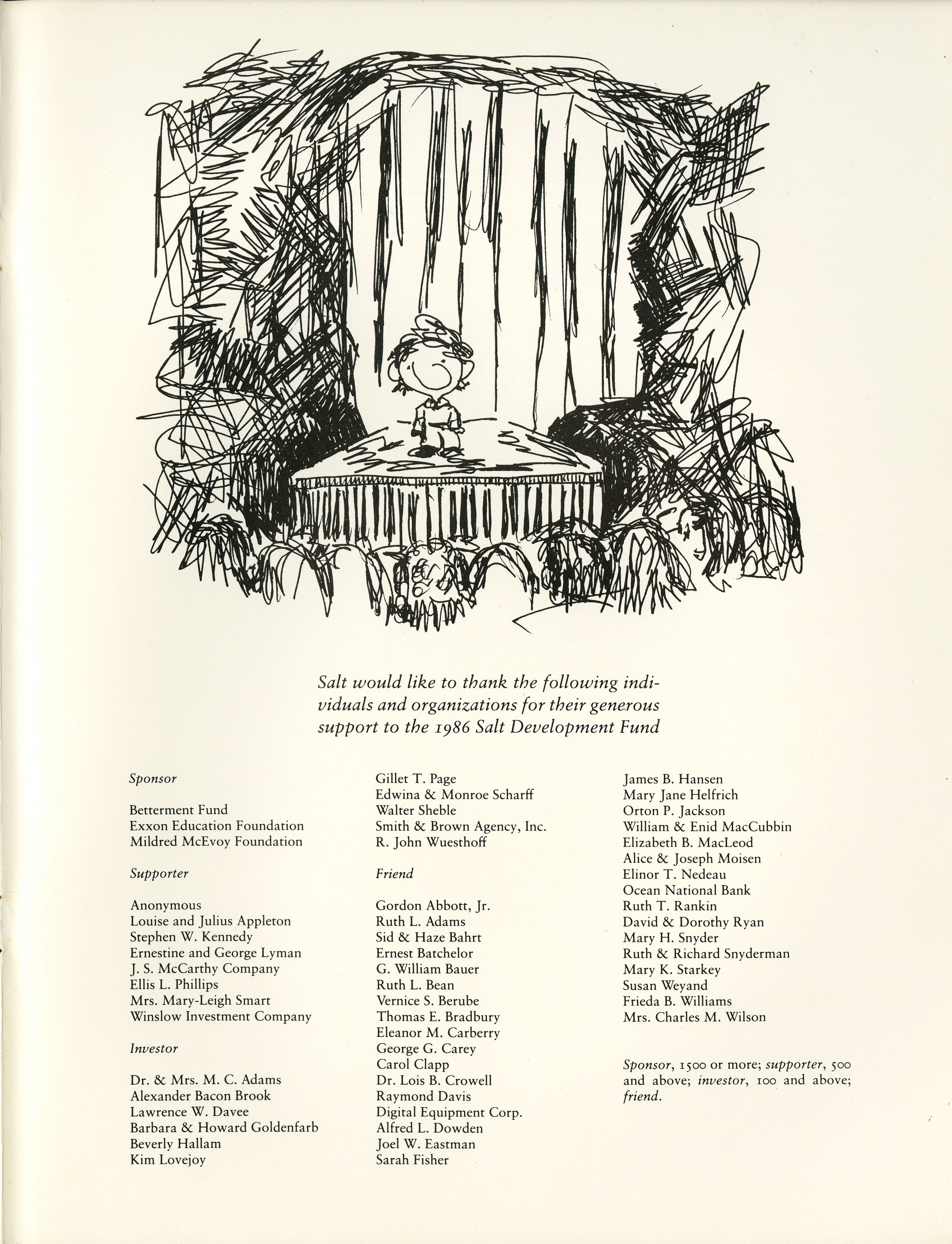 Inside back cover for the June 1987 Salt Magazine, offering thanks to individuals and organizations for supporting the 1986 Salt Development Fund.