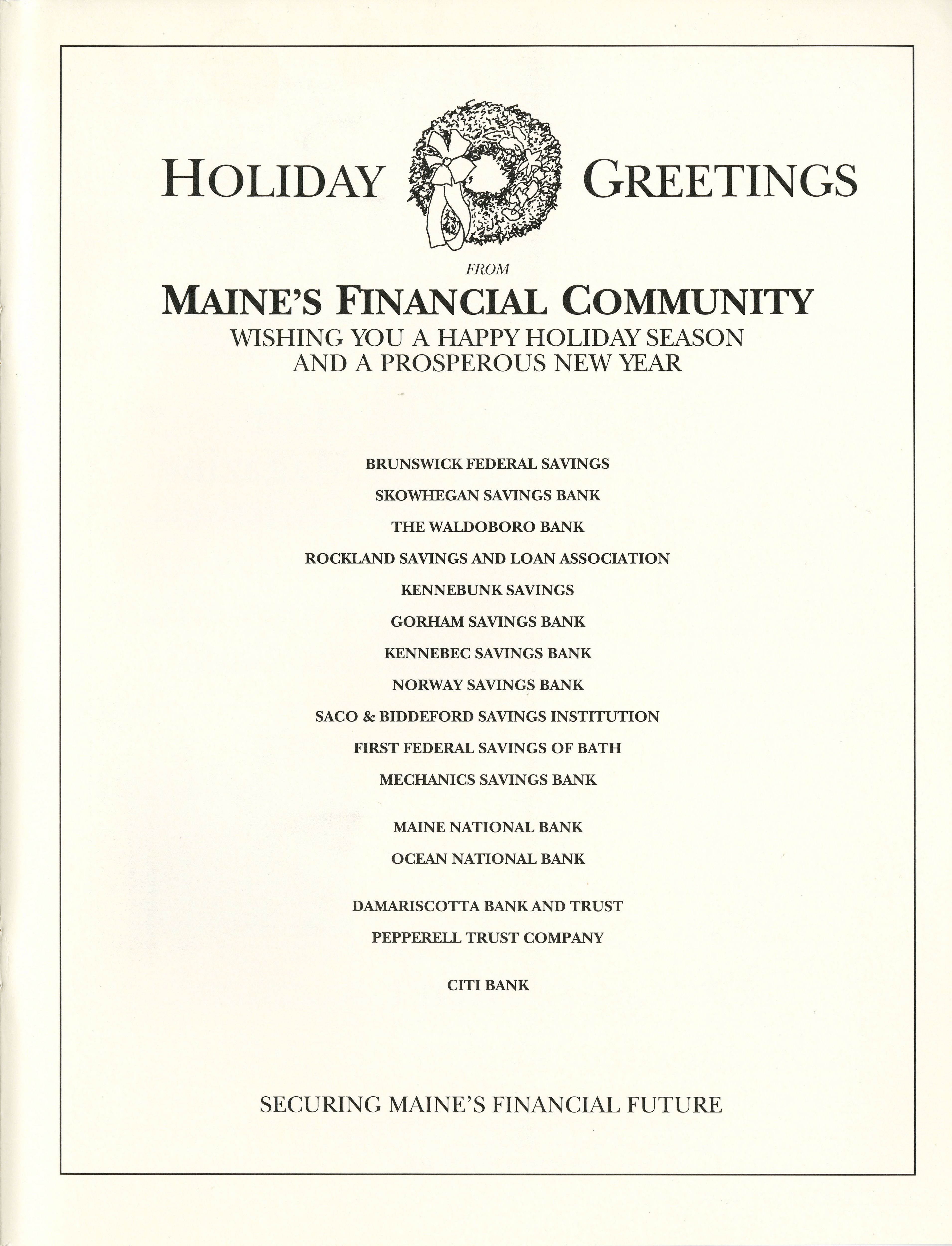 Inside back cover for the December 1990 Salt Magazine, with holiday greetings from Maine's financial community.