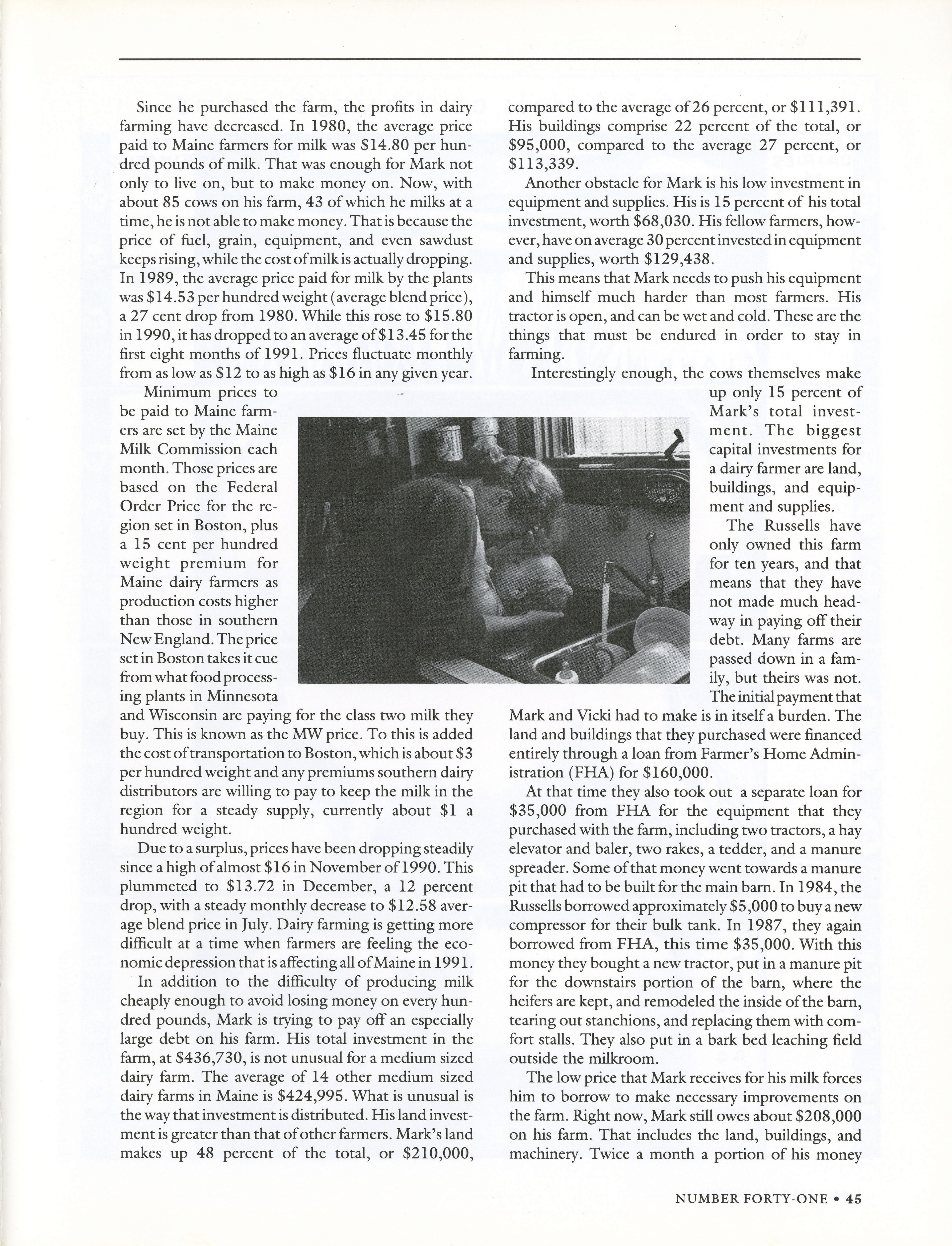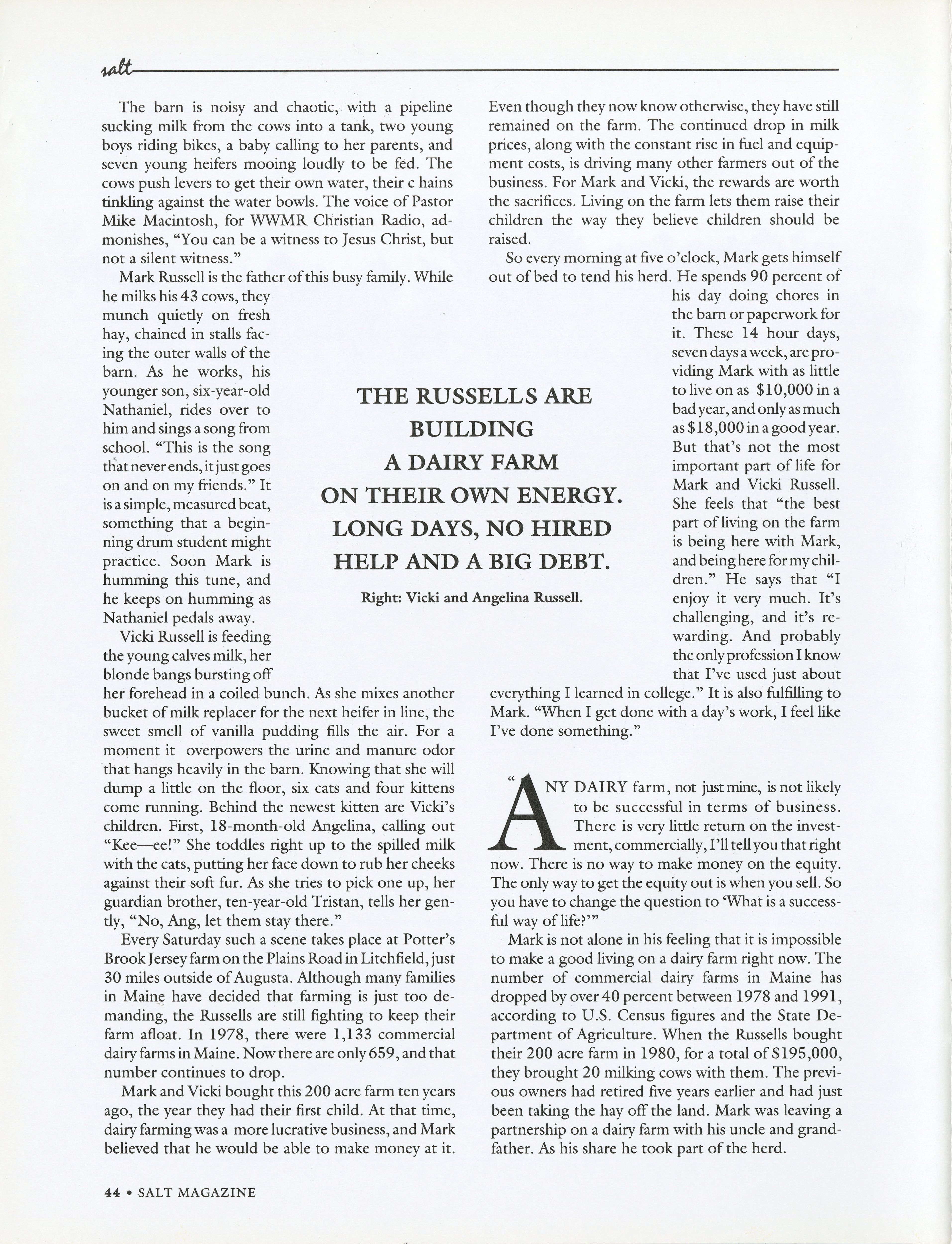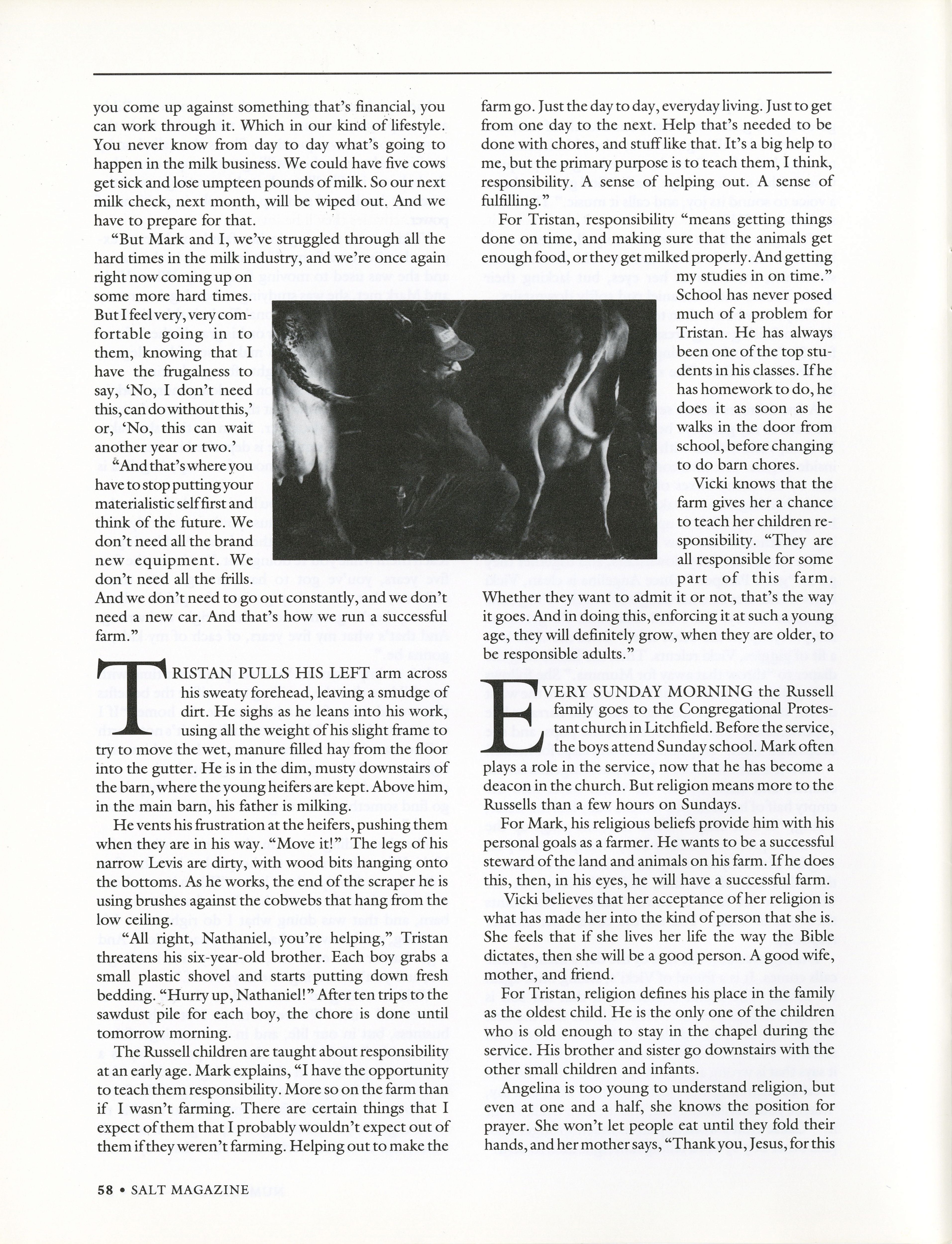 Despite the challenges facing dairy farmers, the Russell family fights to keep their farm going. Anna Hoberman documents the lives of the Russell family and their work on their dairy farm in Litchfield.