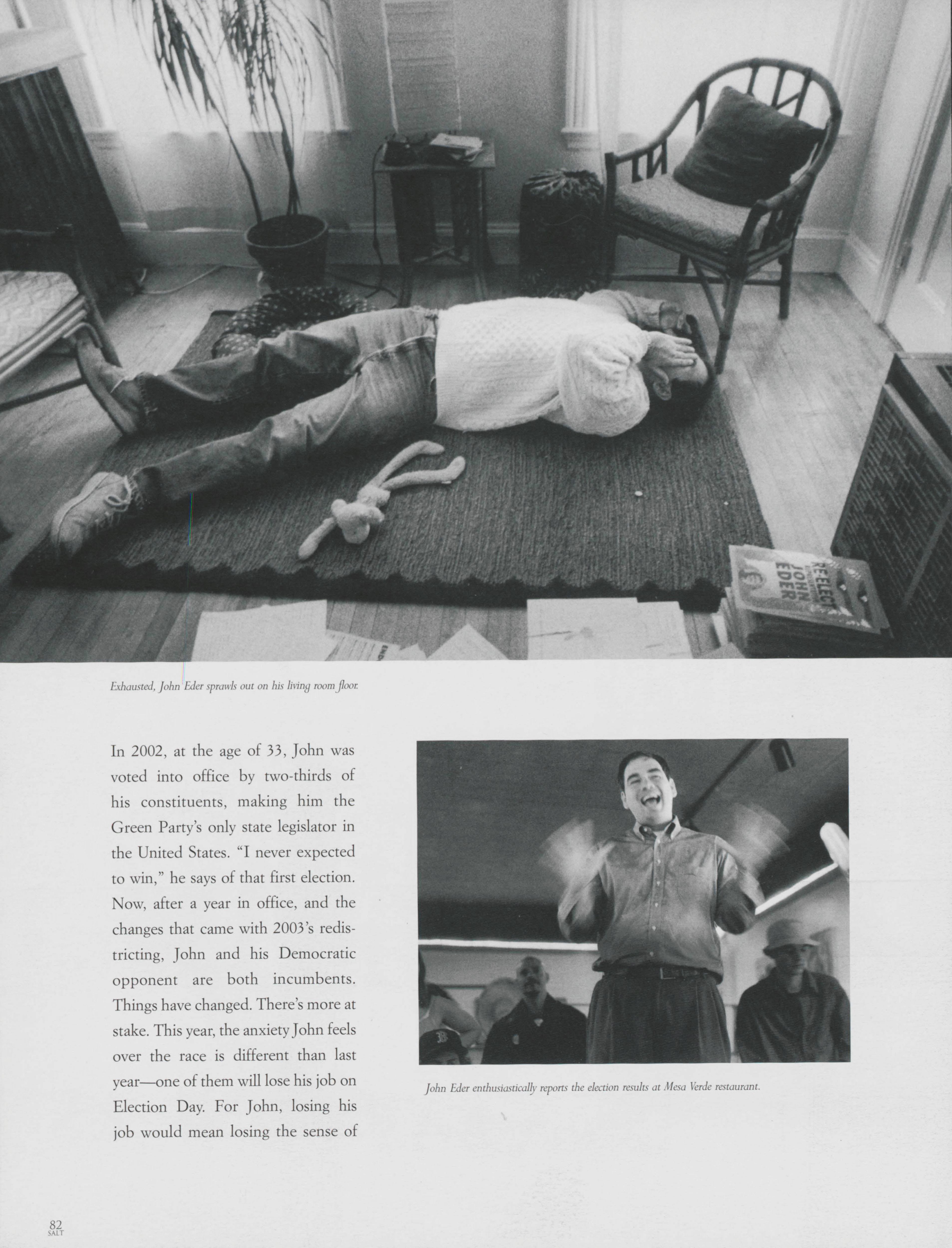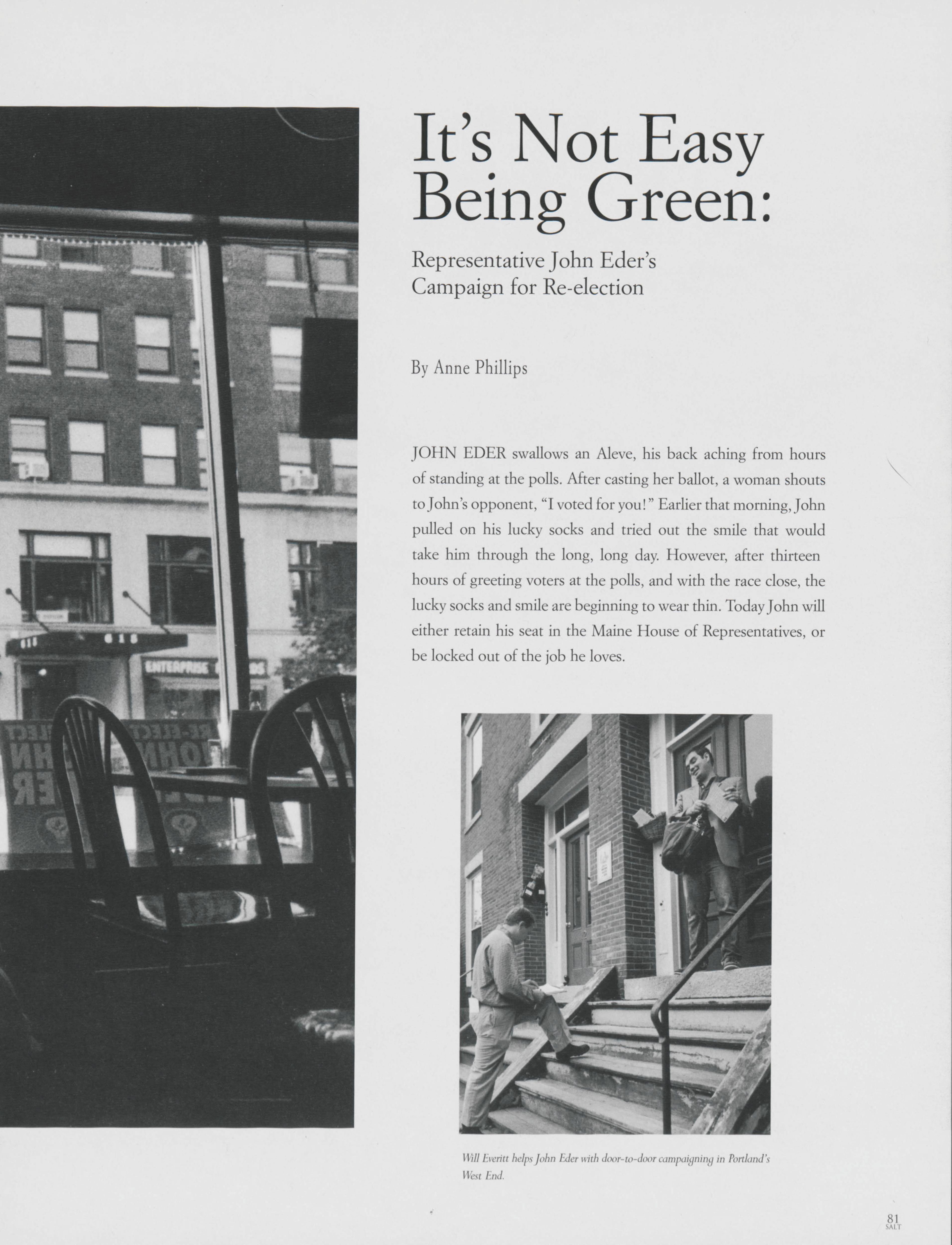 As the only Green Party legislator in the state of Maine, John Eder is running for re-election. Anne Phillips captures the work Eder does on his campaign.