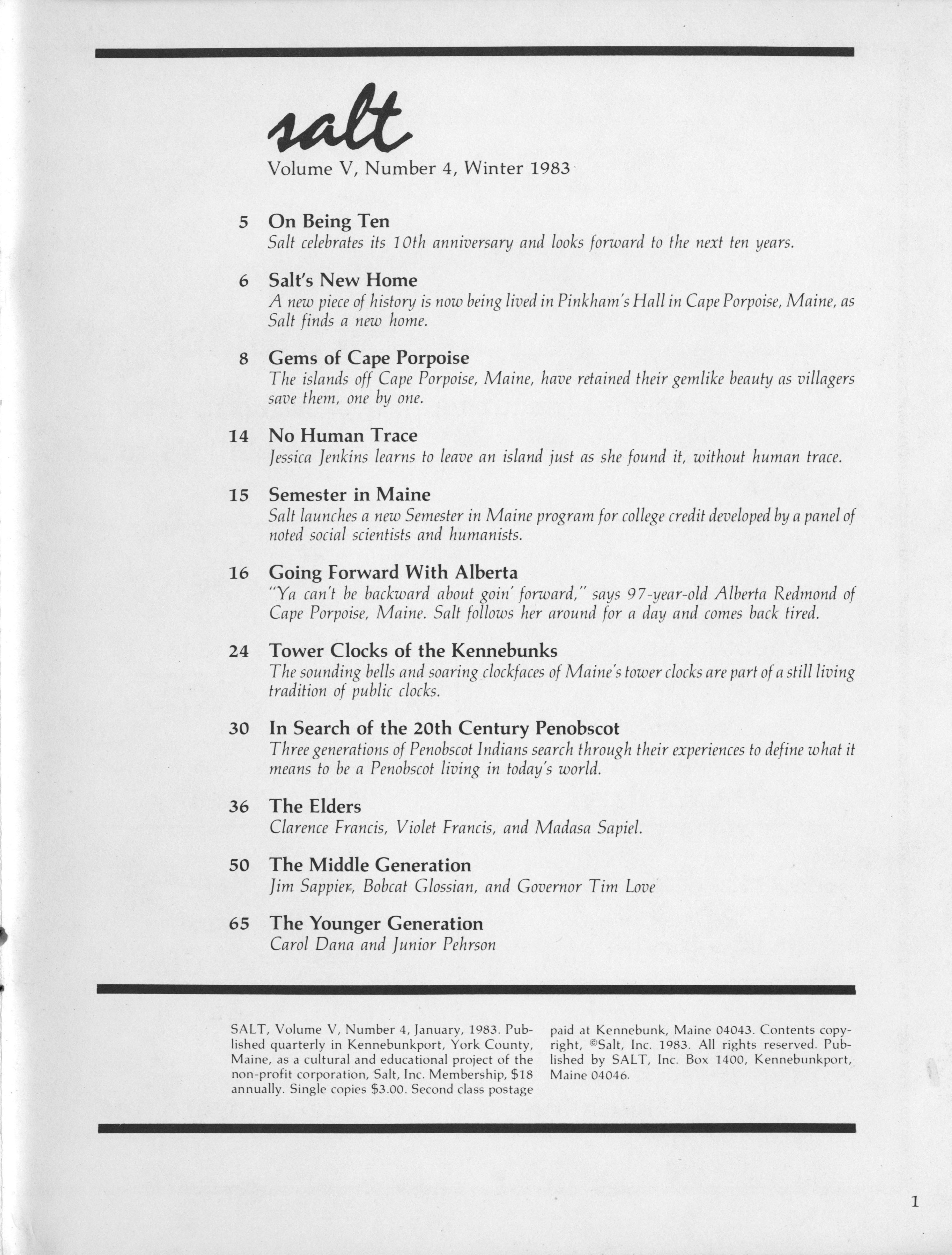 Table of contents for January 1983 Salt Magazine.