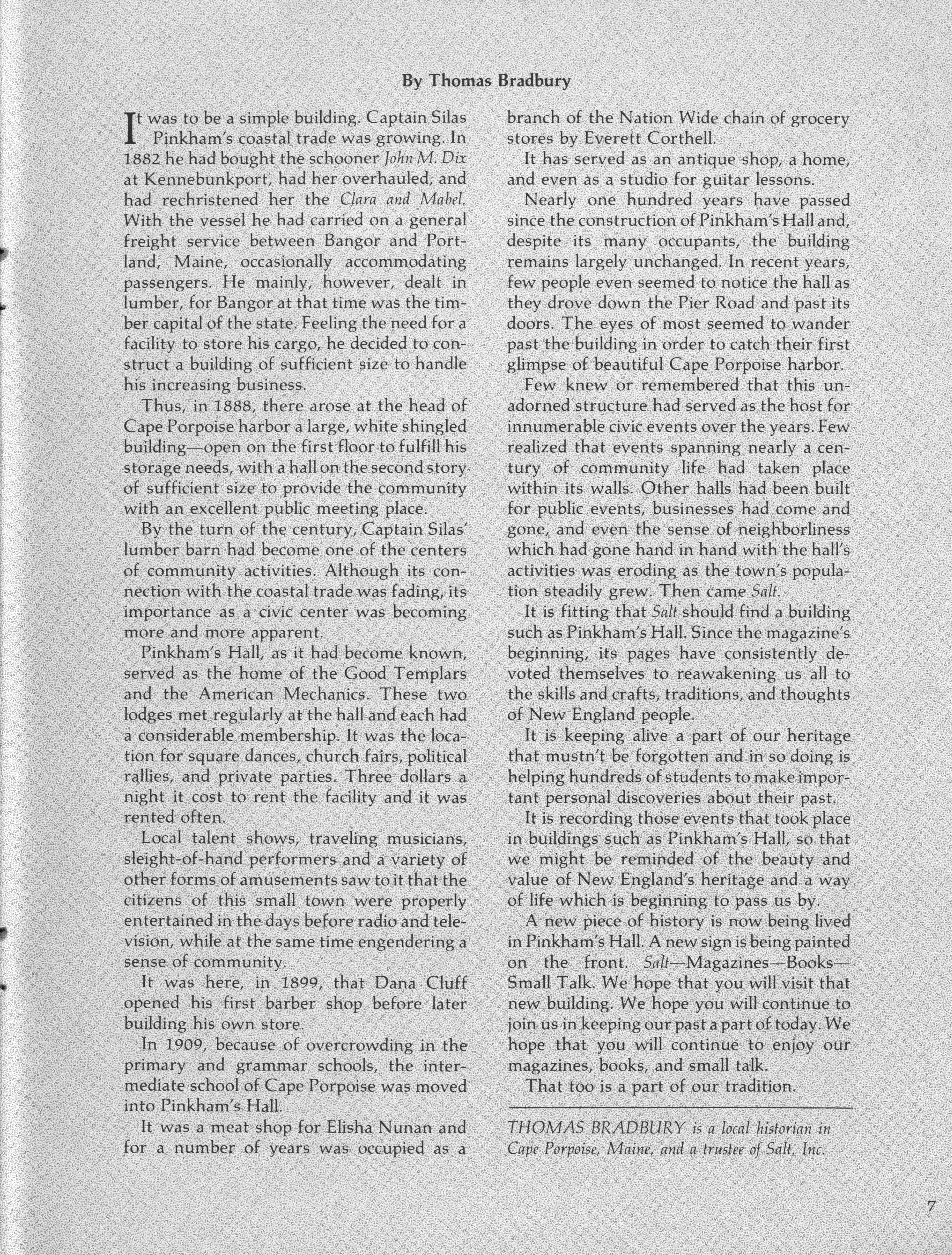 Thomas Bradbury recounts the history of Pinkham Hall and how it is fitting that a group like Salt would find a home there.