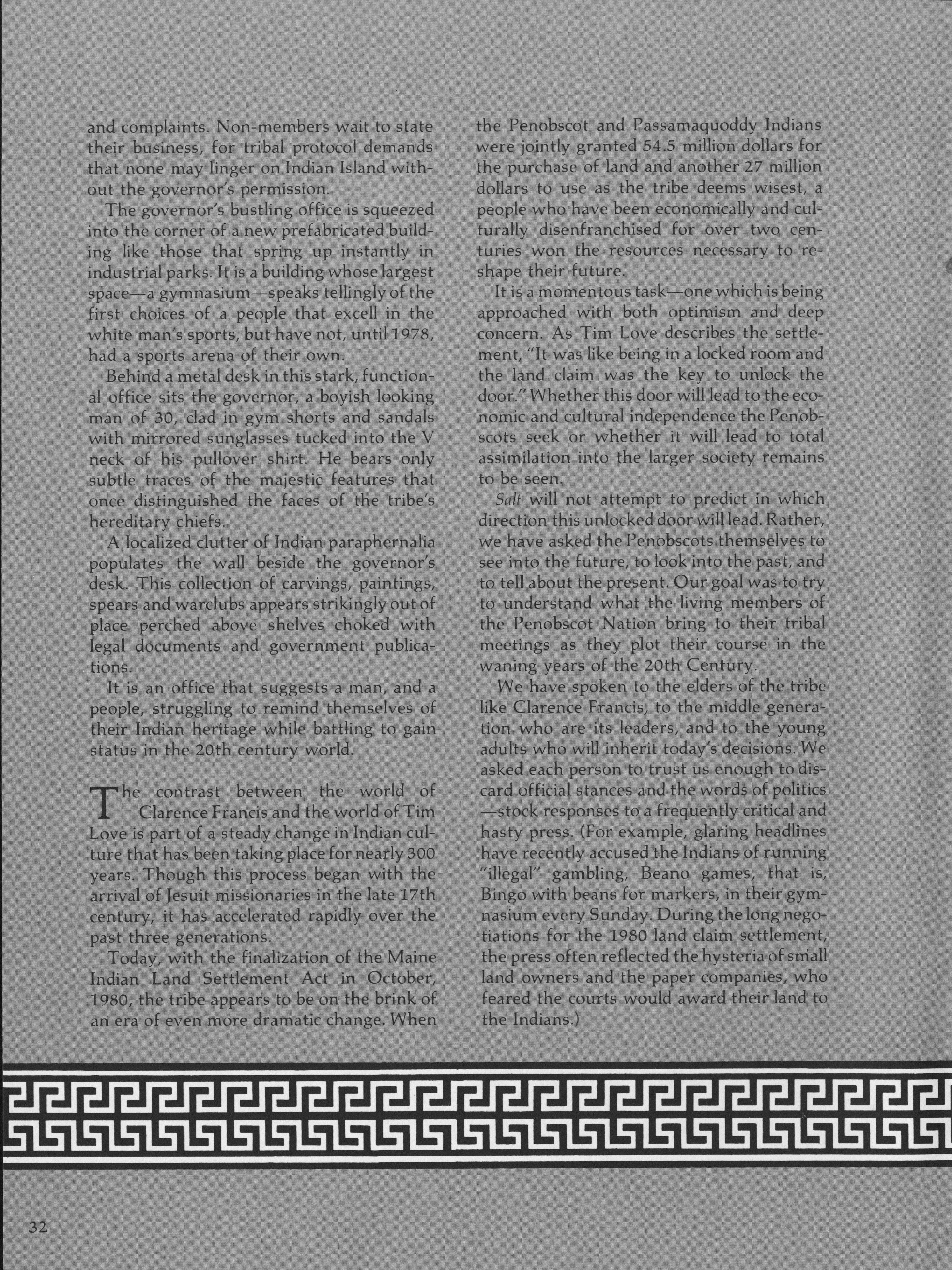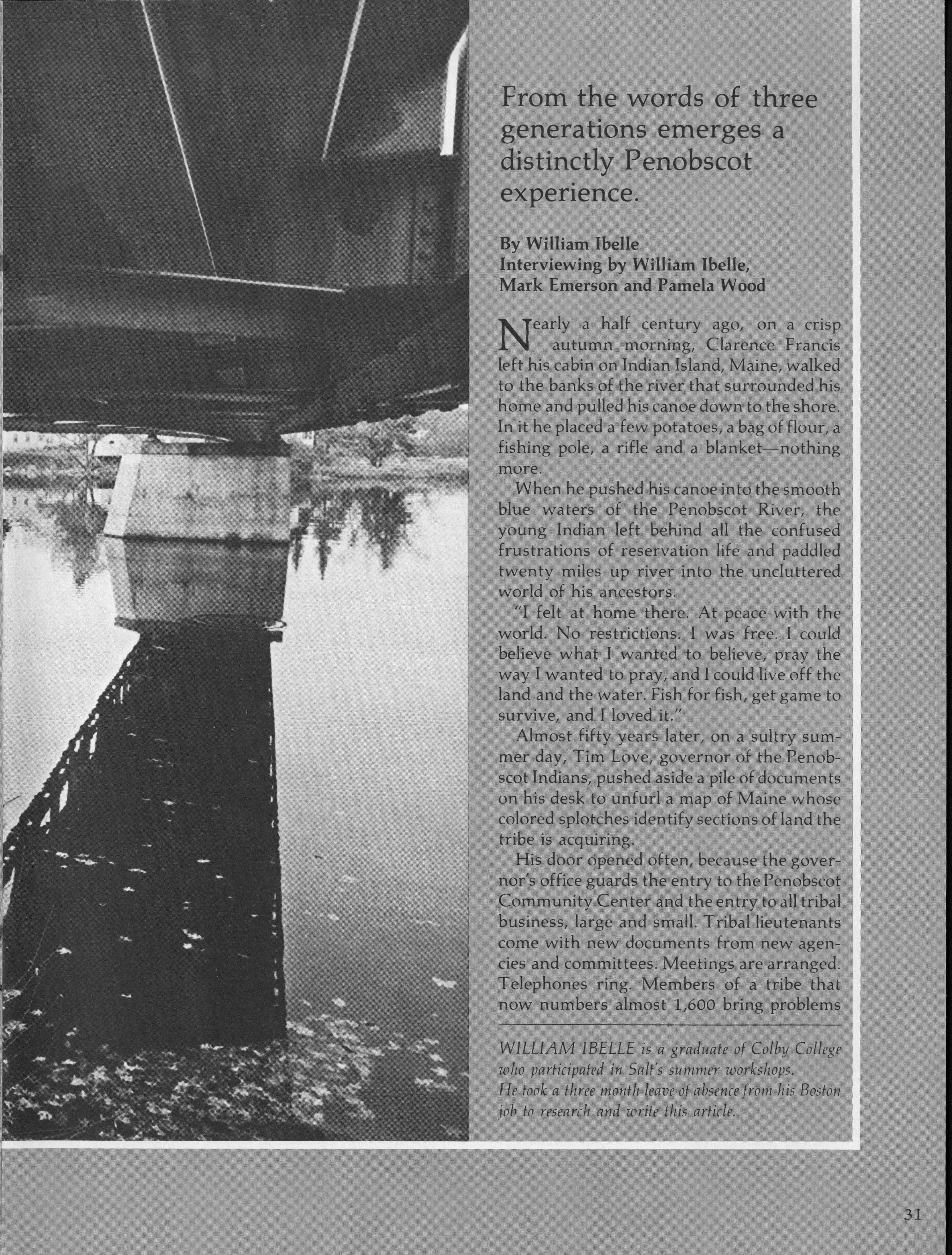 William Ibelle explores how three generations of Penobscot Indians are searching through their experiences to define what it means to be a Penobscot living in today's work.
