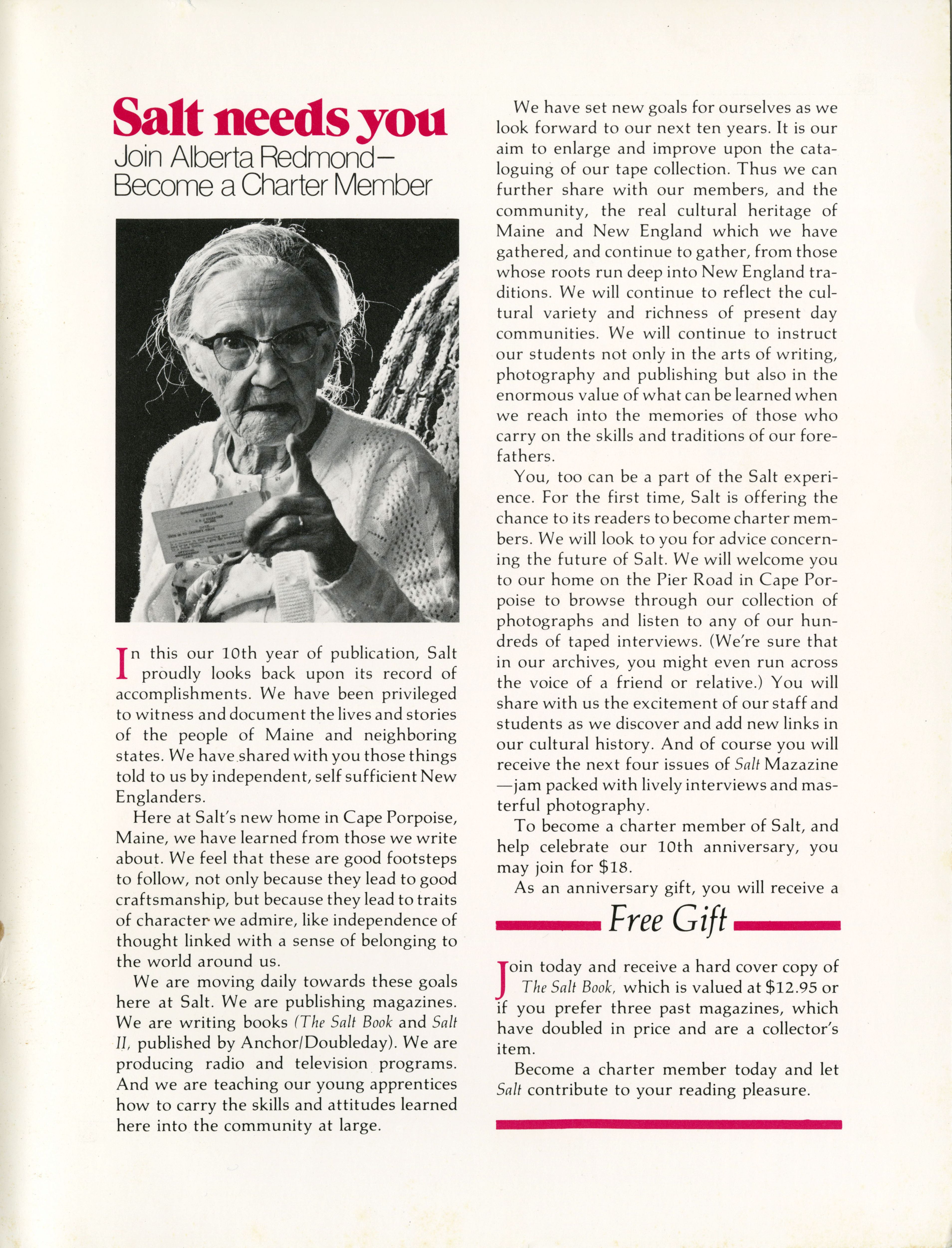 Inside back cover for the January 1983 Salt Magazine asking readers to become charters members of Salt.
