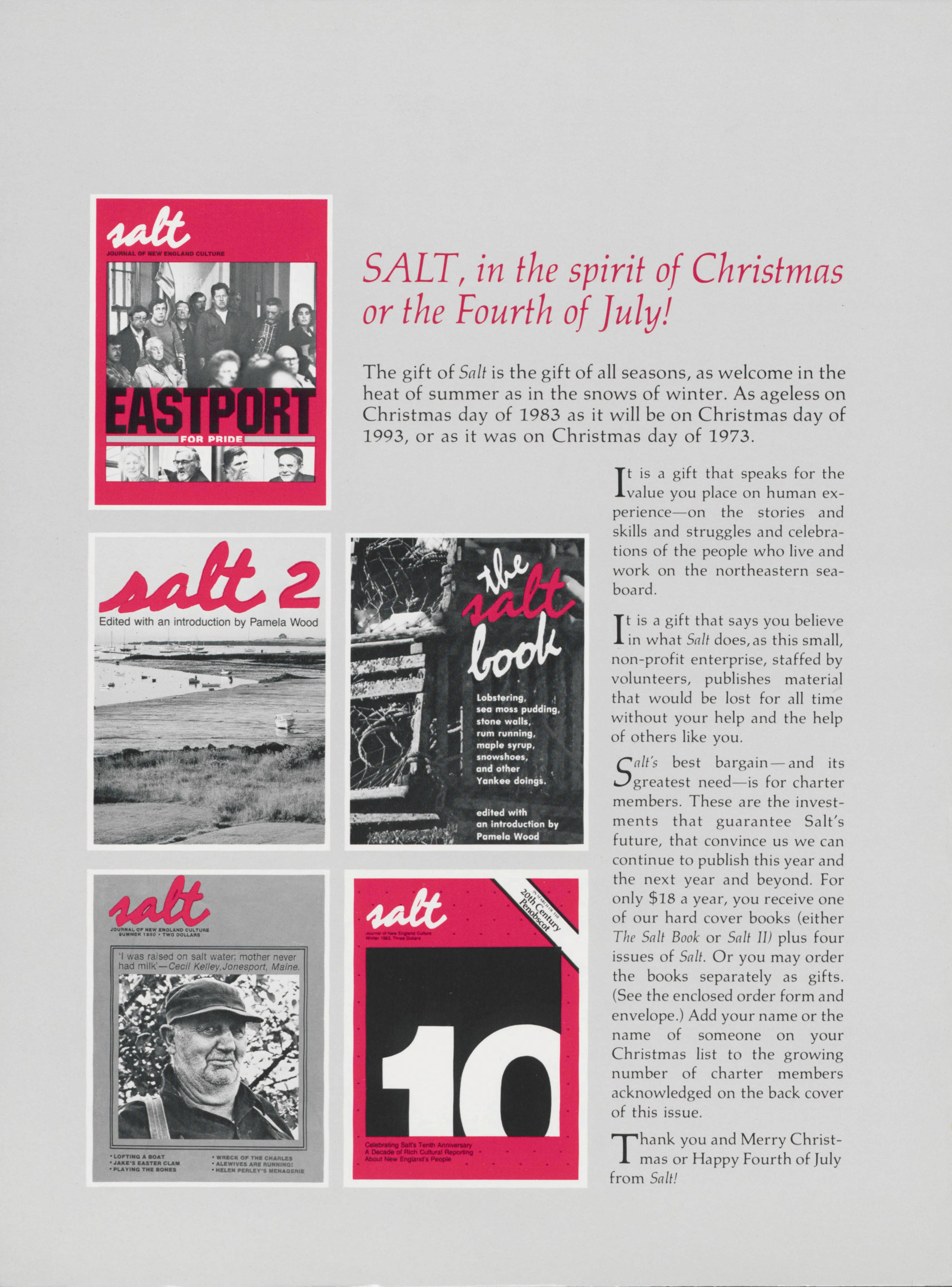 Inside front cover for the December 1983 Salt Magazine, with advertisement for Salt subscriptions.
