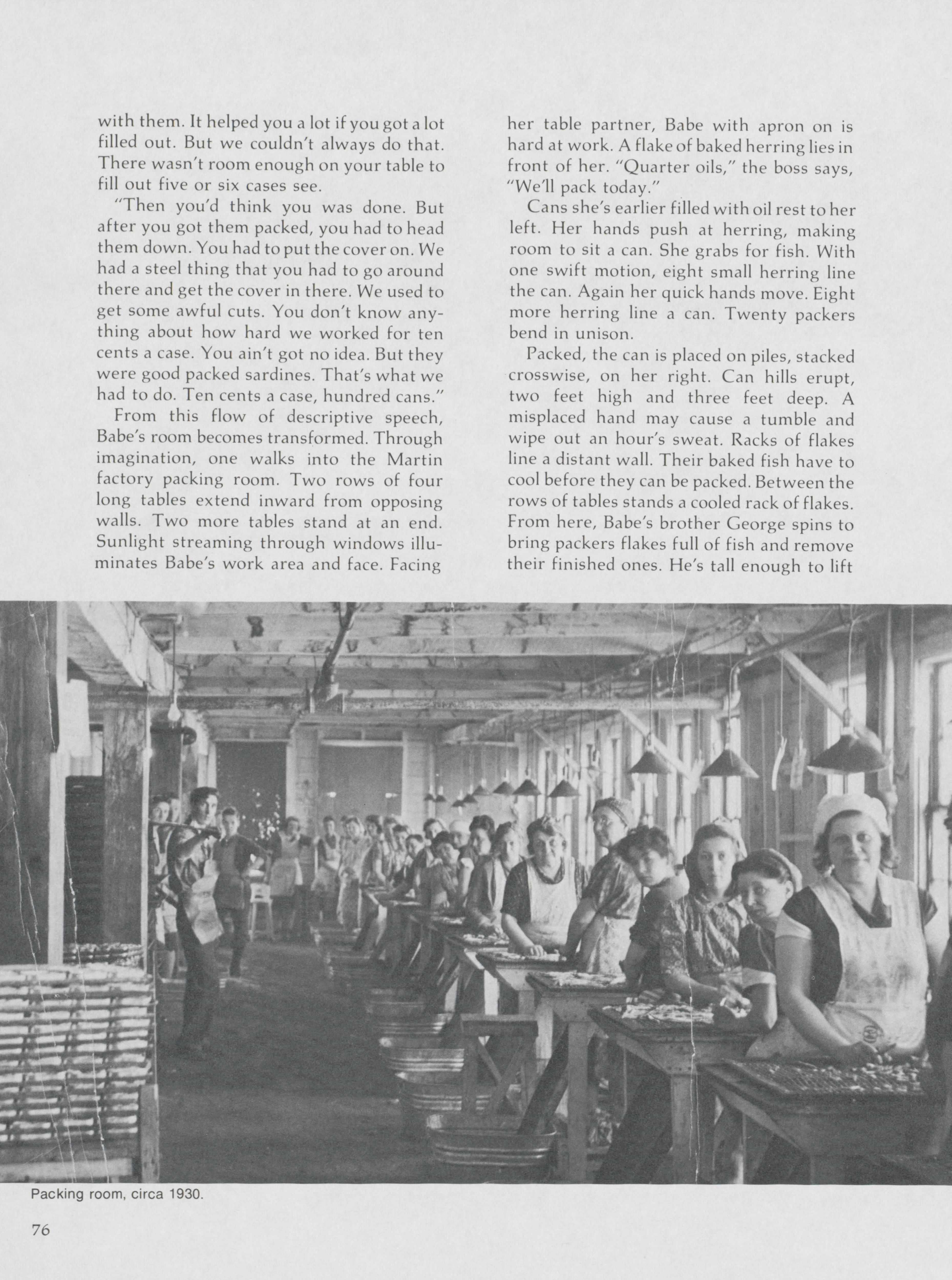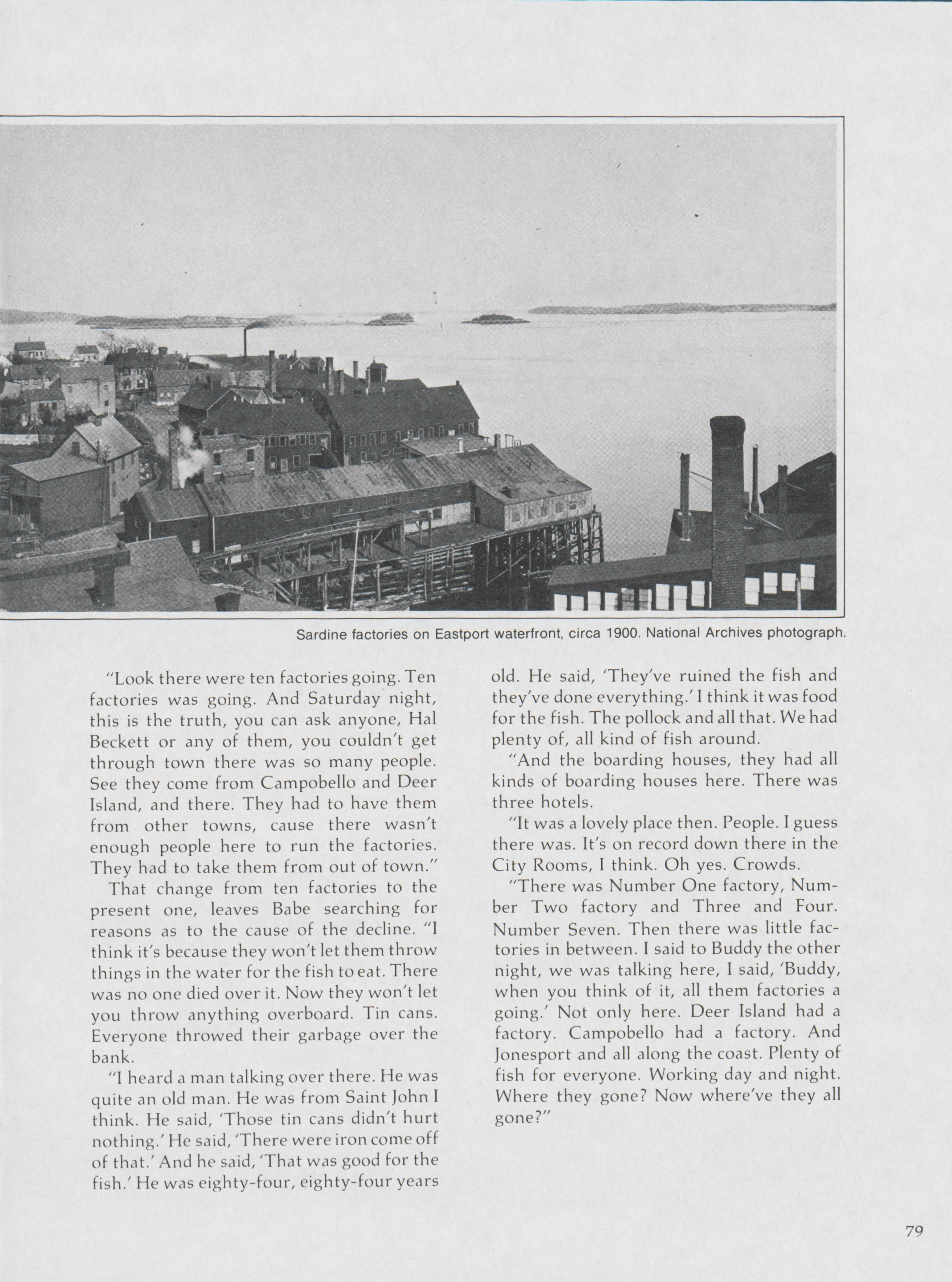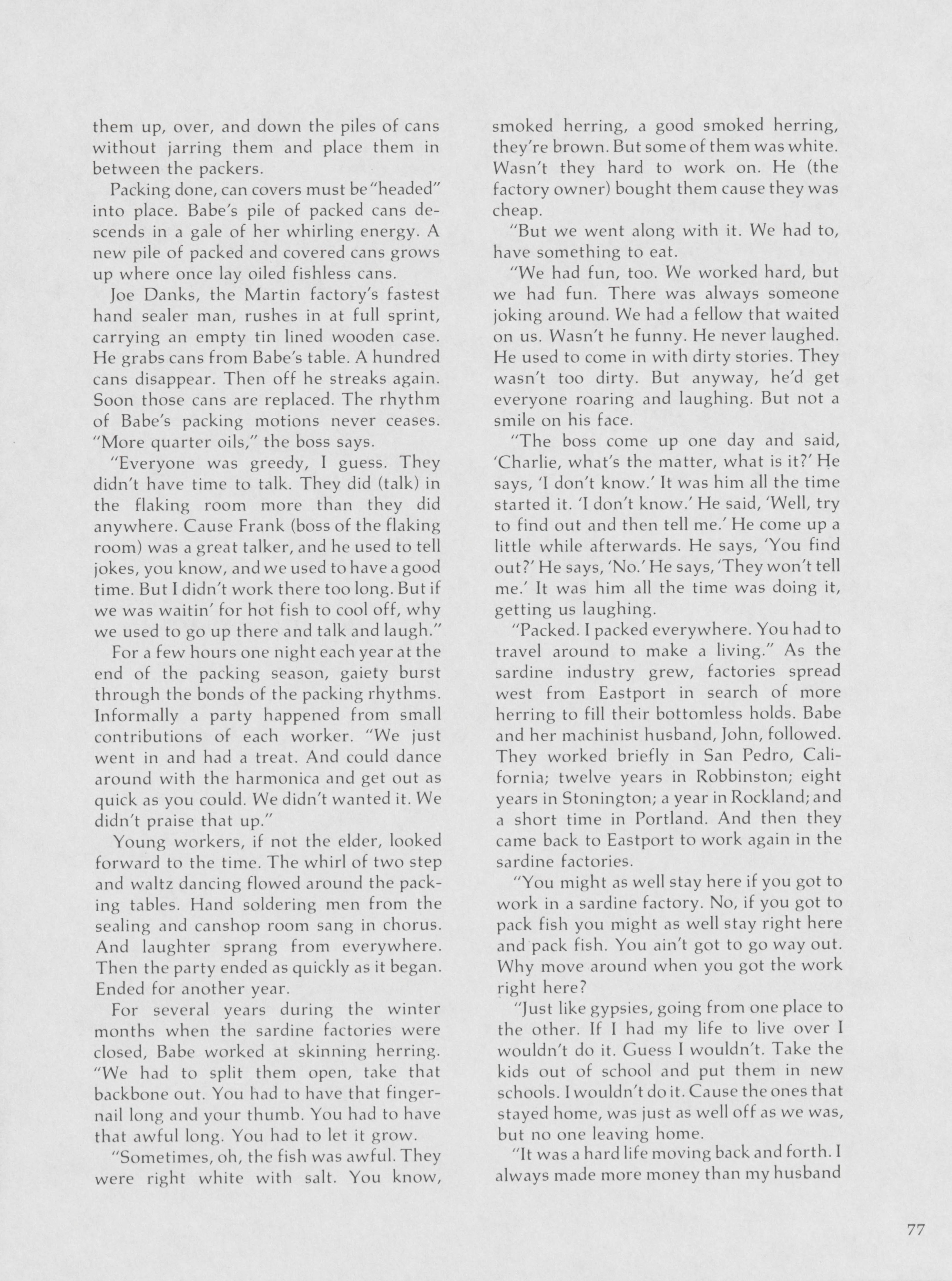 As one of the last voices that can speak about the history of Eastport and sardine industry, Hugh French highlights Babe Baine's experiences living and working in Eastport and at the sardine factory.