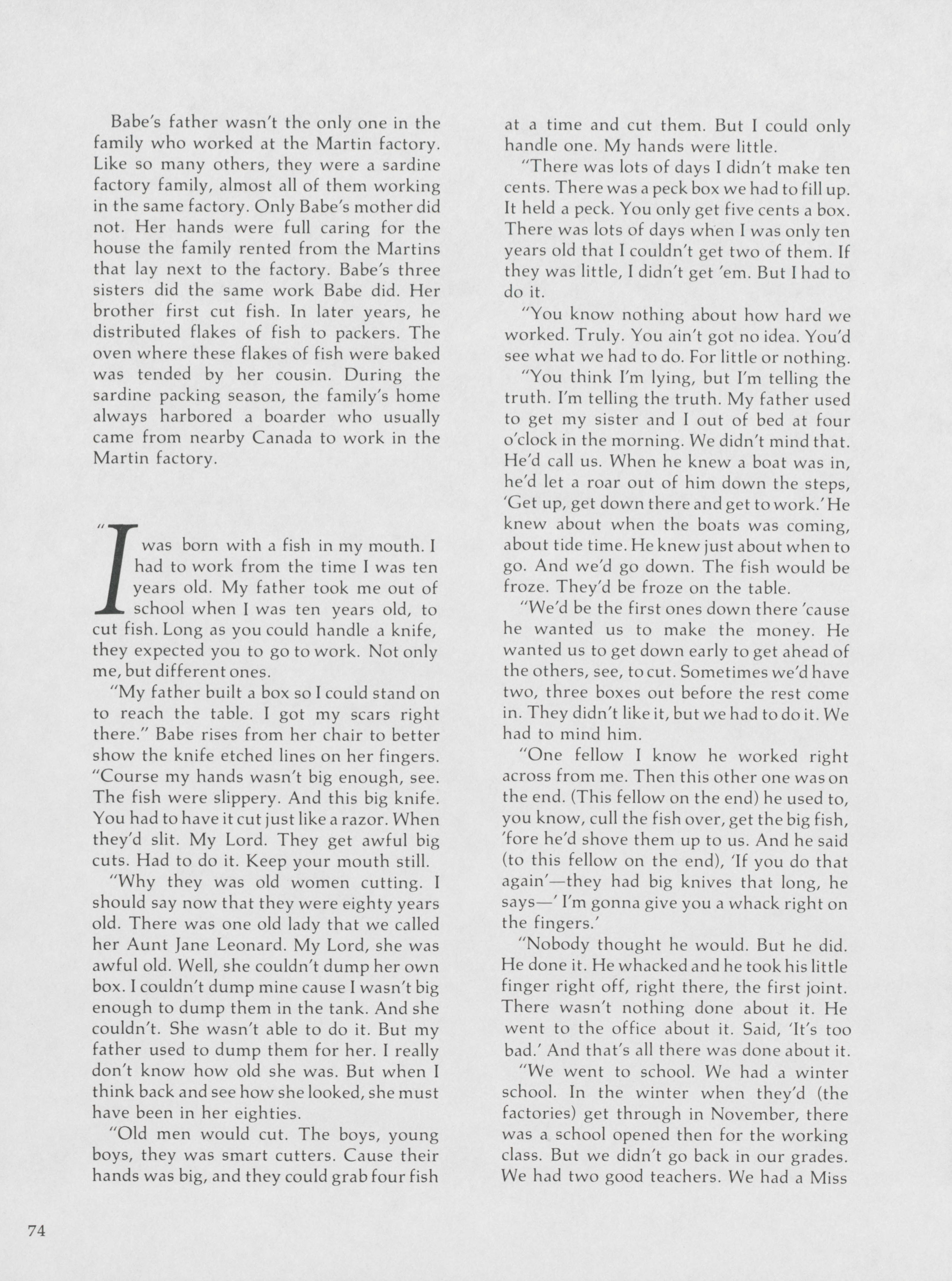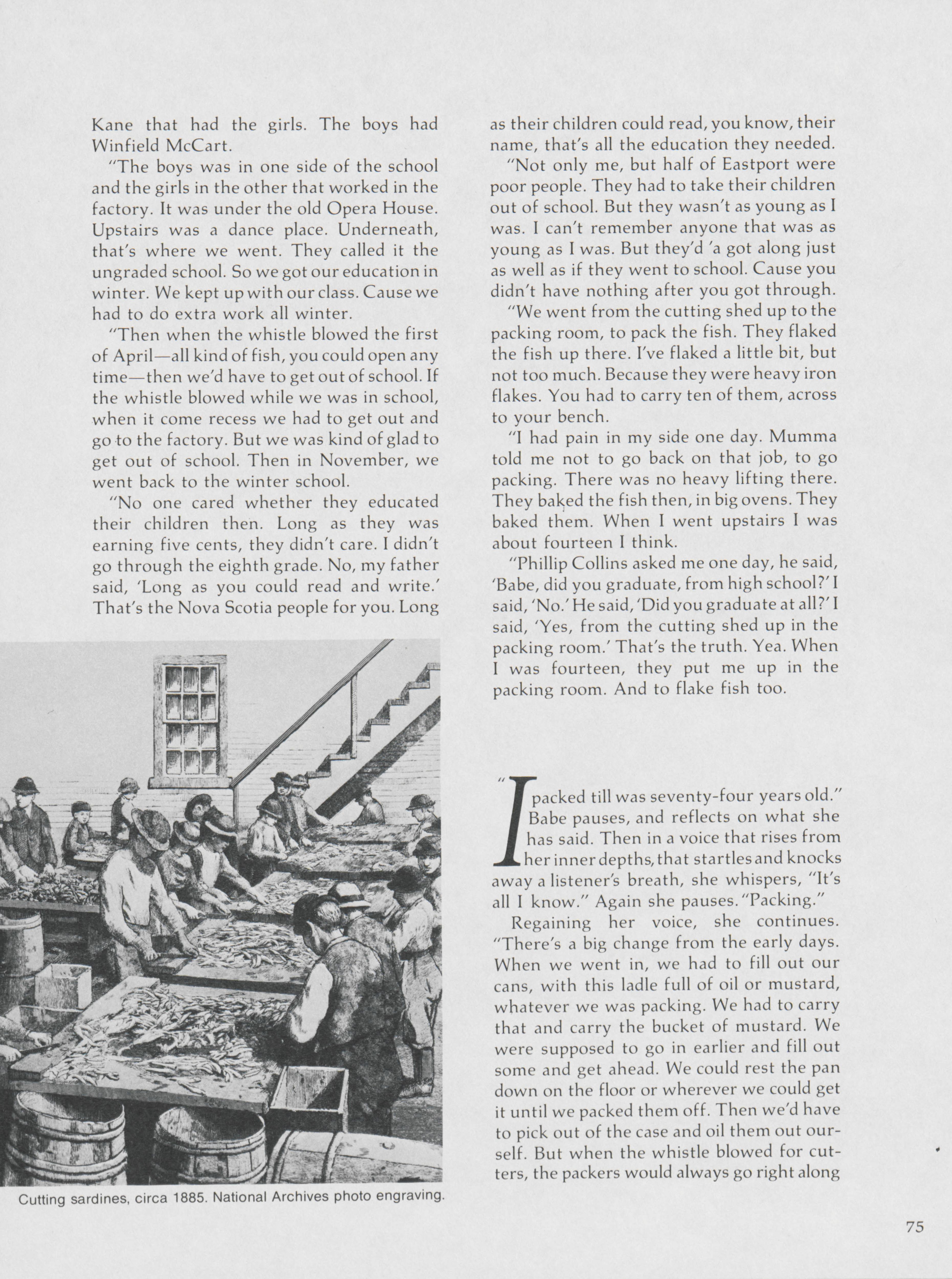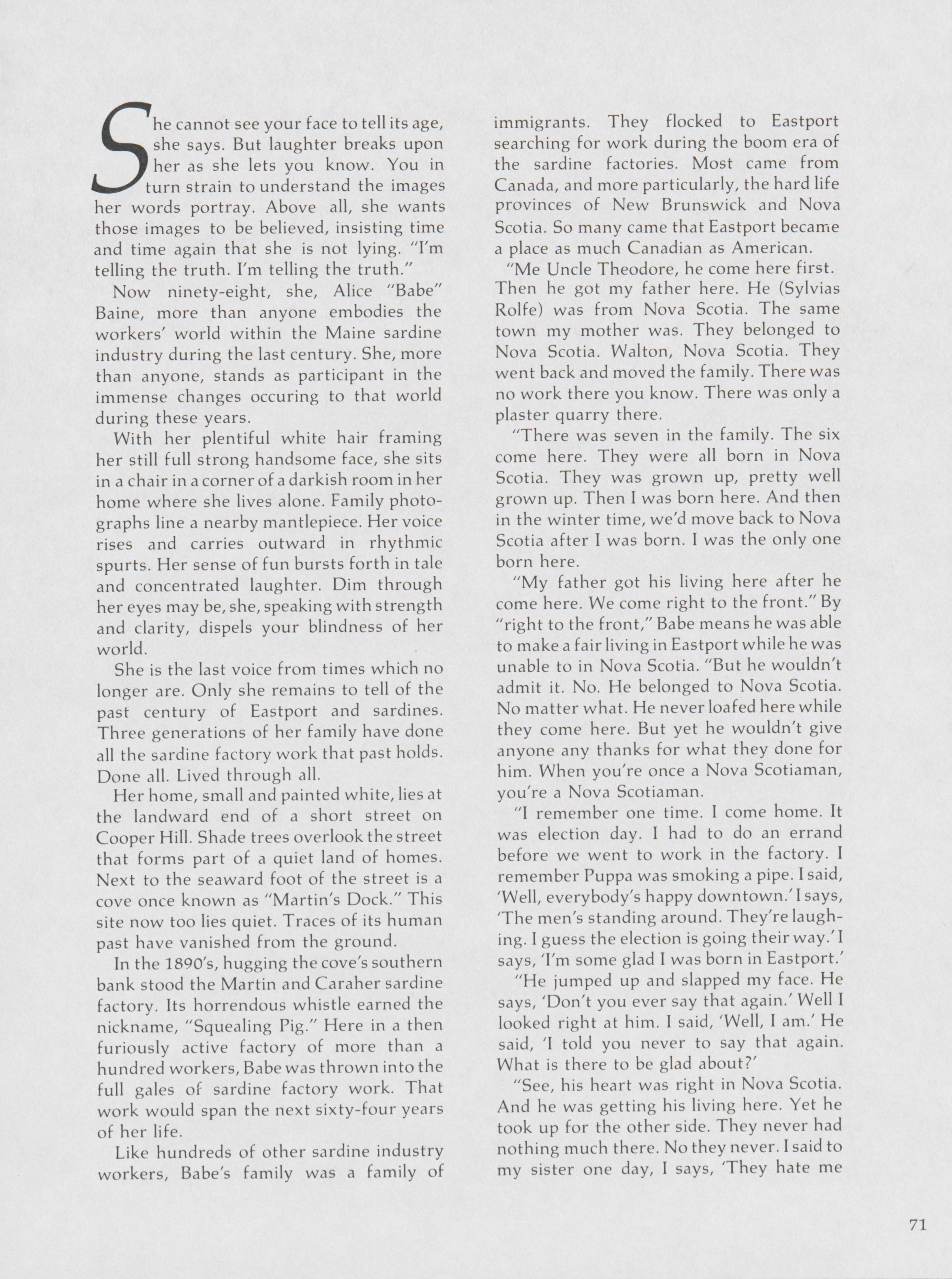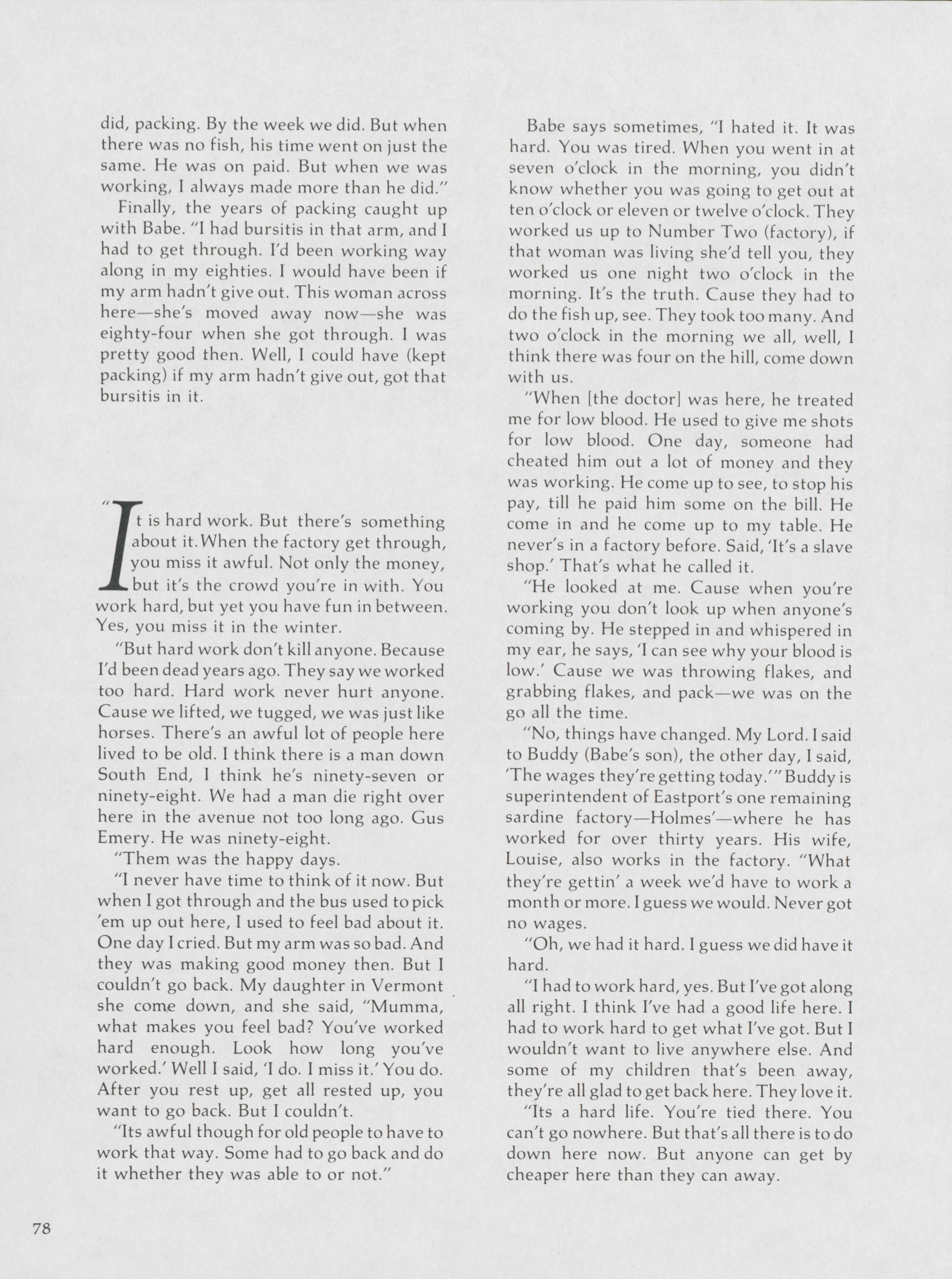 As one of the last voices that can speak about the history of Eastport and sardine industry, Hugh French highlights Babe Baine's experiences living and working in Eastport and at the sardine factory.