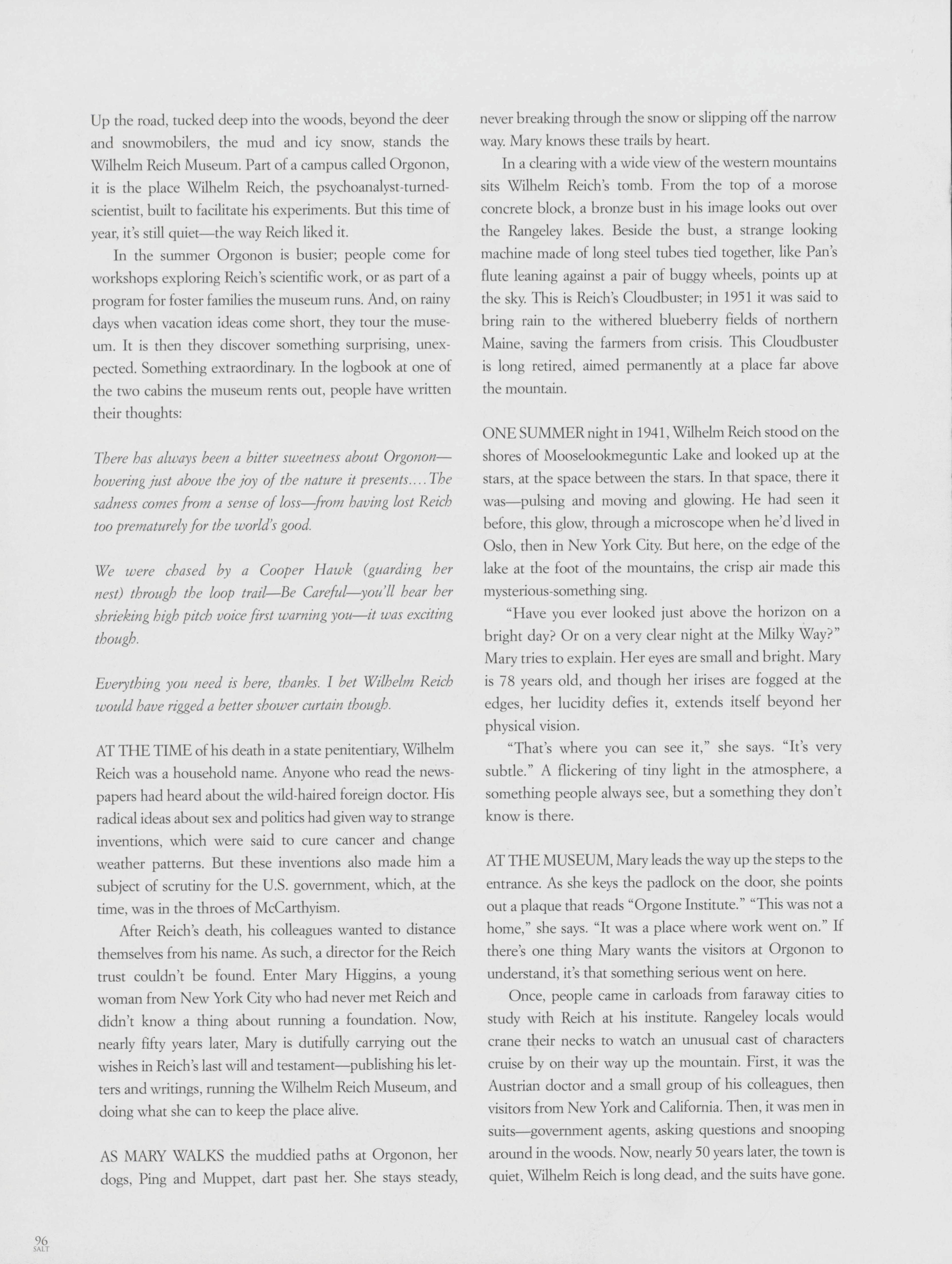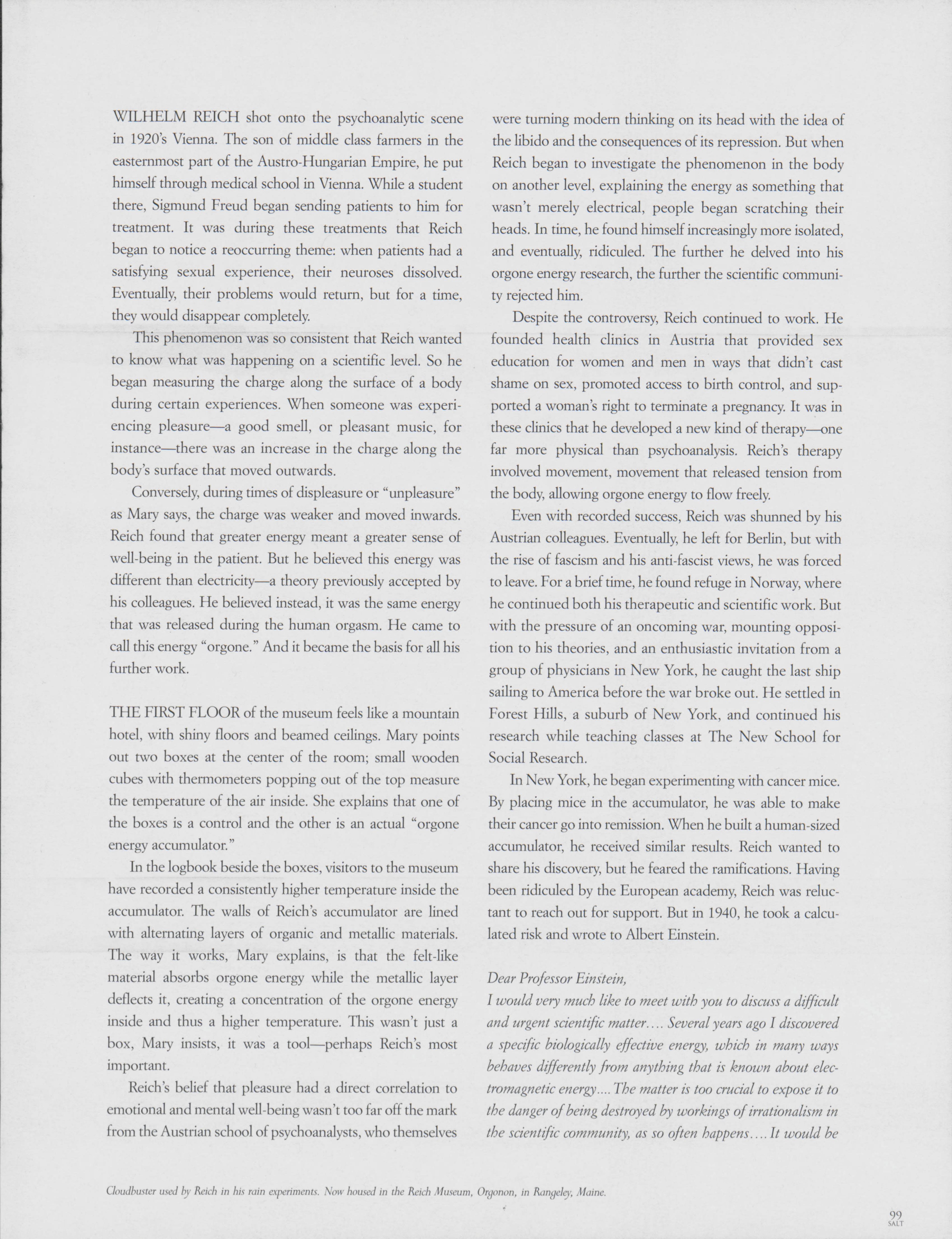 Andrea Maio highlights the history of Wilhelm Reich, a psychoanalyst who lived and worked in Maine. Maio explores the Wilhelm Reich Museum and learns about Reich from Mary Byrd Higgins, director of the museum.