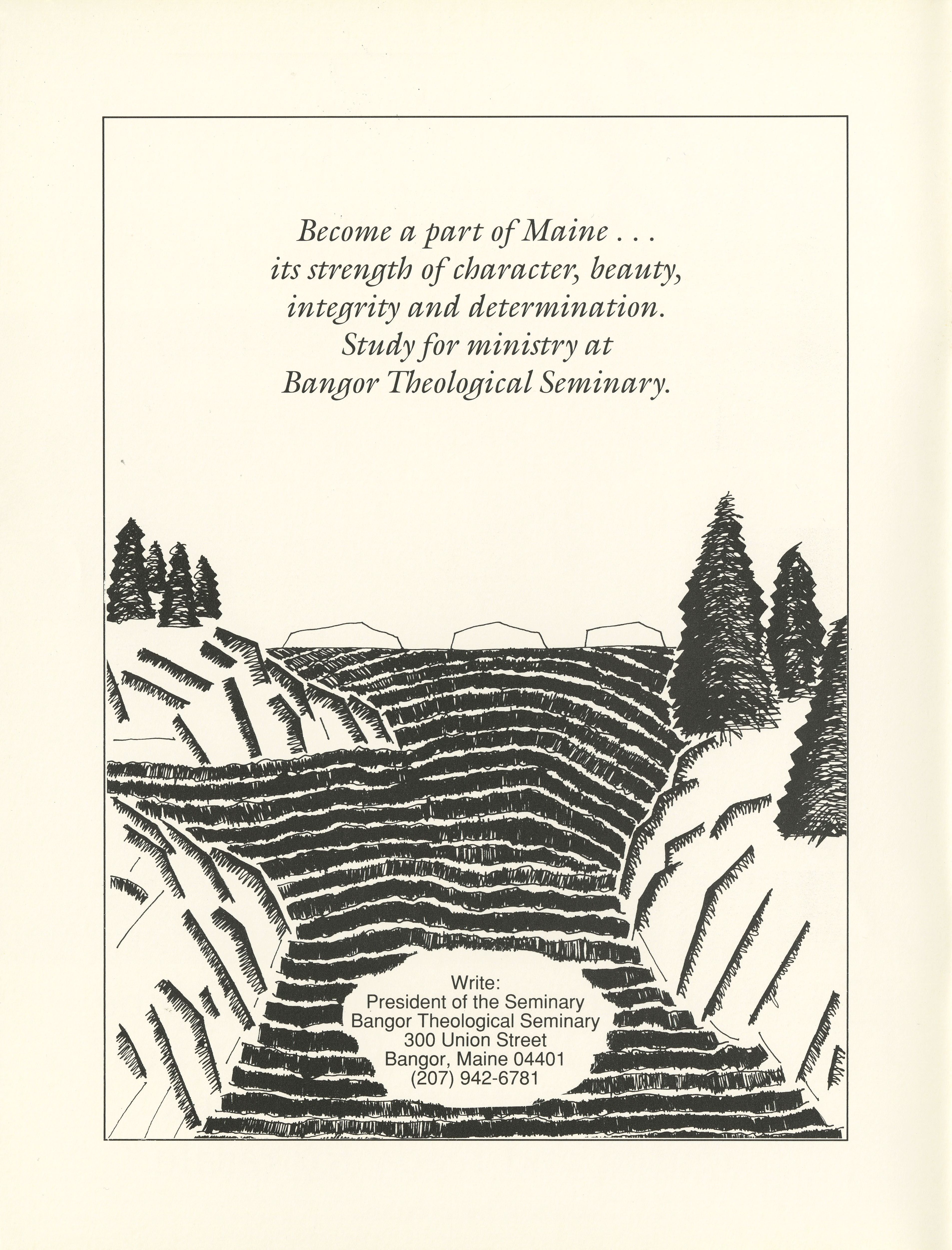 Inside front cover for the August 1989 Salt Magazine, with advertisement for the Bangor Theological Seminary.