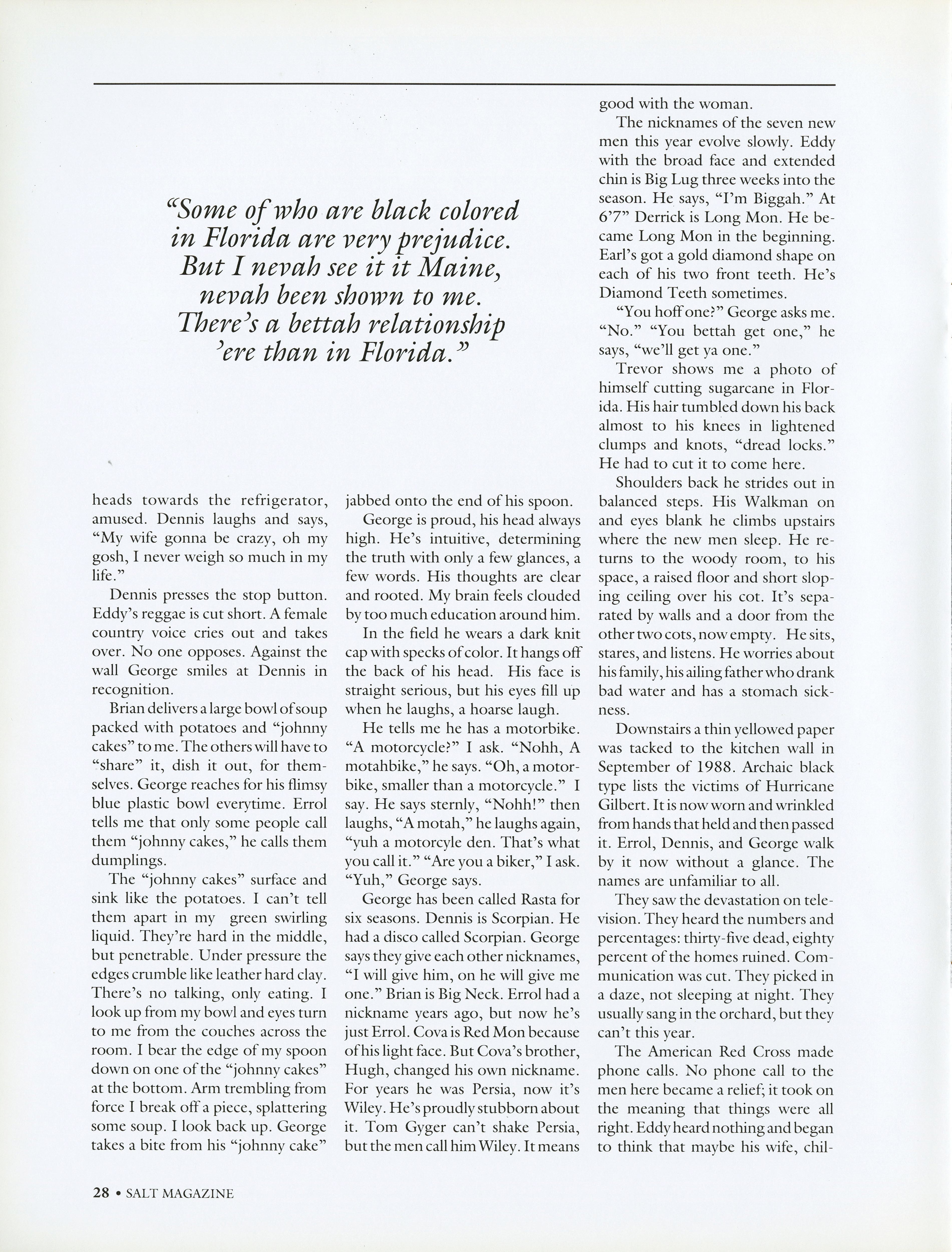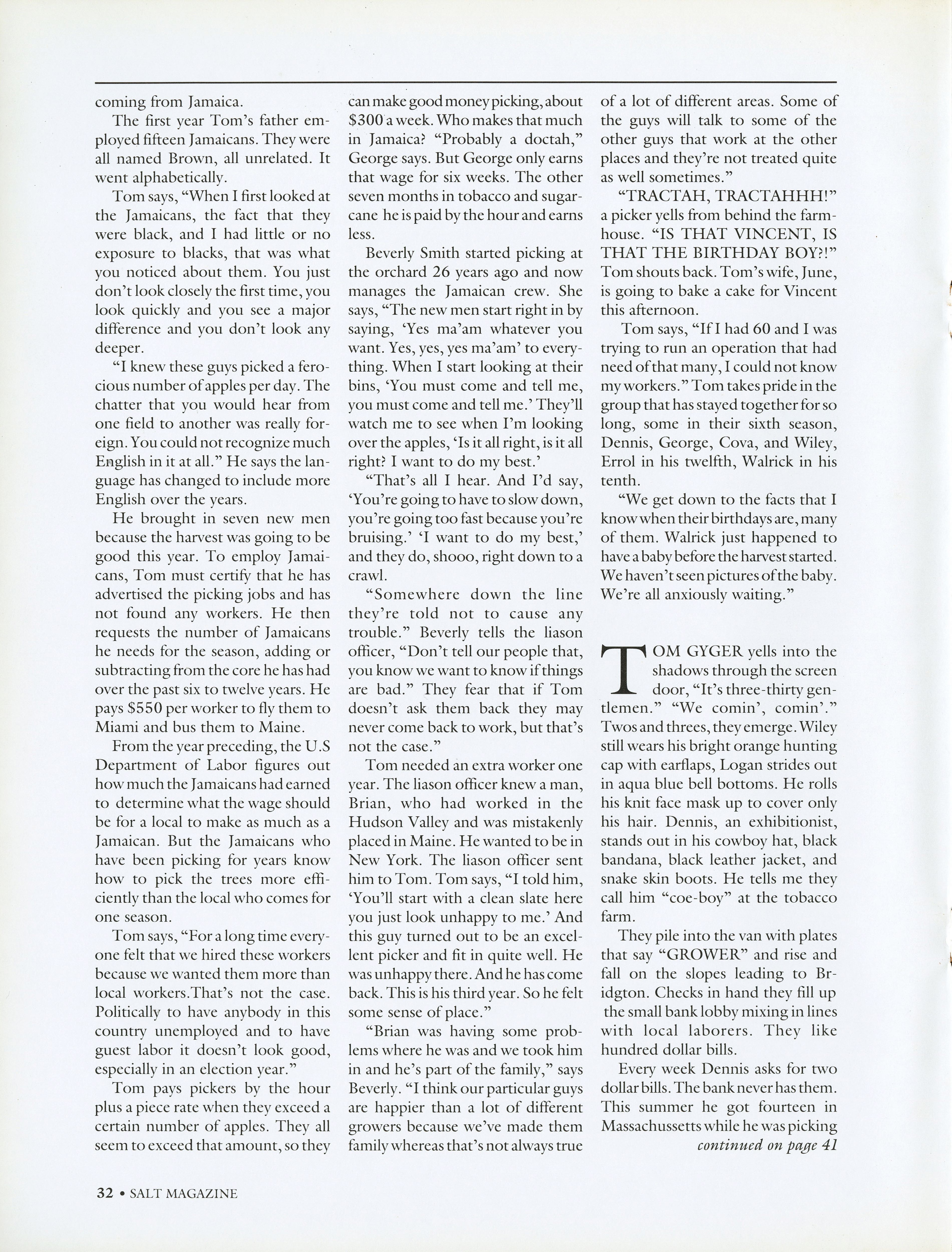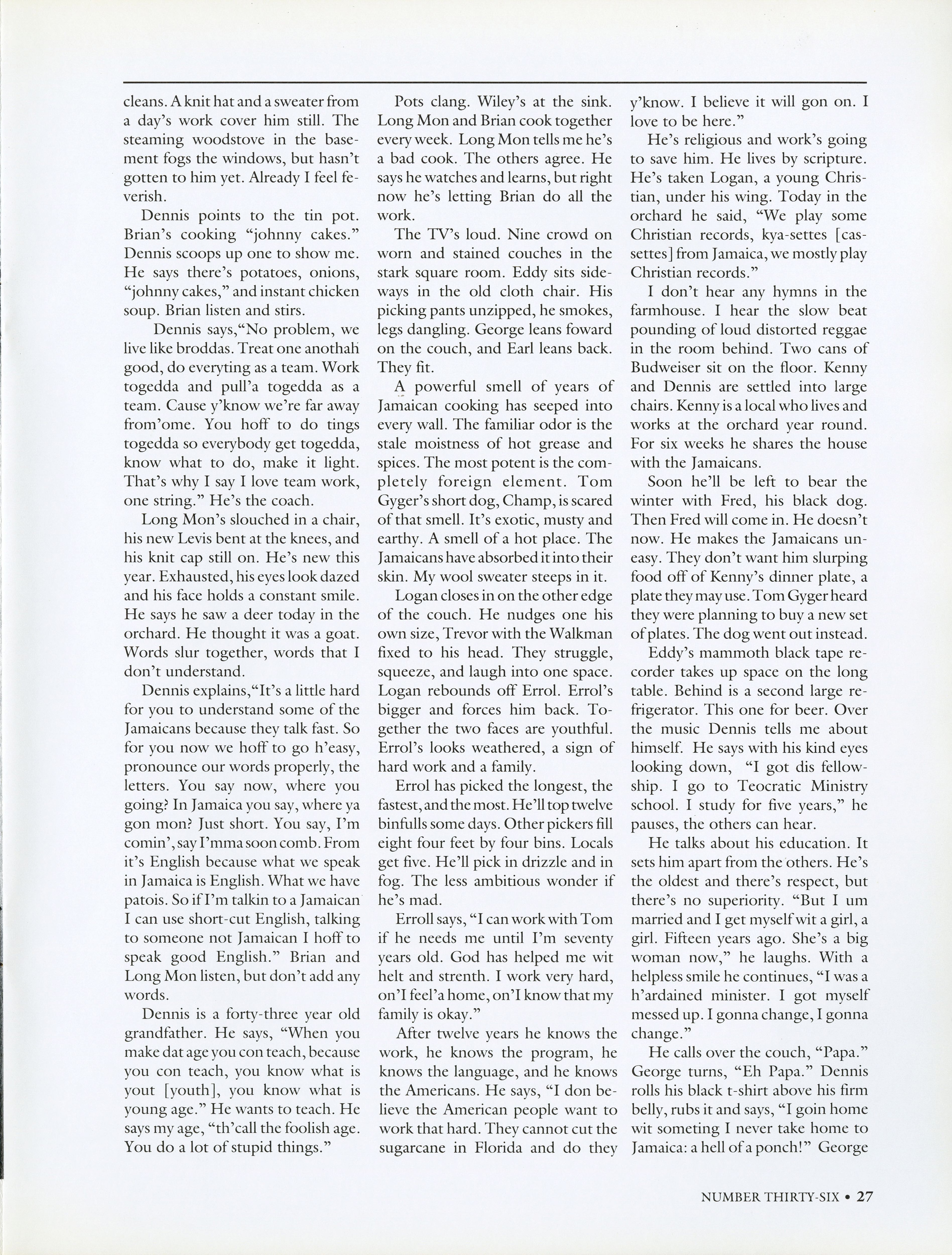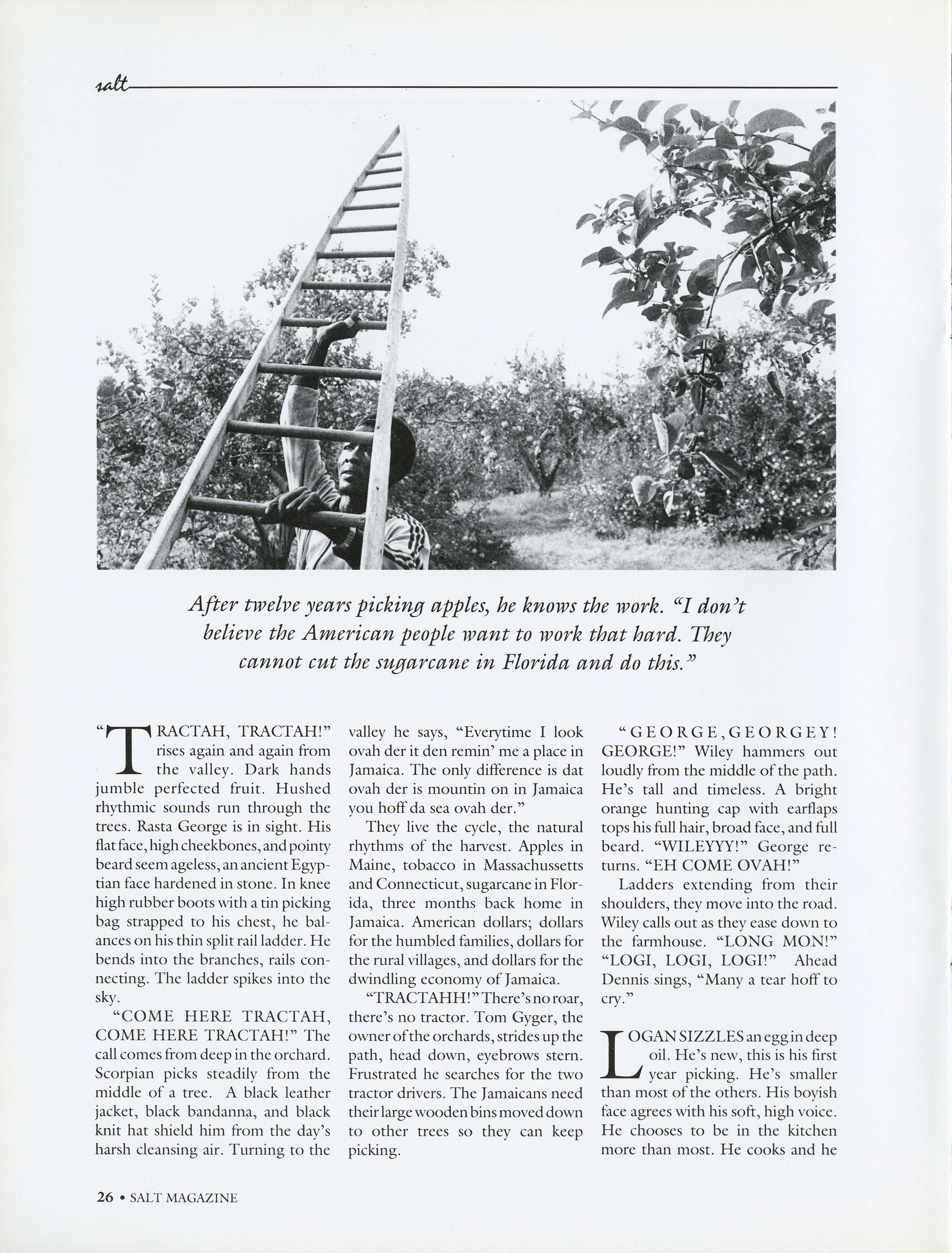 At Tom Gyger's orchard near Bridgton, Jamaican apple pickers live a life between two worlds. Lisa Rathke follows around 13 pickers through the harvest and their daily lives.