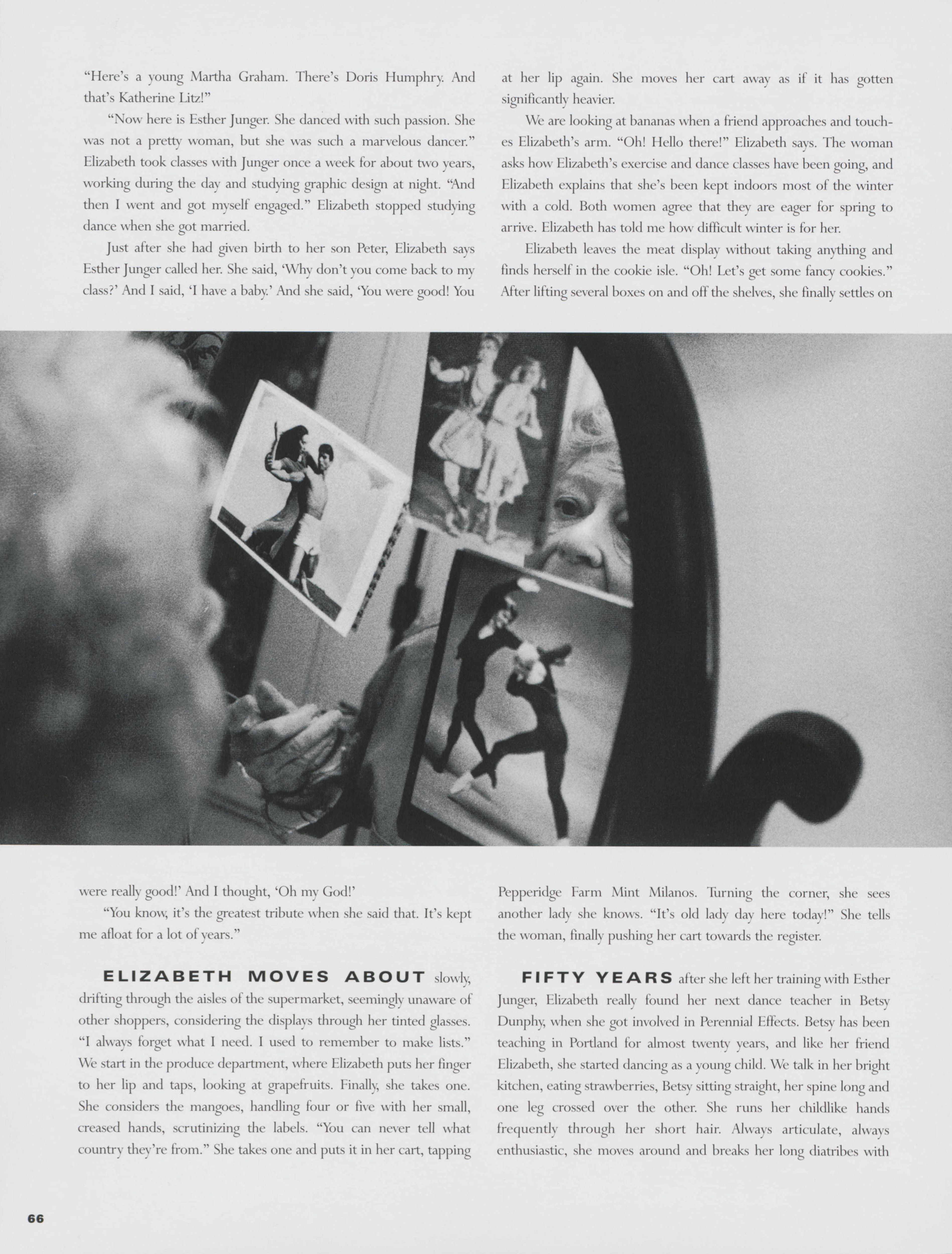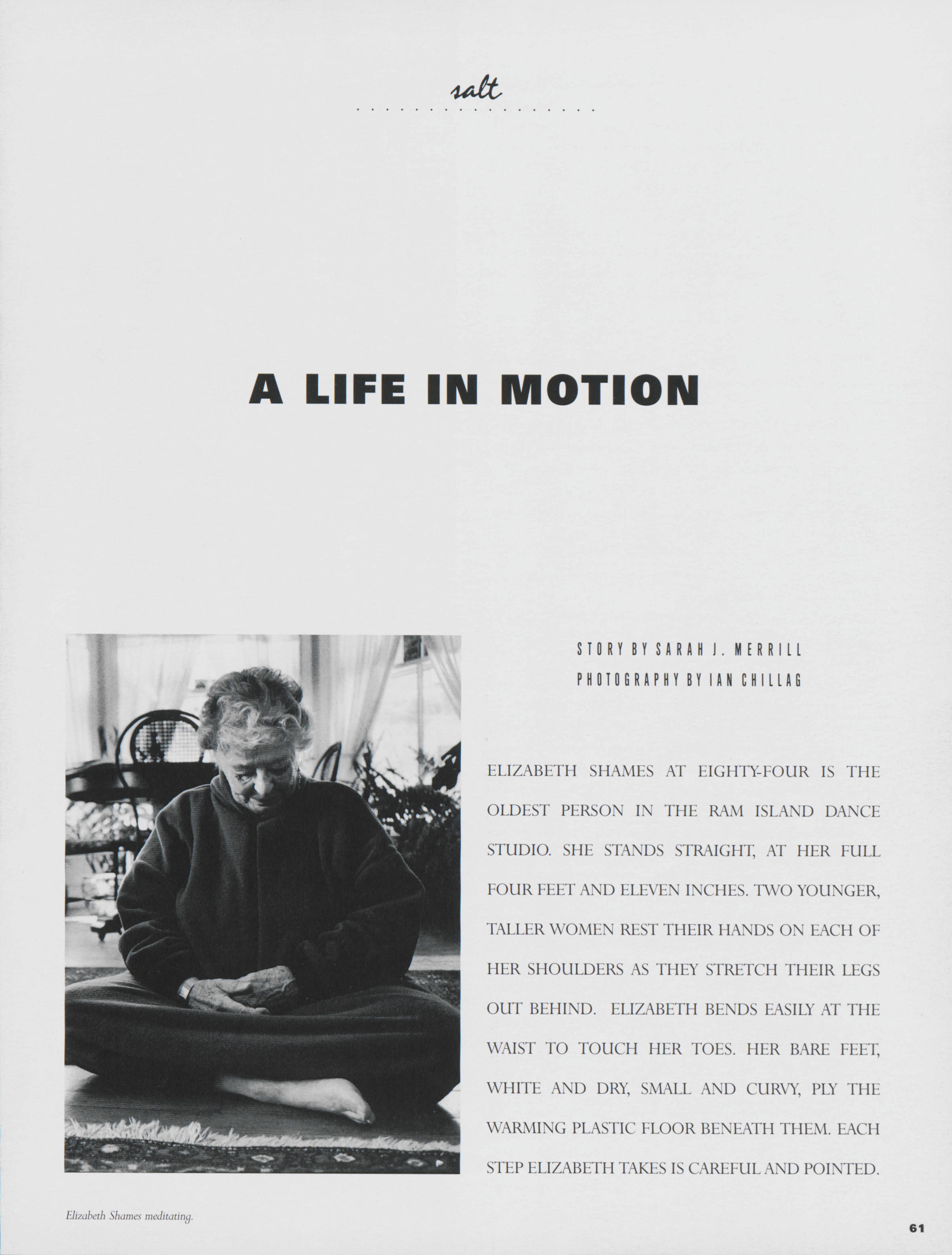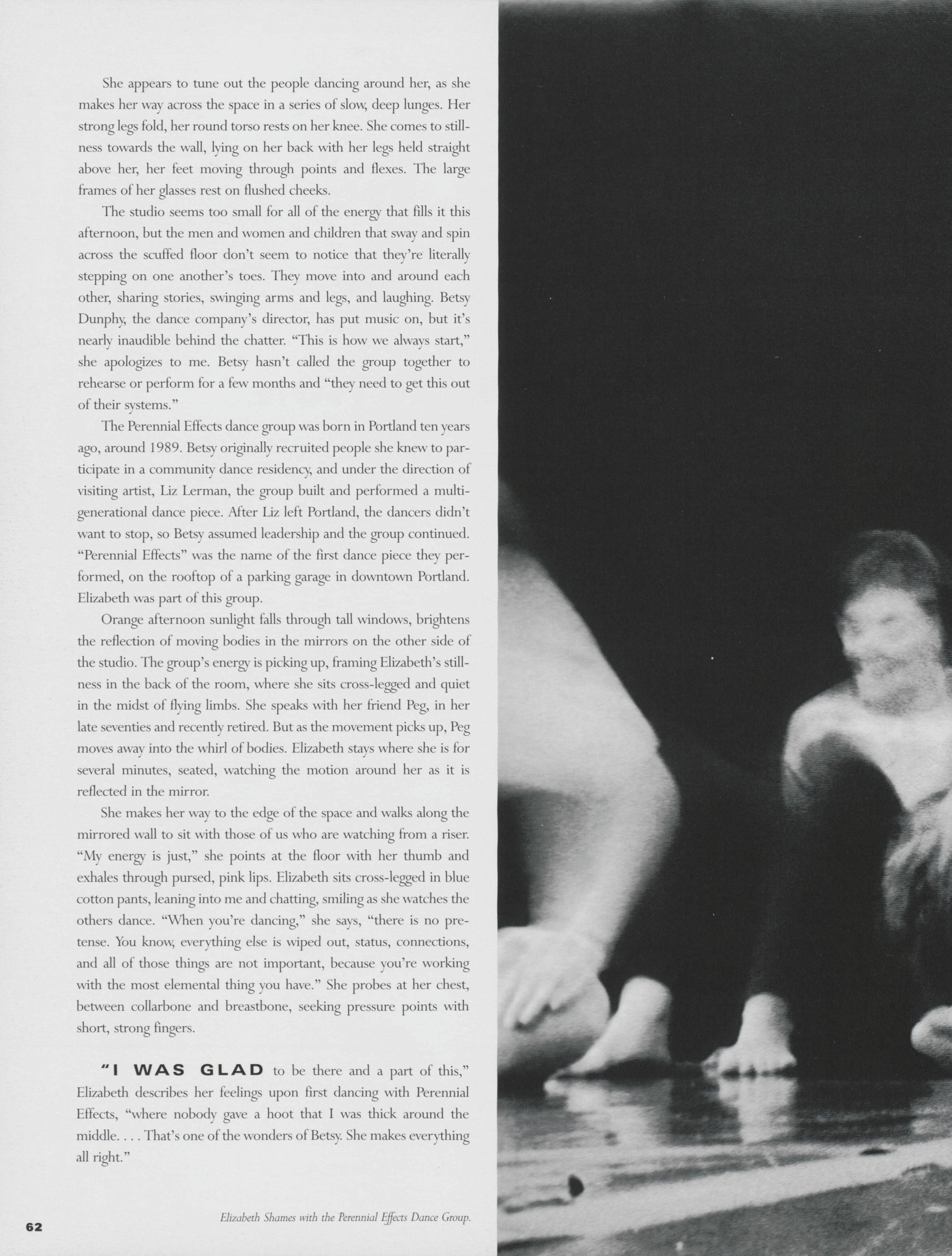 Even at old age, Elizabeth Shames continues to dance with the Perennial Effects dance group. Sarah Merrill highlights the life of Shames, discussing her history with dancing and her personal life.