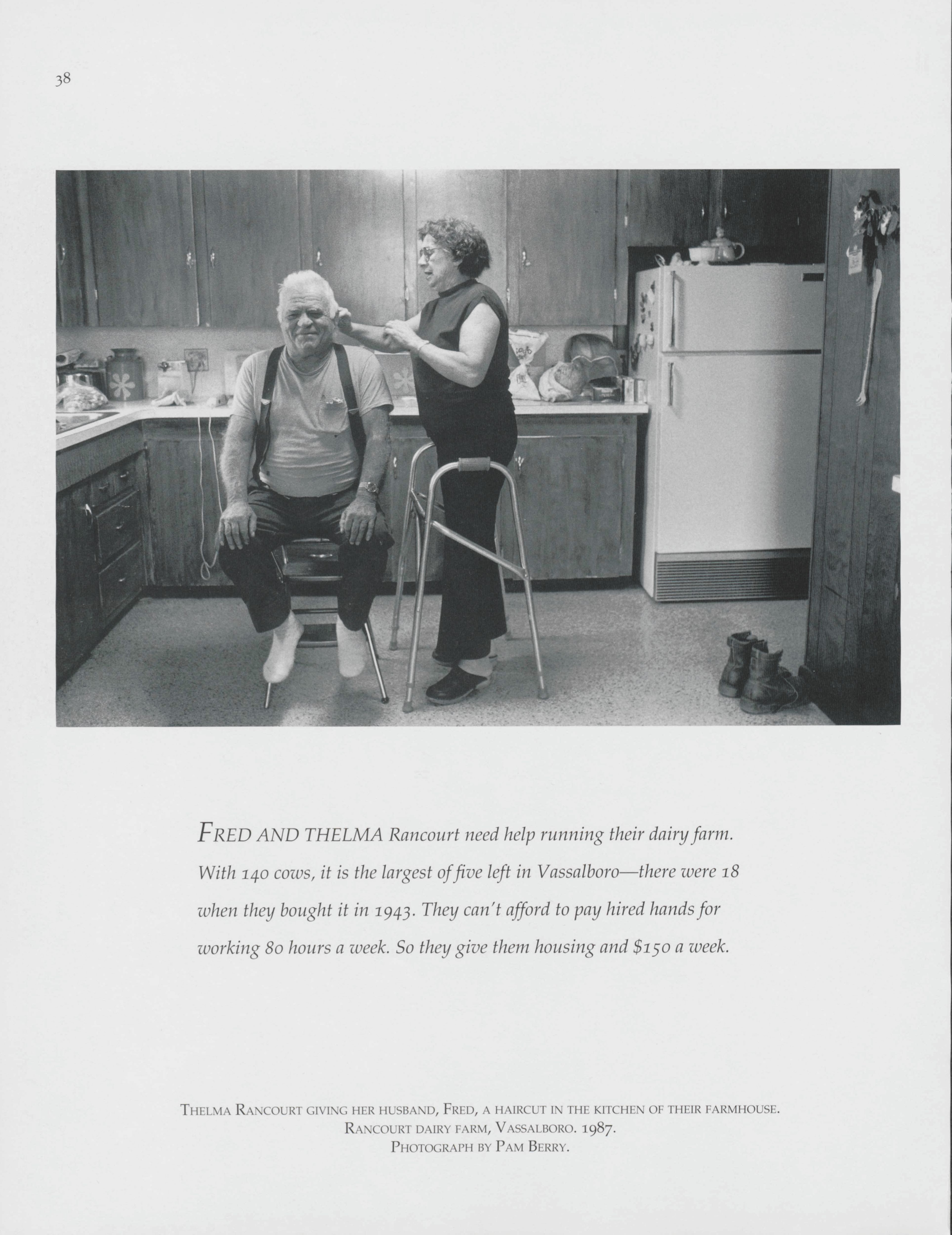 Living on a farm with over 140 cows, the Rancourts need help running the farm. Pam Berry documents a moment between Thelma and Fred Rancount in their kitchen.