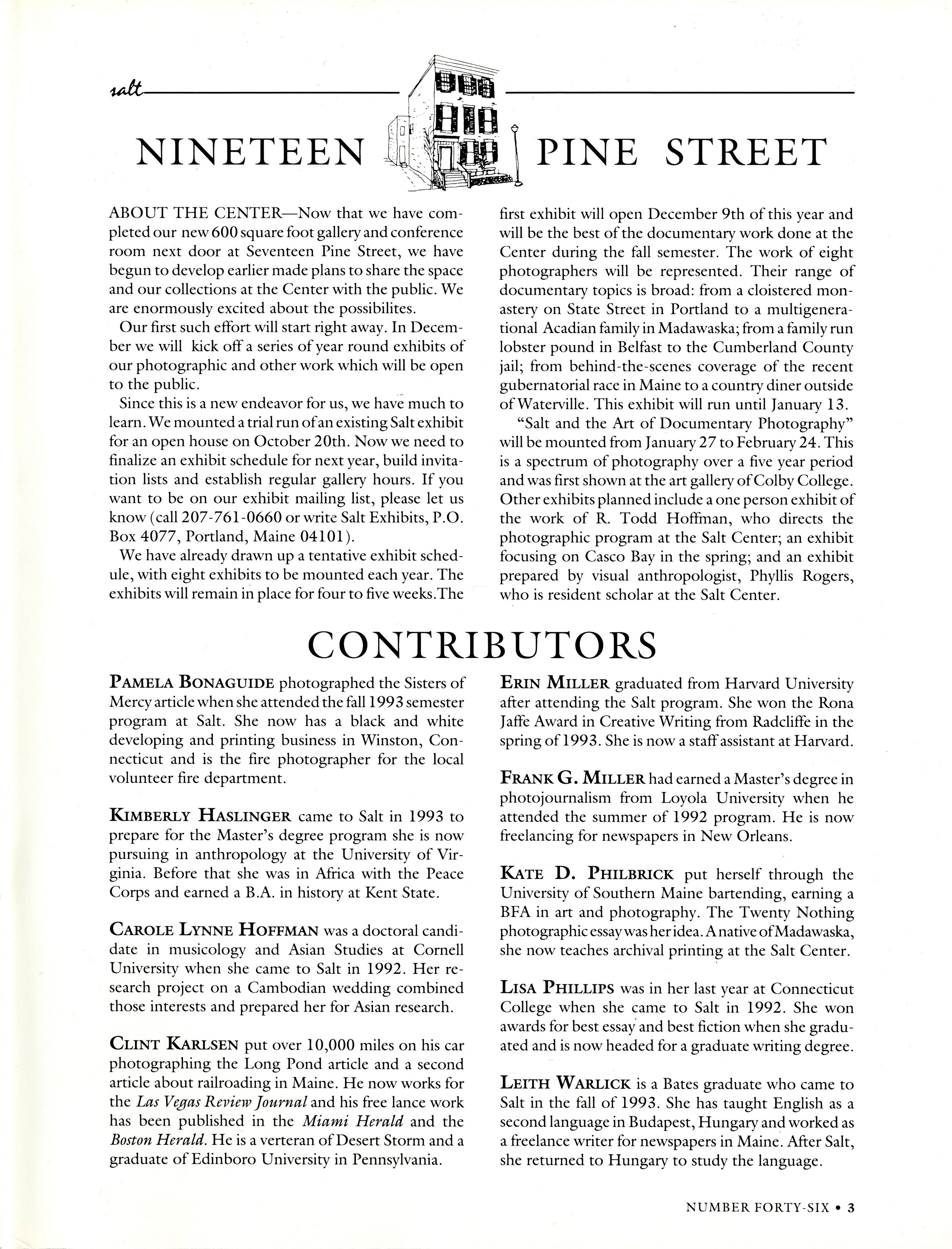 Bios of the contributors to the December 1994 Salt Magazine, with information on the Salt Center.