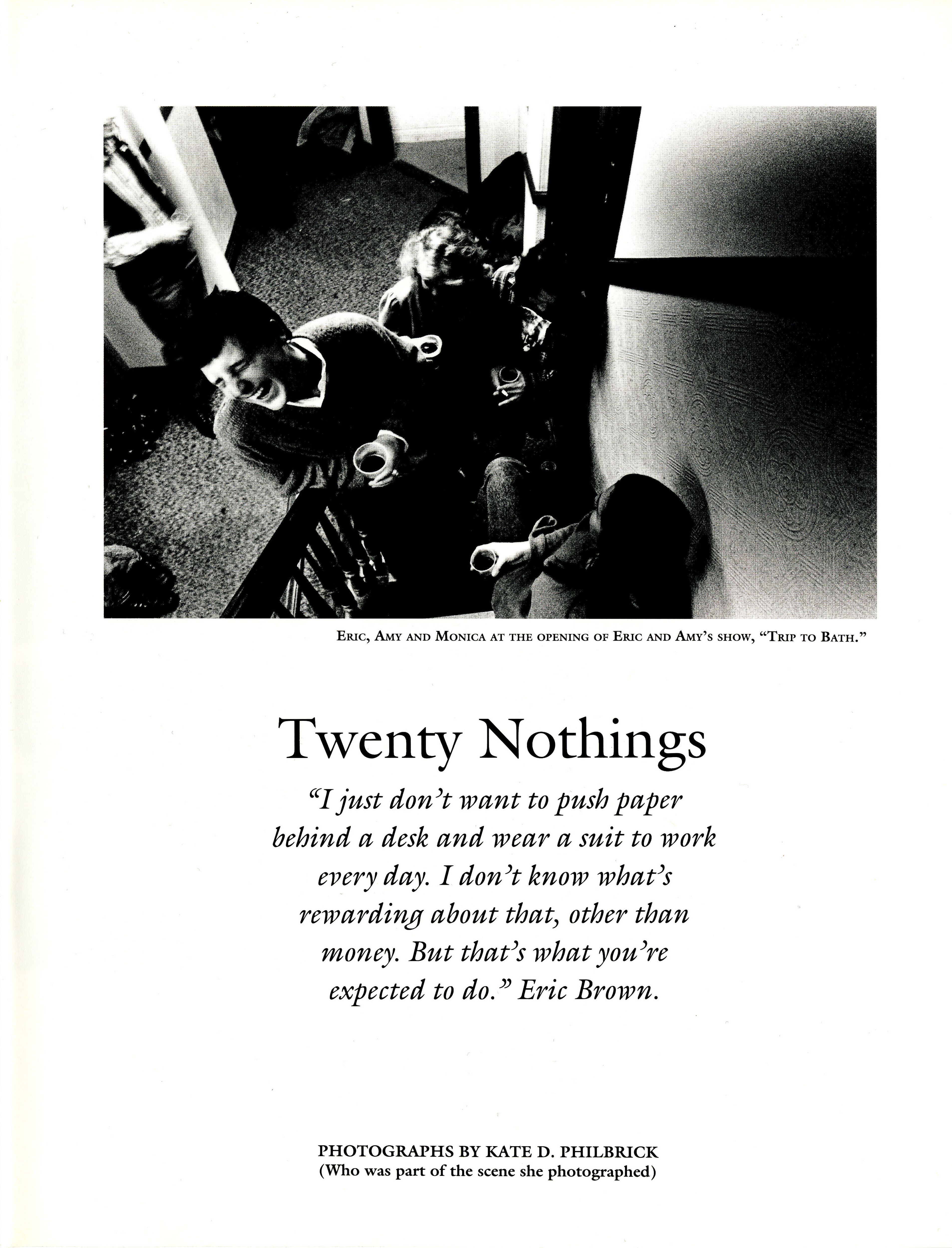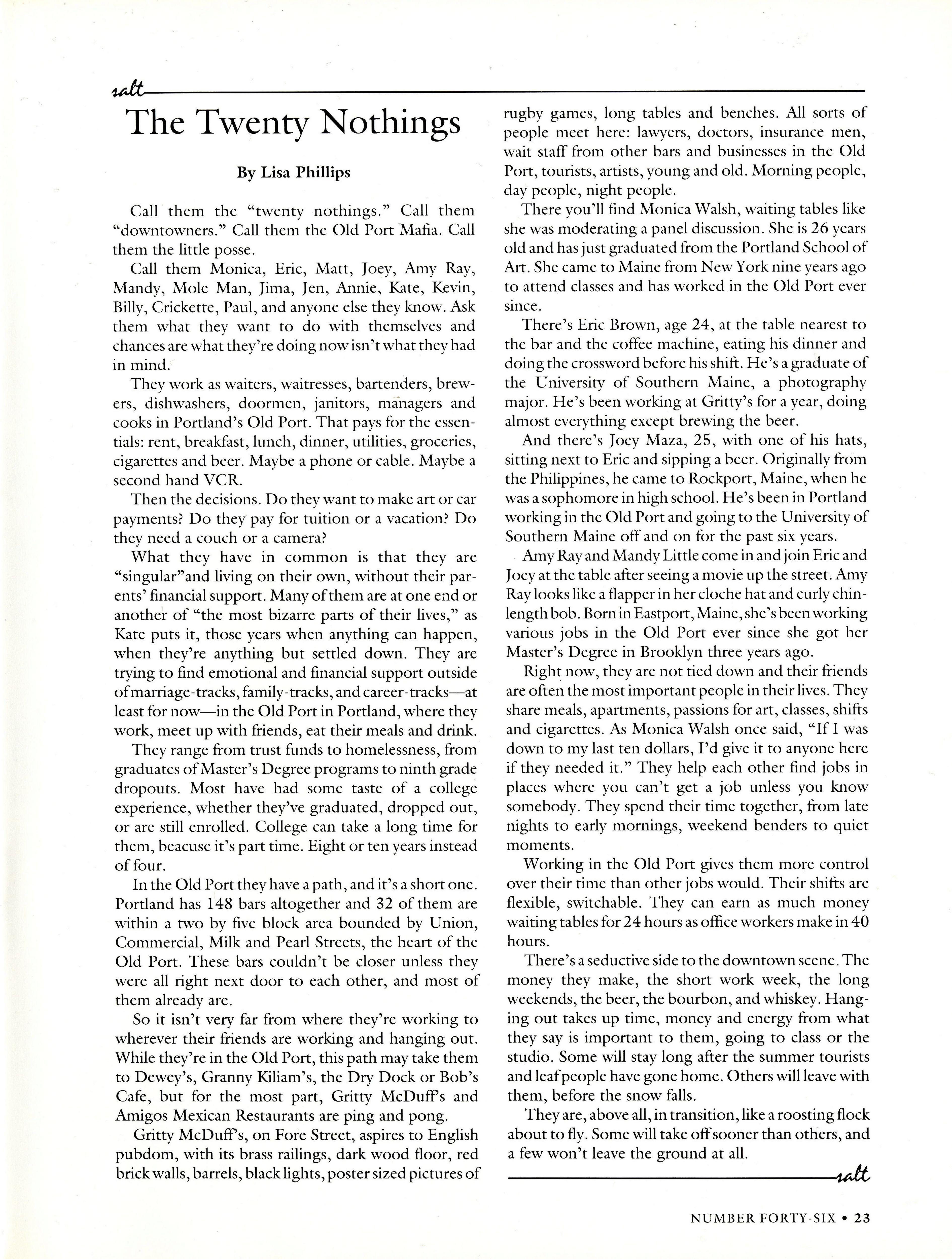 Employed in the the Old Port area of Portland are a group of waiters, waitresses, bartenders, brewers, dishwasers, janitors, managers and cooks who all share a common story. Lisa Phillips and Kate D. Philbrick capture how these individuals live on their own without the support of their families, and how they spend their time in the Old Port area.