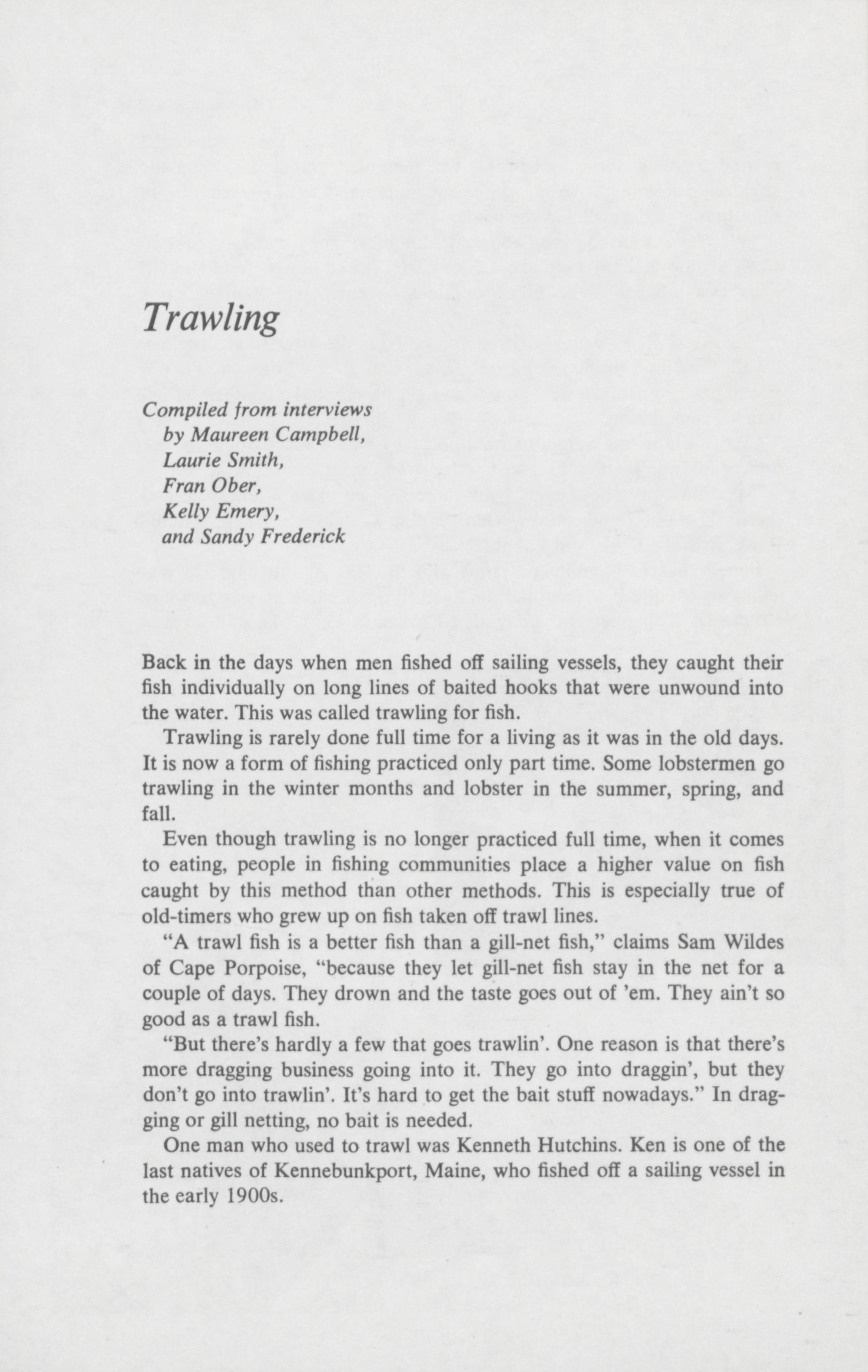 Although not in practice anymore, trawling is a fishing method that is highly valued by people in fishing communities. Maureen Campbell and others document how this fishing method was practiced and the experiences fishermen had while on the job.