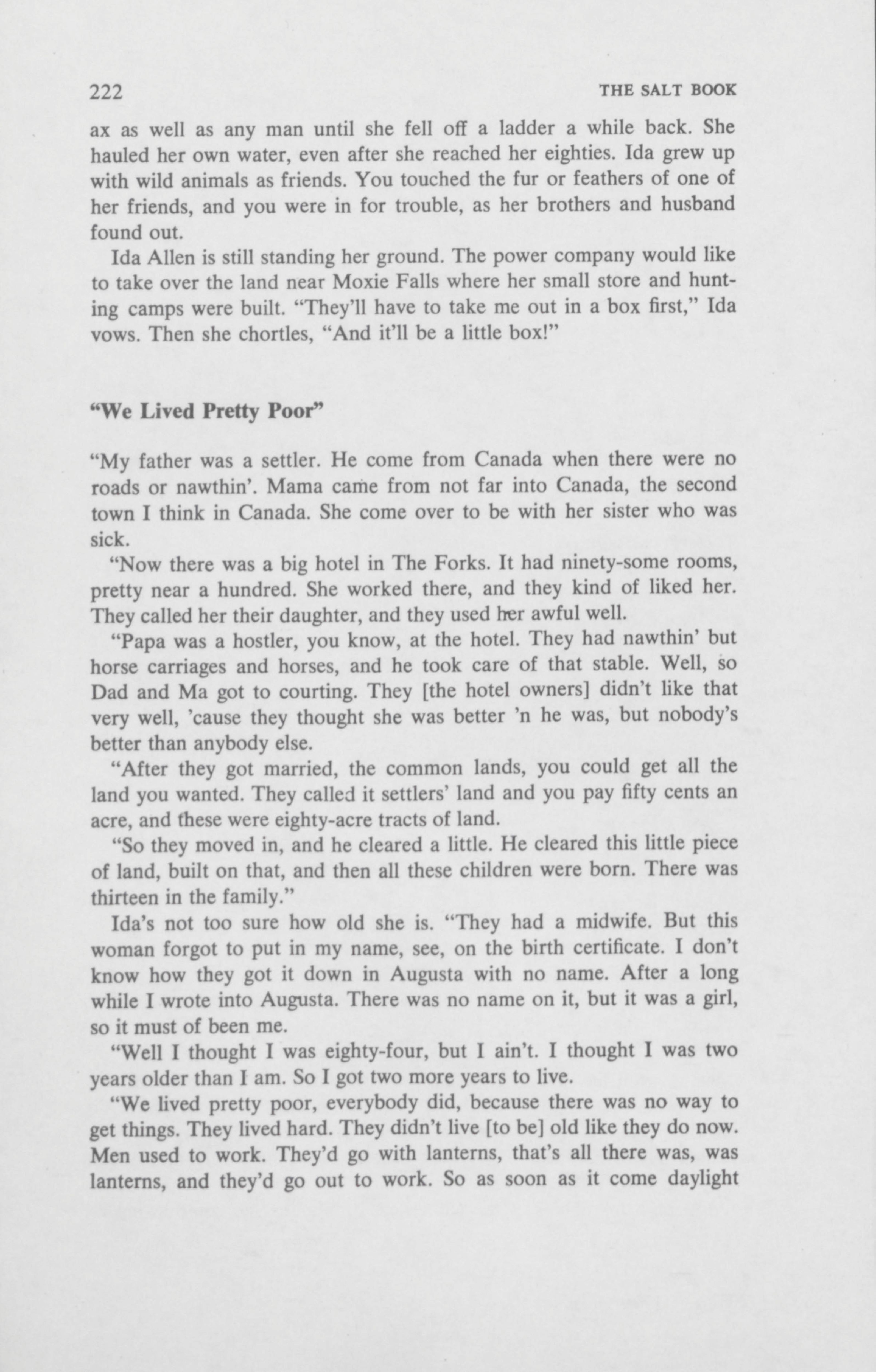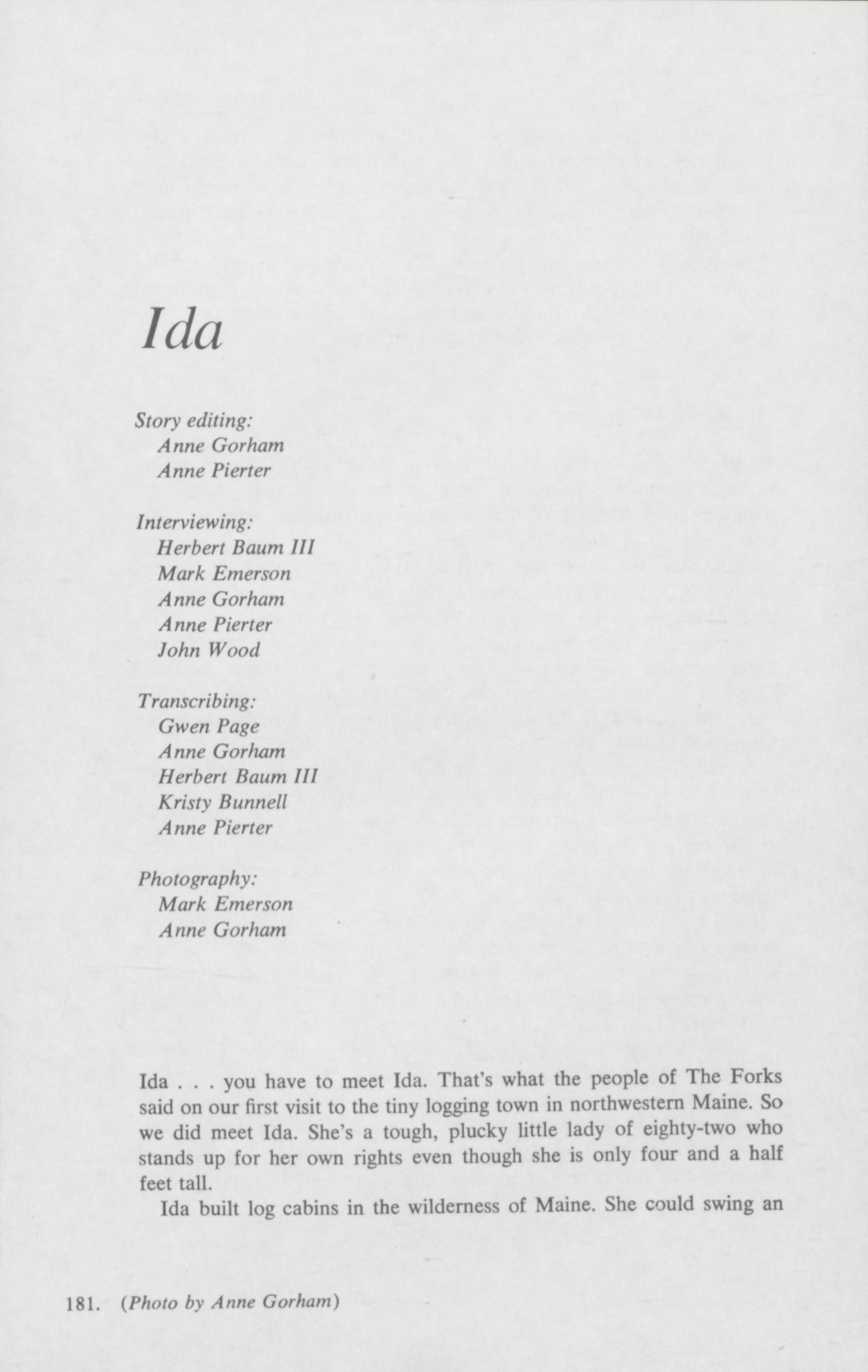 Standing at four and a half feet tall, Ida Allen can stand up for herself. Anne Gorham documents Allen's life as the daughter of a settler and growing up in the wilderness of Maine.