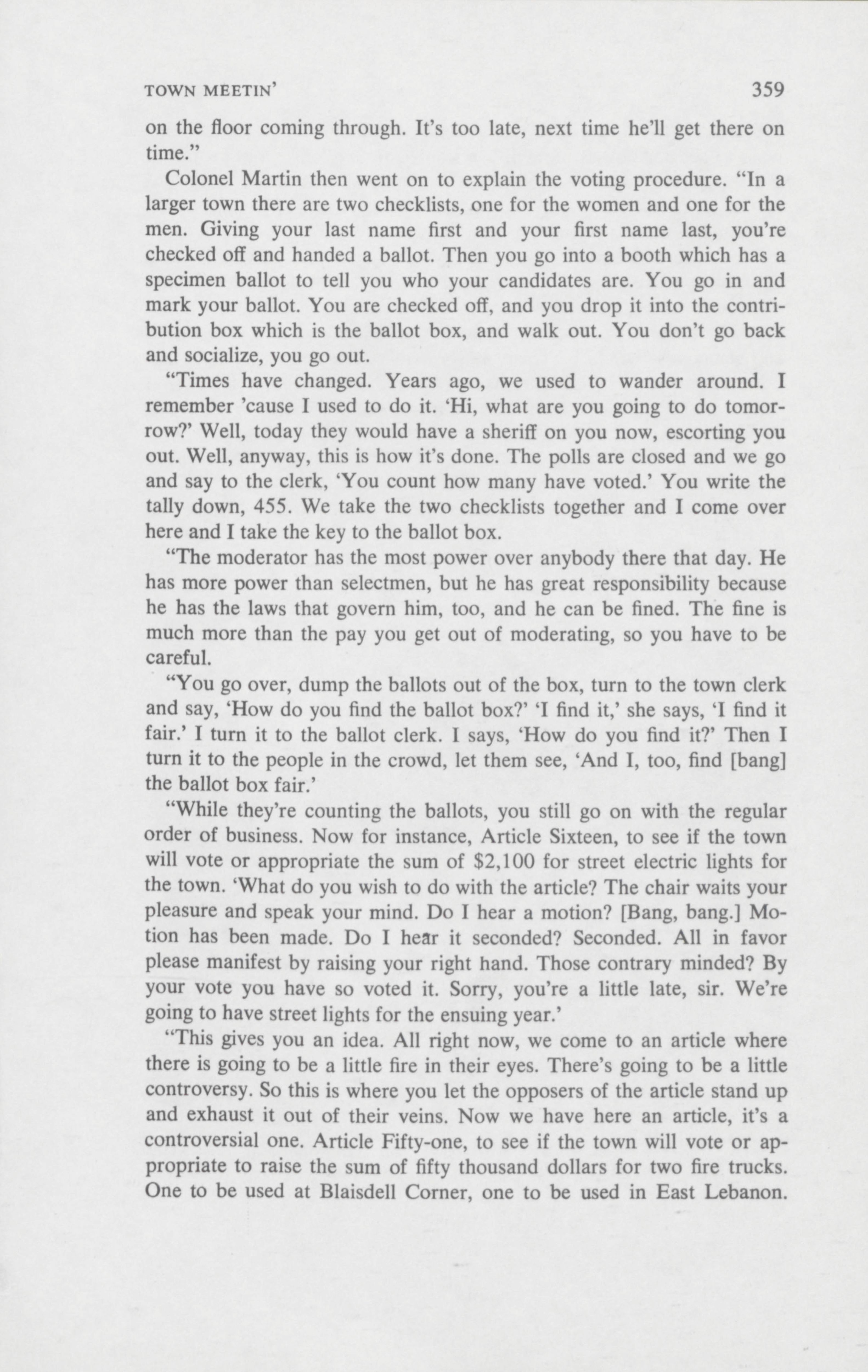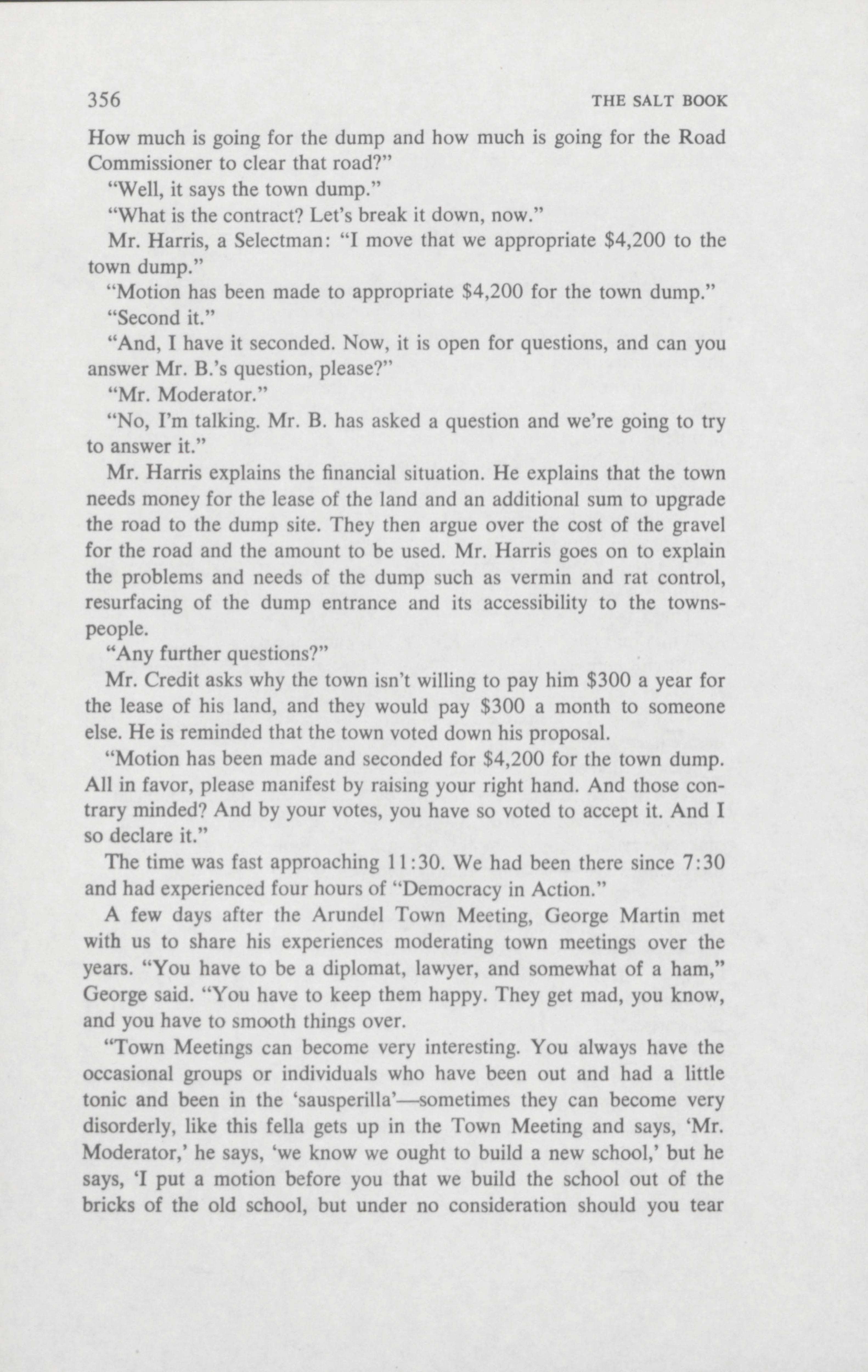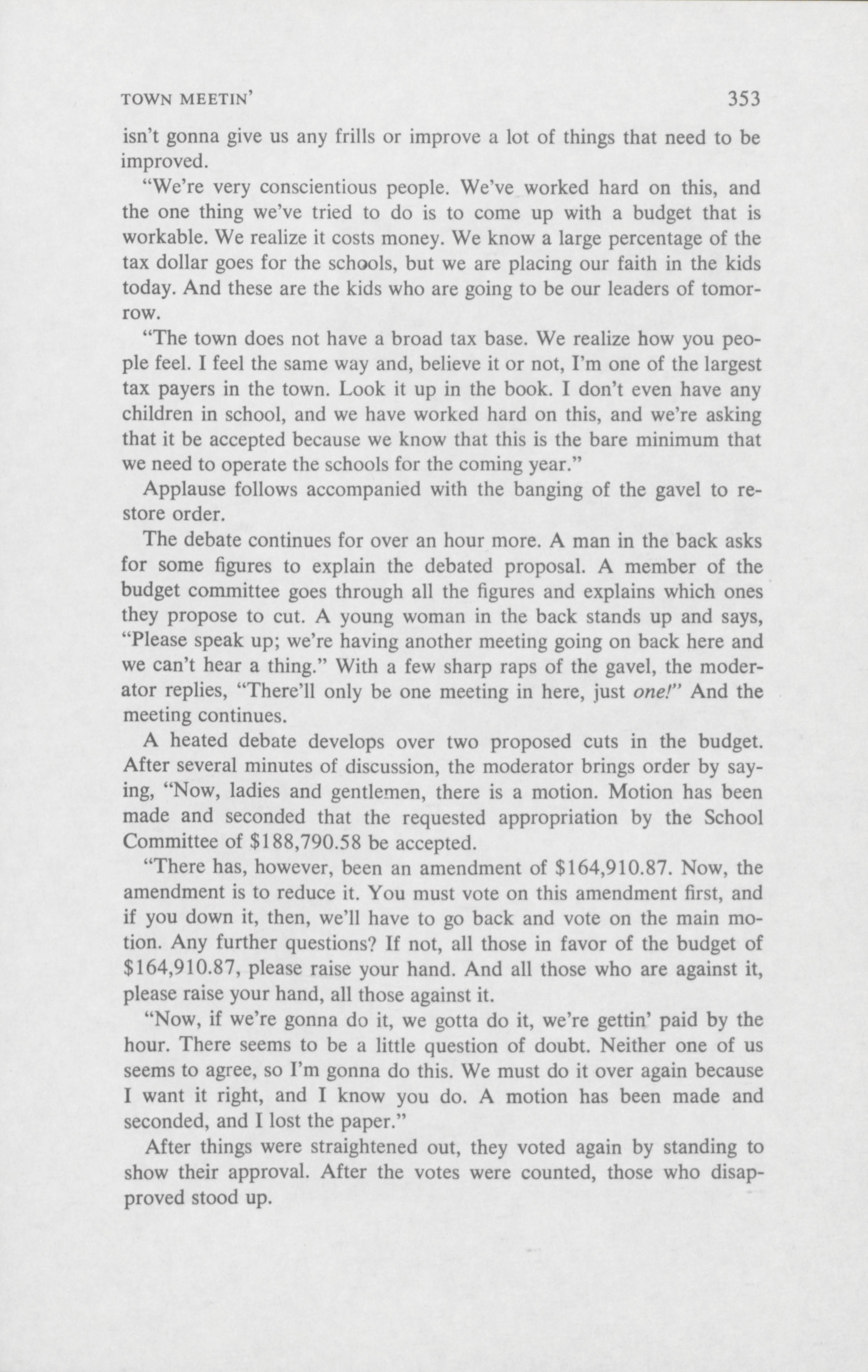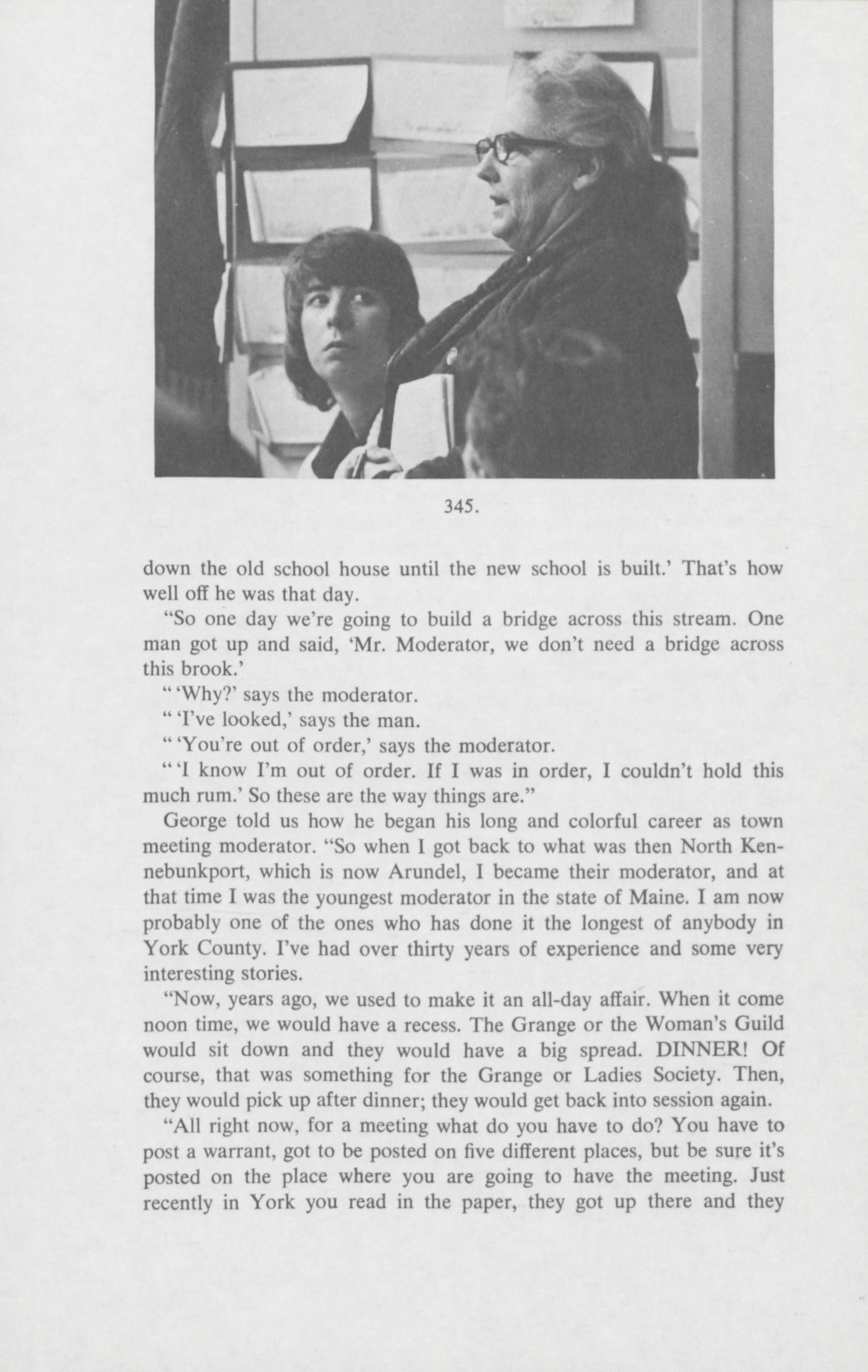 Heading to Arundel to hear old time democracy, Valerie Gould and Anne Pierter go to a town meeting. Gould and Pierter document the meeting and the issues that were discussed.