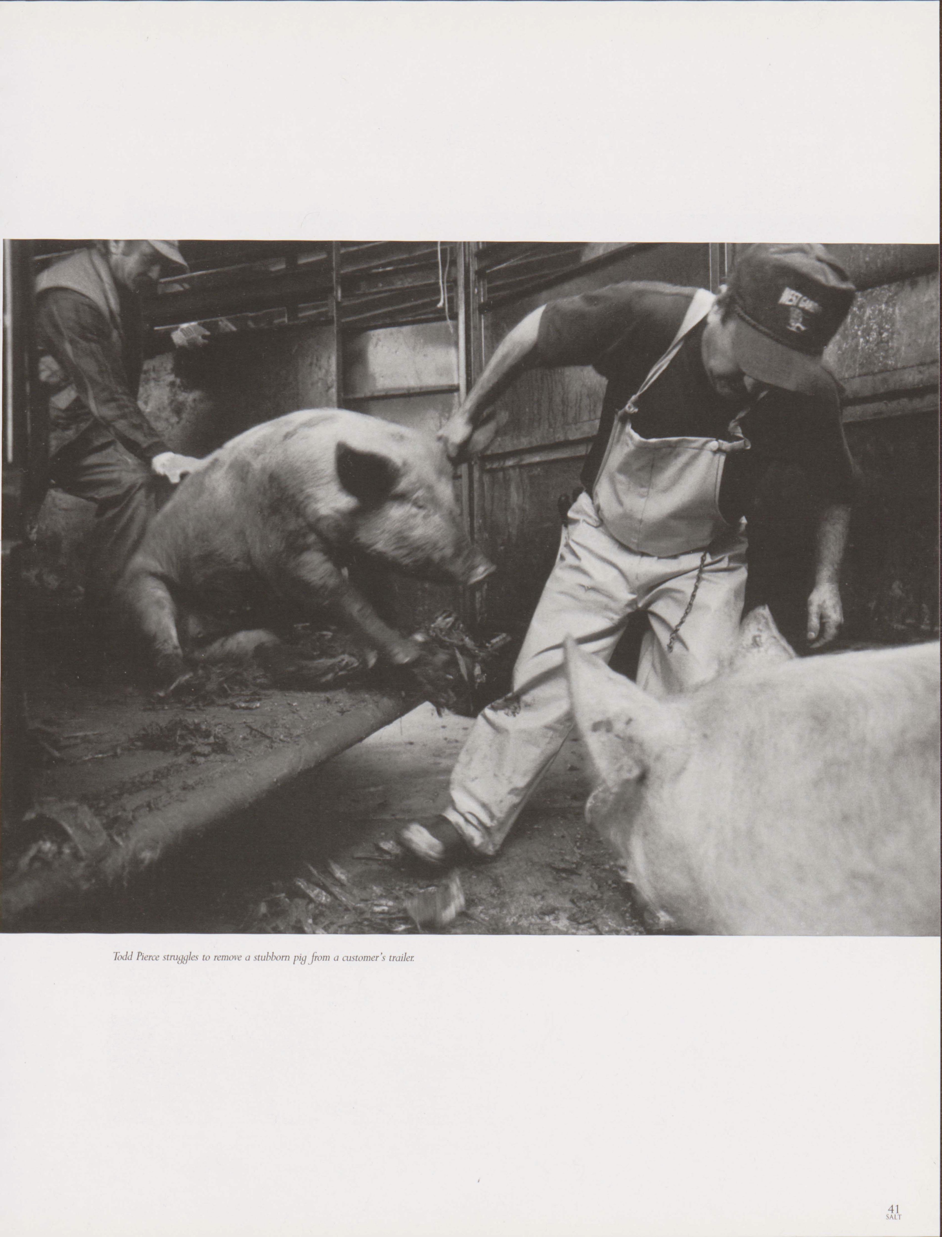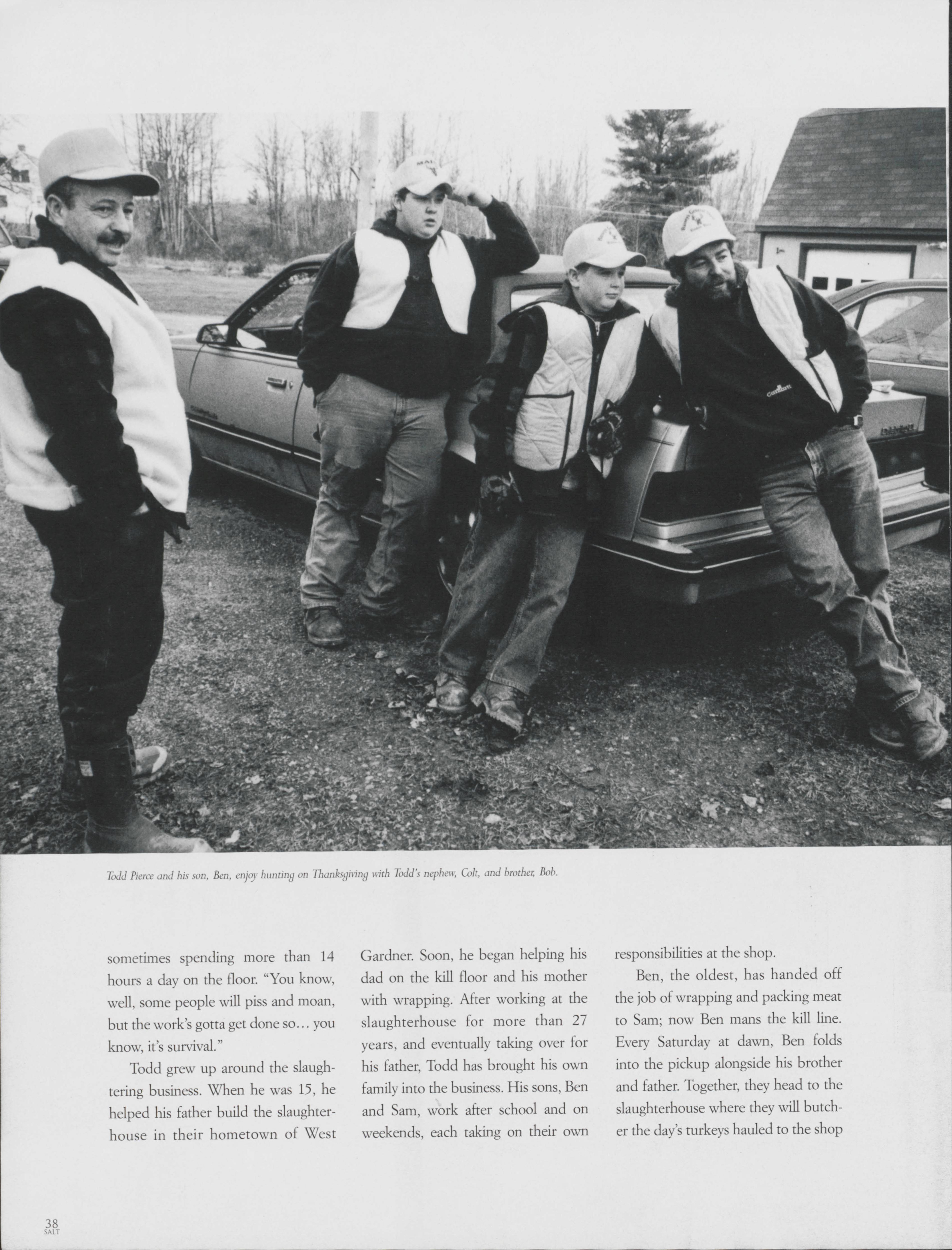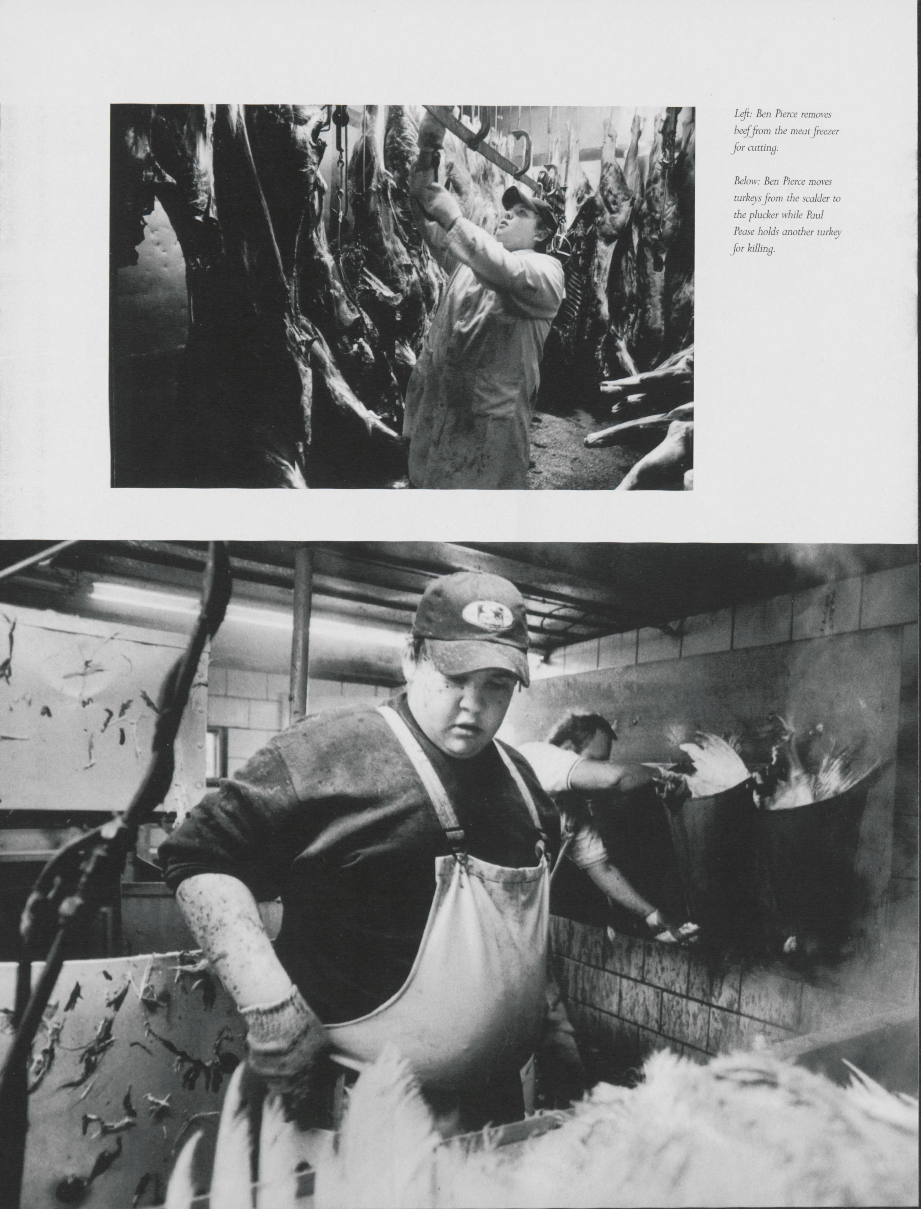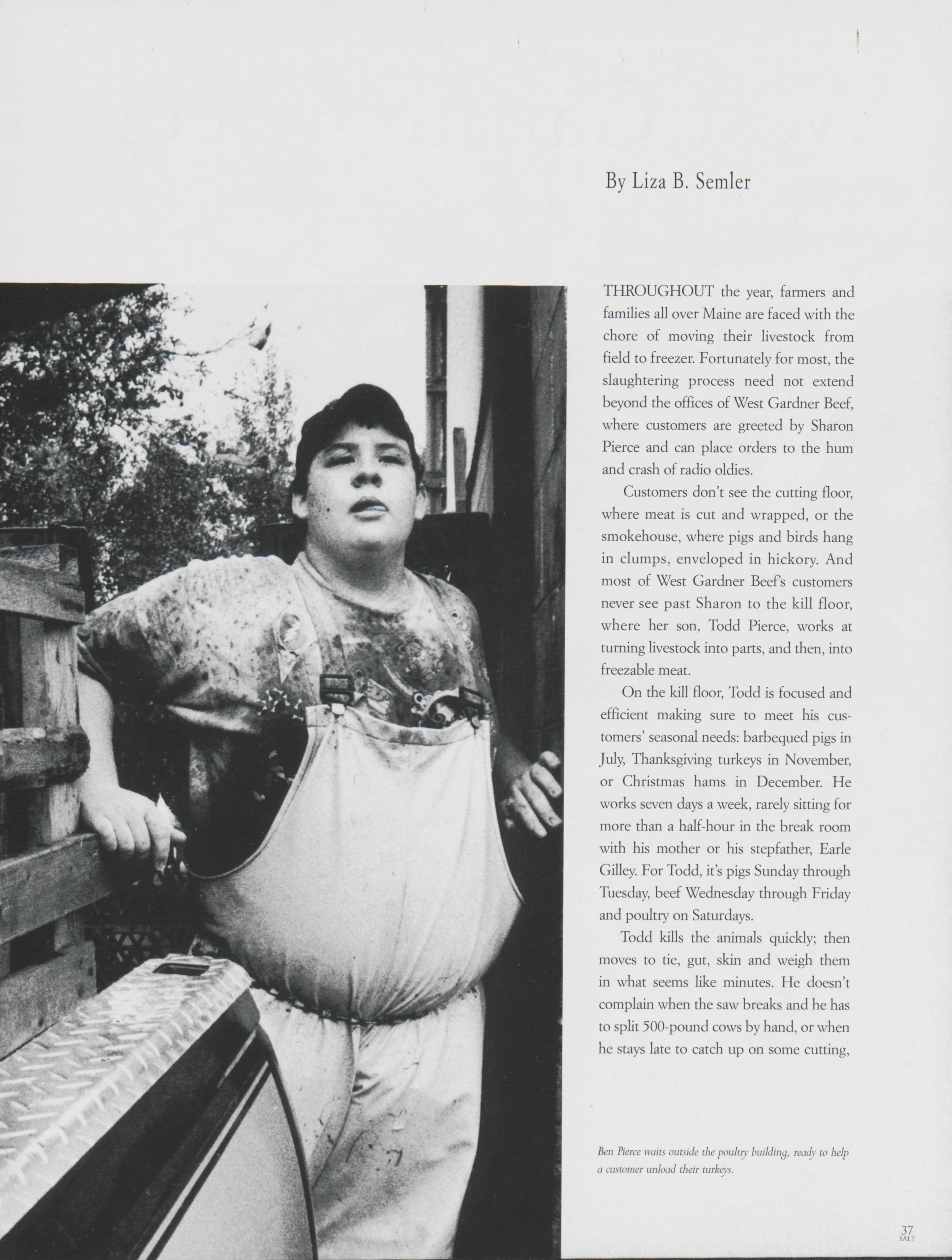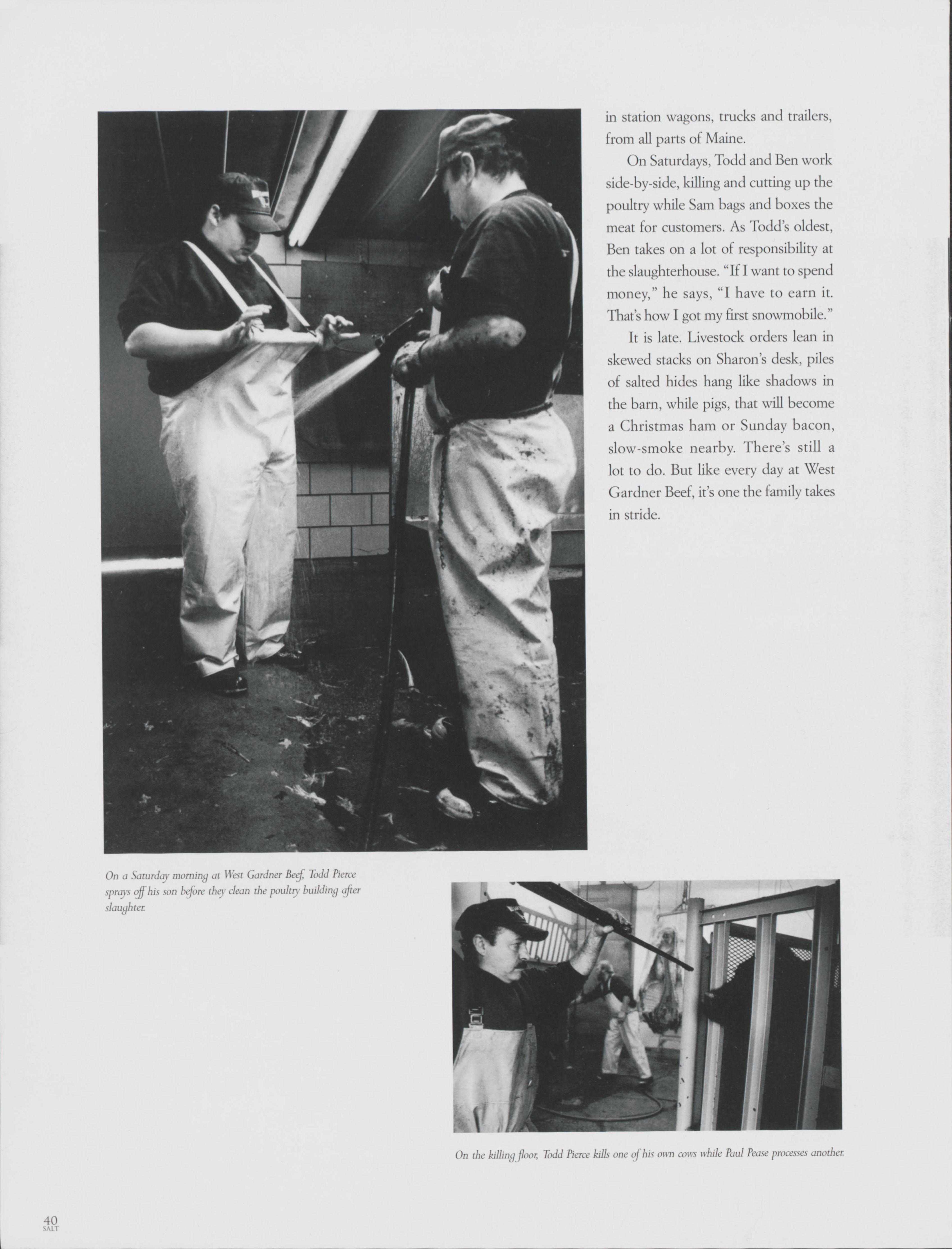 At the Pierce family farm in West Gardner, pigs, chickens, and cows are routinely slaughtered. Liza Semler captures the work the Pierce family does in their slaughterhouse.